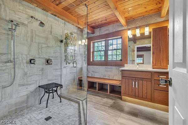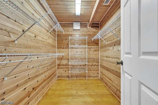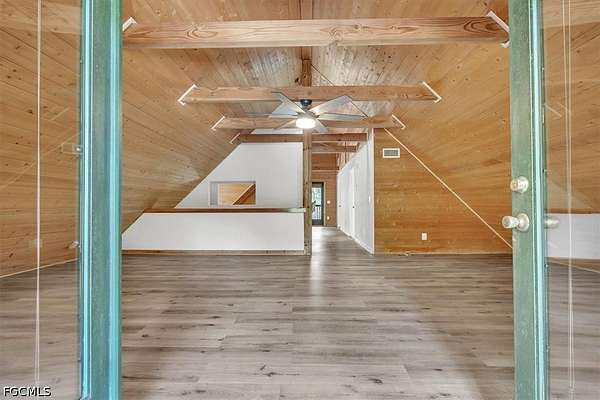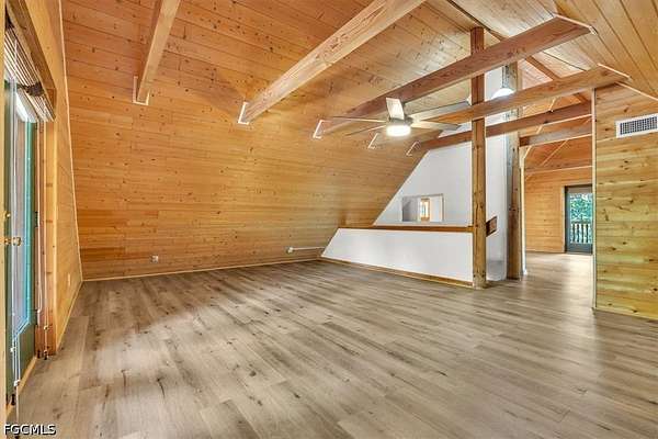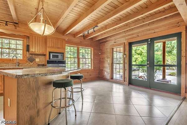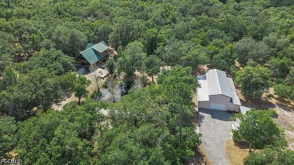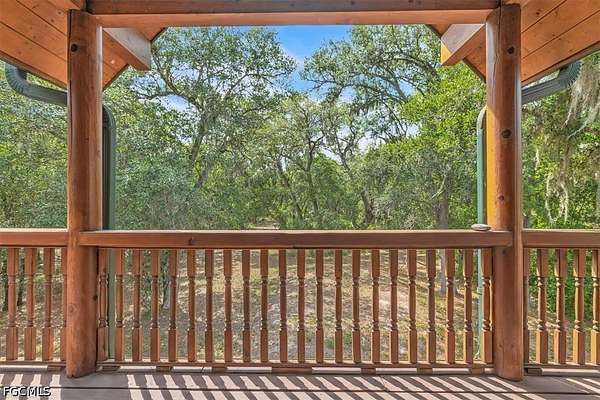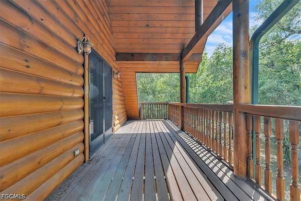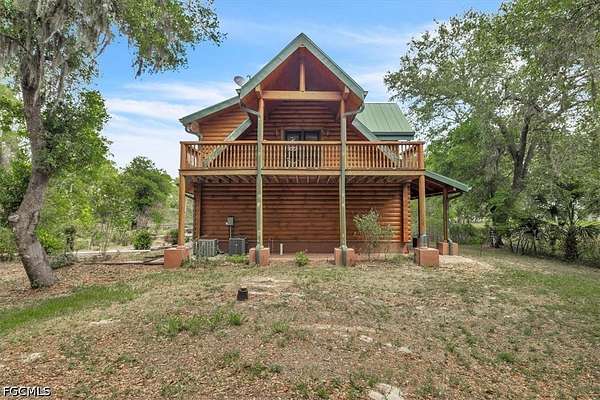 Tucked away on this beautiful wooded five acres, is a two-story 3 bedroom 2 full bath A-frame log cabin that offers a rare blend of rustic charm and refined finishes. Paired with an expansive 4,210 square foot barn that can be used for car enthusiasts or can be easily turned back to horse paddock, with additional outbuildings for ultimate versatility. Built in 2008, the home features an open-concept first floor where the living, dining, and kitchen areas flow seamlessly, showcasing true log-cabin craftsmanship. Exposed wood beams, soaring ceilings, natural wood flooring, and expansive windows fill the interior w abundant natural light, creating a cozy yet airy ambiance. The kitchen is a chef's dream, with custom wood cabinetry, elegant marble countertops, decorative tile backsplash, a gas cooktop, built-in convection oven, and a center island with bar seating-perfect for entertaining. The main level also offers 2 nice sized guest bedrooms with built-in closets, a custom full bathroom with a walk-in shower and marble-top vanity, and a conveniently located laundry room. Upstairs, a spacious loft-style family room opens to a charming screened front balcony overlooking the expansive front yard. The primary suite features a cedar walk-in closet, a private balcony with views of the backyard and natural landscape, and an updated spa-like bathroom with natural wood ceilings, exposed beams, a custom double vanity, and a large glass-enclosed walk-in shower with floor-to-ceiling tile and abundant natural light. Downstairs French doors open to the outdoor front patio, ideal for enjoying the peaceful, private surroundings. Directly outside is a large open patio for entertaining right next to a beautiful winding creek that leads to a stocked pond. Adding to the property's appeal, the 4,210 square-foot barn includes a small apartment w/full bath and multiple versatile rooms, while a detached building provides additional space for equipment. A gated front driveway first leads to the barn before reaching the home, offering exceptional privacy. This property perfectly blends the warmth and character of a log cabin with versatile outbuildings; Totally Fenced five acres. Nestled in Arcadia, it offers an ideal balance of privacy and convenience. Zoned A-10, the property provides the perfect setting to bring horses, raise livestock, or create your own hobby farm, with ample space for barns, paddocks, and outdoor activities. Just minutes from downtown Arcadia, you'll enjoy easy access to grocery shopping at Publix and Walmart, local favorites like Slim's Bar-B-Q and Brother's Fish House, and a variety of casual dining options. Families will appreciate nearby West Elementary, DeSoto Middle, and DeSoto County High School, while outdoor enthusiasts can explore Morgan Park, the Peace River, and local trails for boating, fishing, and picnicking. Craft your gorgeous private retreat and enjoy the freedom and flexibility this home allows.