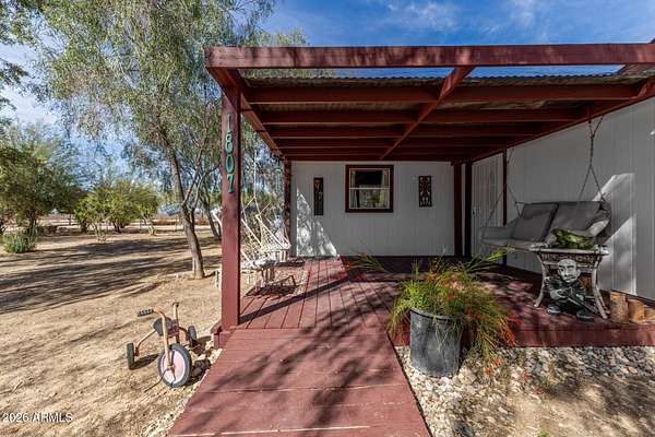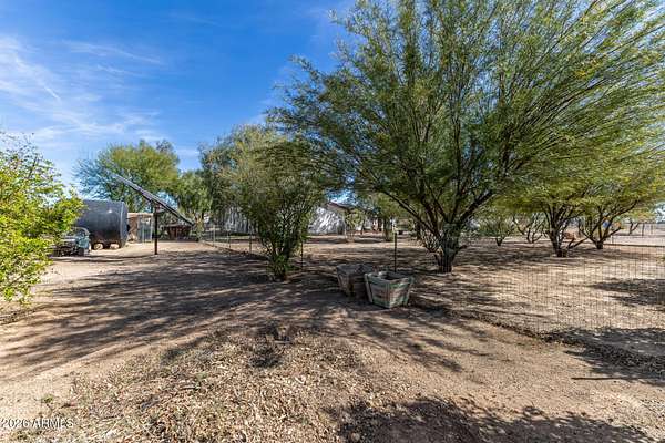 Just under 5 acres of usable land, this unique property offers space, flexibility, and rural charm. The owner has planted 150 trees throughout the lot, creating a growing private oasis with incredible potential. The main home has been refreshed with new interior and exterior paint, a new AC system, and new kitchen cabinetry (upper cabinets updated, lower cabinets original with Formica countertops). A welcoming new front porch adds character and a comfortable place to relax. The garage has been enclosed and includes storage cabinets (no electrical currently in the garage). Toward the back of the property sits a 2-bedroom, 1-bath guest house with water and power already in place. It will need septic connected and is not currently registered. There is also RV parking with hookups and septi Additional features include: Private well with water rights New AC in both the main home and guest house Chicken coops and farming infrastructure Horse corral Abundant space for animals, equipment, or agricultural use Please note: the property is slightly under 5 acres due to a previous .69-acre easement adjustment. With room to expand, farm, host animals, or create a multi-use homestead, this property offers rare acreage and opportunity.