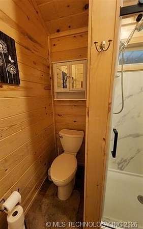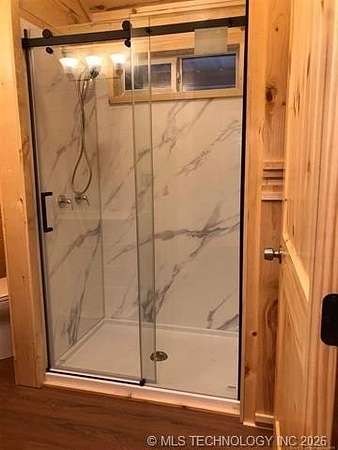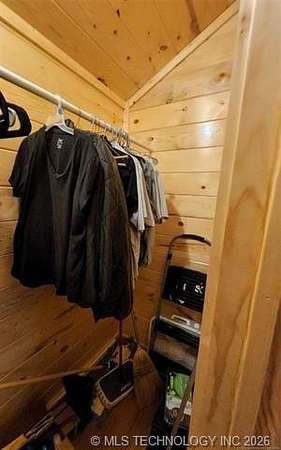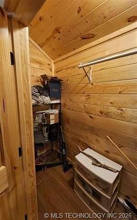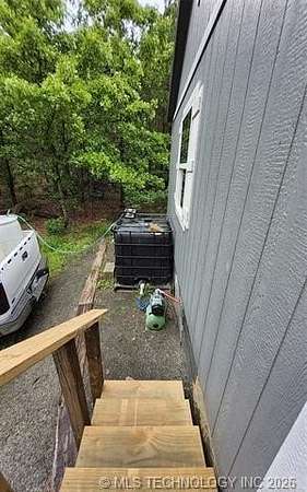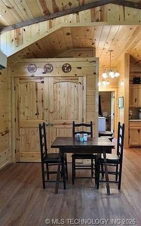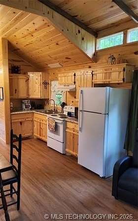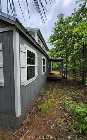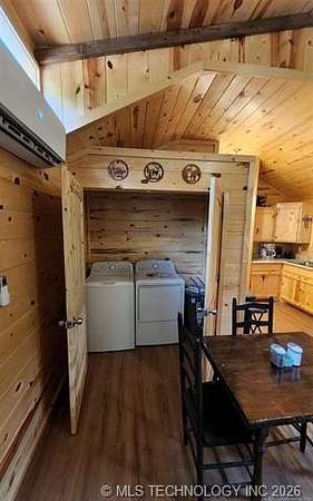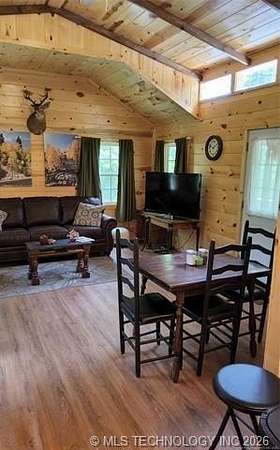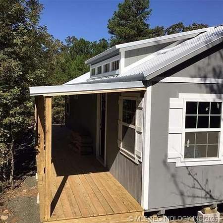 Looking for a getaway in the Kiamichi Wilderness near Moyers Ok? This is a place where you can relax and enjoy the peaceful sounds of nature, explore the mountainous terrain, rivers and creeks, rock formations, and meet some really nice people that had the same dream of stress relief in the great outdoors as you! This tiny cabin (640 sf) is total electric and fully furnished was custom built in 2022. All it needs is you and your suitcases. The exterior of the home has two covered porches to sit in your favorite chair, relax and enjoy the fresh mountain air. The interior of the cabin is finished with solid white pine and vaulted ceilings. The living room has a one ton mini split heat and air unit and a ceiling fan in addition dormer to allow more natural light. The bedroom is furnished with a queen bed but large enough to accommodate a king size bed. An oversized walk in closet completes the bedroom. The bathroom has a large walkin shower with a glass door and a large vanity. The living area is open concept including a full kitchen, dining area, and washer/dryer closet. All appliances are less than 3 years old. A refillable water tank that is plumbed into the home and all plumbing done with Pex. This water system is a plus in the wilderness. This is a great community to make memories with family and friends. There are many community events that you can be a part of, and meet the wilderness family and enjoy the outdoors while riding your ATV around throughout the Kiamichi Wilderness.
