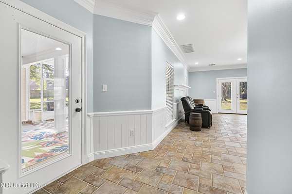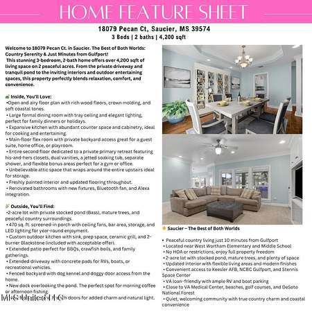 Welcome to 18079 Pecan Court, Saucier Where Country Serenity Meets Luxury Living Near The Grand Bear Golf Course Life at 18079 Pecan Court is the perfect balance of peace and prestige. Nestled on two serene acres surrounded by mature trees and a private stocked pond, this 4200 square foot Southern retreat offers a lifestyle that blends relaxation, refinement, and a touch of adventure. Mornings begin with coffee on the porch as the sun dances across the water. Afternoons invite you to stroll your private acreage, fish in your fully stocked pond, or head just minutes away to play a round at The Grand Bear Golf Course, South Mississippi's premier Jack Nicklaus designed course known for its championship fairways and timeless beauty. Inside, the home flows effortlessly between open, airy spaces designed for connection and comfort. From the grand dining room with elegant lighting and rich wood floors to the chef's kitchen ready for weekend gatherings, every detail has been curated to make entertaining easy and everyday life luxurious. Upstairs, the private primary suite feels like a boutique getaway with dual vanities, a jetted tub, and a flexible bonus room perfect for a gym or studio. Storage is never an issue, as the attic provides convenient and accessible storage space all around the second floor. Outdoors, the lifestyle continues with an extended screened-in patio featuring a tiki bar and plenty of room to entertain-perfect for summer cookouts, crawfish boils, or quiet nights under the stars. The metal roof, NO-flood-zone, High & Dry, location, and elevated setting help lower insurance costs while adding peace of mind. Located near West Wortham Elementary and Middle School, just 10 minutes from Gulfport, a short commute to Keesler Air Force Base and NCBC Gulfport, and approximately 40 minutes from Stennis Space Center, this home offers the ideal combination of convenience and tranquility. Properties offering this much space, acreage, and a private pond at this price are a rare find in the Gulfport area, making this one truly special. 18079 Pecan Court is more than a home. It is a lifestyle. A rare blend of southern charm, coastal ease, and country freedom, moments from The Grand Bear.