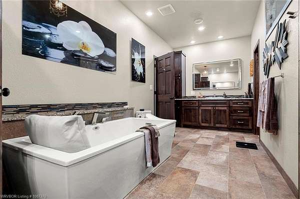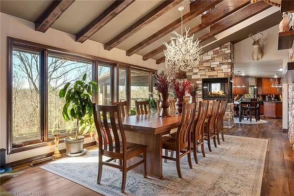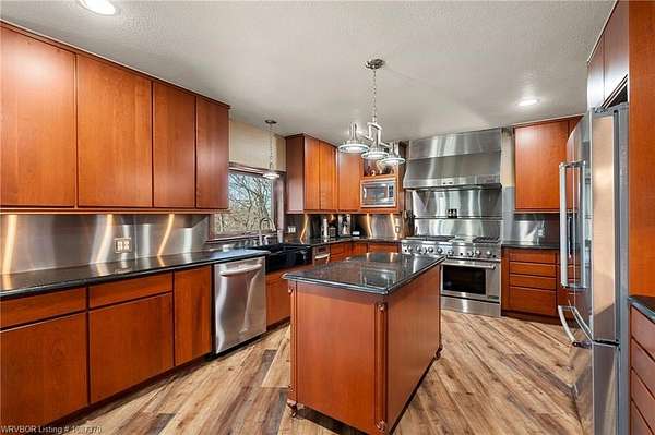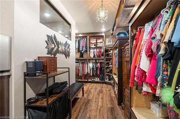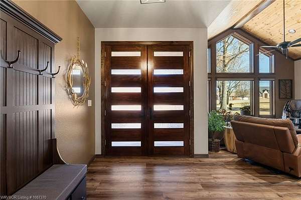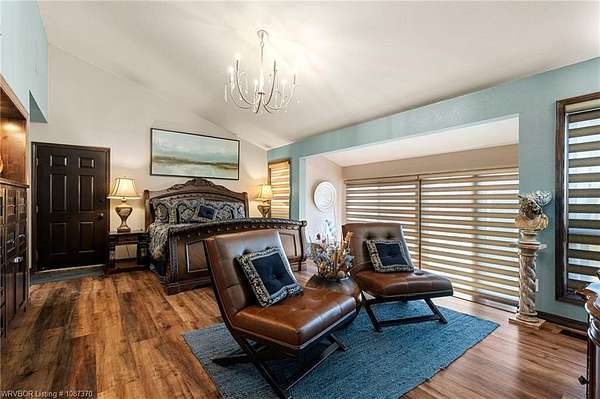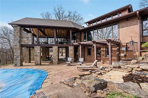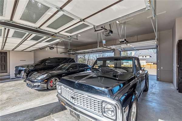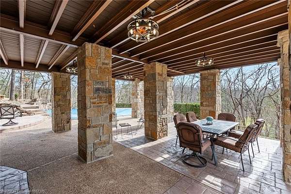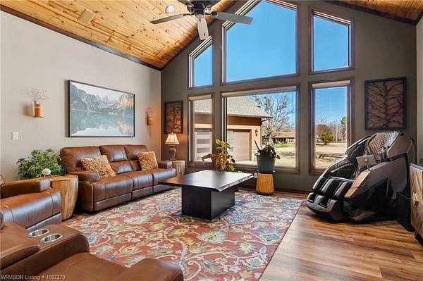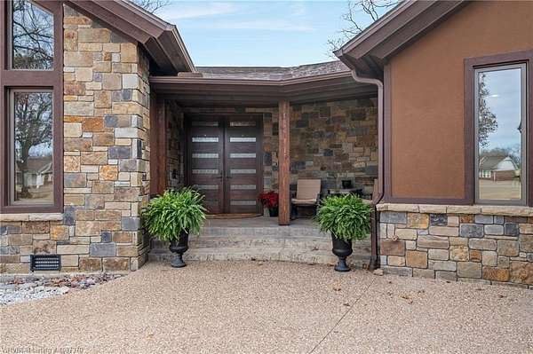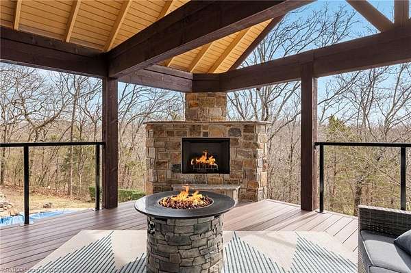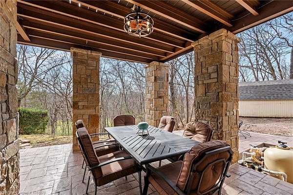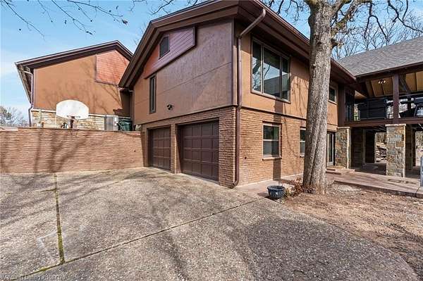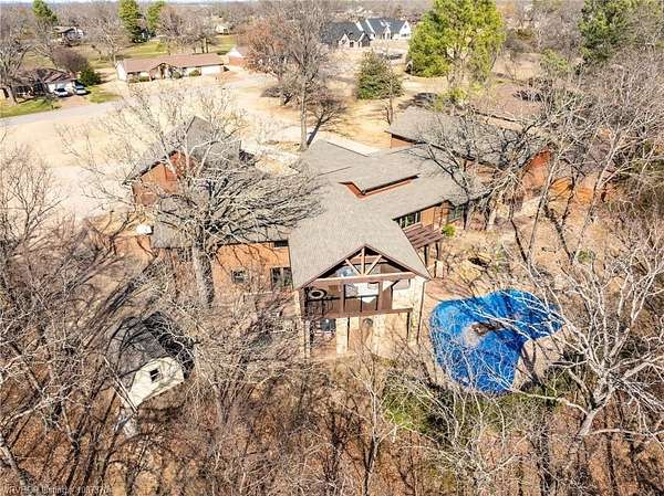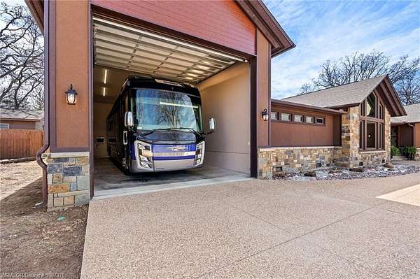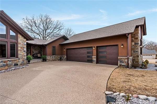 Breckenridge-inspired architecture meets Arkansas luxury in this unforgettable rock-and-cedar retreat, offering approx. 4,100 sq ft of interior living and 7,500+ sq ft under roof-a rare combination of statement design, smart-home convenience, resort-style outdoor living, and collector-level garage space. A sweeping circular aggregate driveway leads to a dramatic facade of stonework, warm cedar tones, and clean modern rooflines-mountain-lodge style that feels equally suited for quiet evenings and unforgettable gatherings. Inside, technology blends seamlessly with comfort: Control4 automation, Lutron smart switches, zoned whole-house audio, and voice-controlled Keego zebra shades deliver effortless "just tell Alexa" living. The chef's kitchen is a centerpiece of its own with a stainless 6+ burner Jenn-Air range, solid cherry cabinetry, and sleek black granite countertops. A stunning three-way gas fireplace anchors the kitchen and dining areas, creating an inviting flow for hosting. The primary suite is a true sanctuary-oversized with a sitting area and sun-filled nook ideal for plants or reading. The spa-inspired ensuite features a Jason Micro-silk Therapy soaking tub, walk-in shower, dual vanities, and a showpiece closet with pull-down racks, shoe turntables, and built-in shelving. Out back, the lifestyle continues: a rock-lined grotto pool, stone terraces, and a waterfall feature set a private resort tone. Entertain under the covered king-truss patio-steel framed and rock faced-with a gas fireplace and pre-plumbed outdoor kitchen capability. And for the enthusiast: garage space for 7+ vehicles, including a 50+ ft deep motor coach garage with a 14' automatic door, a 3-car pass-through garage with mudroom access, and a 2-car lower-level garage for projects and toys. Call your Realtor for a private tour and experience this one-of-a-kind property in person you will not be disappointed.