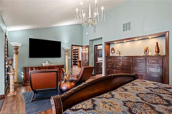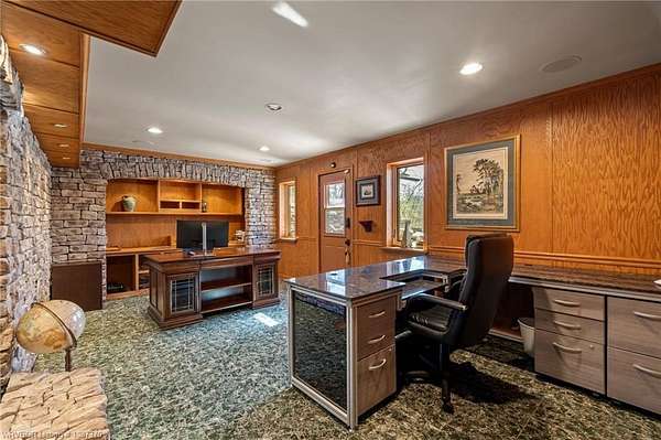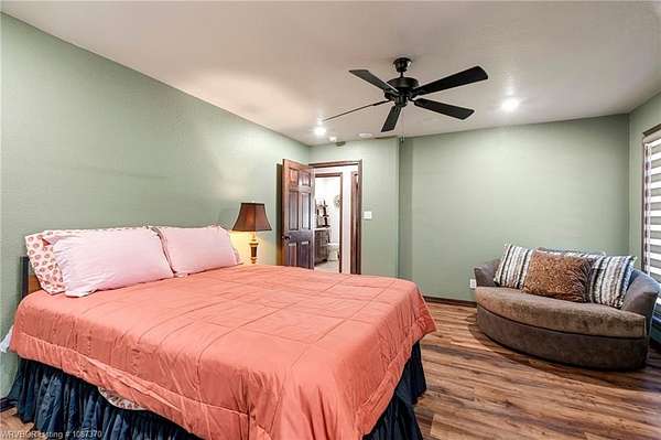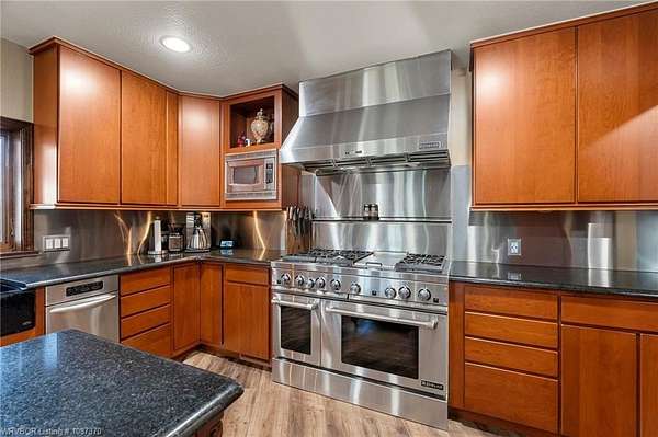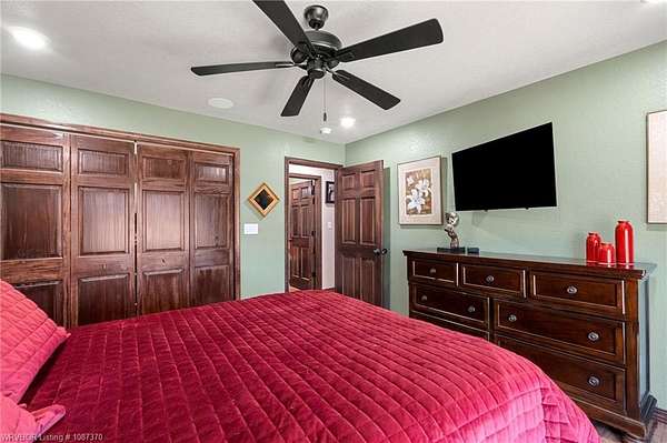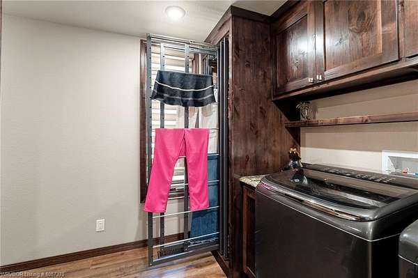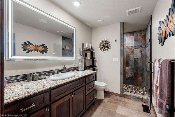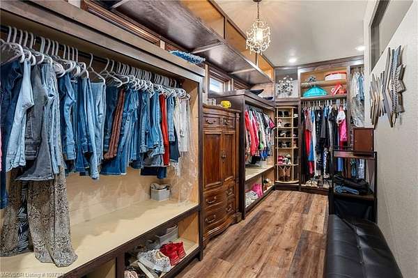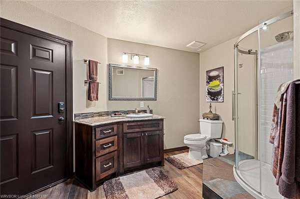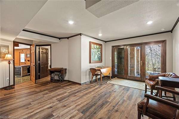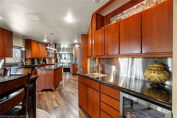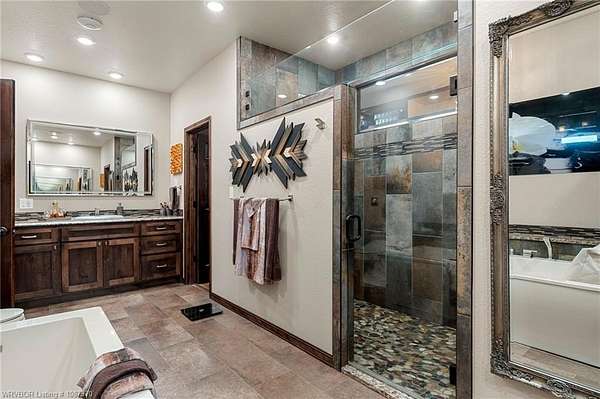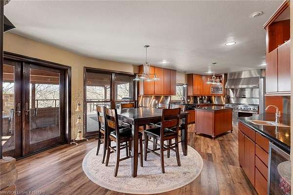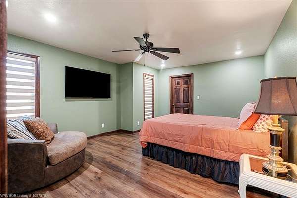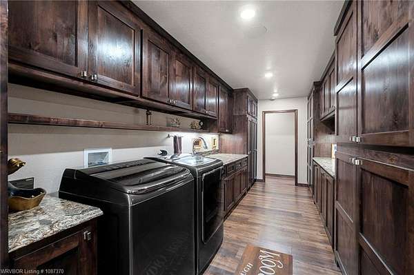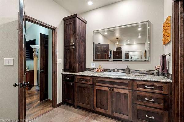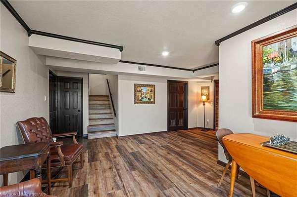 Breckenridge-inspired architecture meets Arkansas luxury in this unforgettable rock-and-cedar retreat, offering approx. 4,100 sq ft of interior living and 7,500+ sq ft under roof-a rare combination of statement design, smart-home convenience, resort-style outdoor living, and collector-level garage space. A sweeping circular aggregate driveway leads to a dramatic facade of stonework, warm cedar tones, and clean modern rooflines-mountain-lodge style that feels equally suited for quiet evenings and unforgettable gatherings. Inside, technology blends seamlessly with comfort: Control4 automation, Lutron smart switches, zoned whole-house audio, and voice-controlled Keego zebra shades deliver effortless "just tell Alexa" living. The chef's kitchen is a centerpiece of its own with a stainless 6+ burner Jenn-Air range, solid cherry cabinetry, and sleek black granite countertops. A stunning three-way gas fireplace anchors the kitchen and dining areas, creating an inviting flow for hosting. The primary suite is a true sanctuary-oversized with a sitting area and sun-filled nook ideal for plants or reading. The spa-inspired ensuite features a Jason Micro-silk Therapy soaking tub, walk-in shower, dual vanities, and a showpiece closet with pull-down racks, shoe turntables, and built-in shelving. Out back, the lifestyle continues: a rock-lined grotto pool, stone terraces, and a waterfall feature set a private resort tone. Entertain under the covered king-truss patio-steel framed and rock faced-with a gas fireplace and pre-plumbed outdoor kitchen capability. And for the enthusiast: garage space for 7+ vehicles, including a 50+ ft deep motor coach garage with a 14' automatic door, a 3-car pass-through garage with mudroom access, and a 2-car lower-level garage for projects and toys. Call your Realtor for a private tour and experience this one-of-a-kind property in person you will not be disappointed.