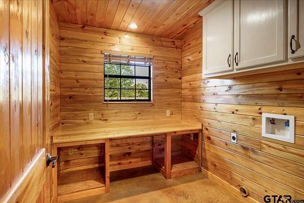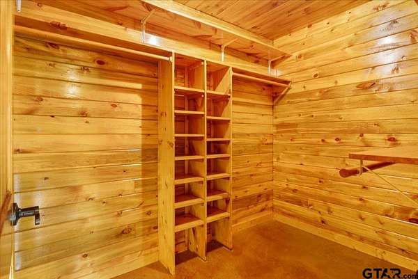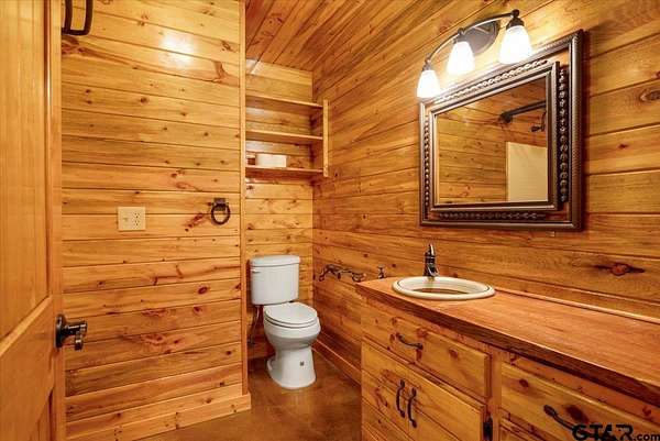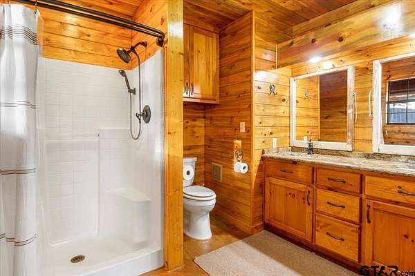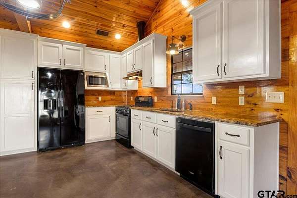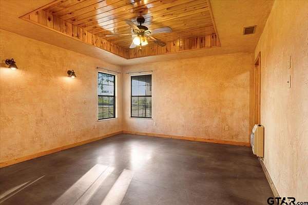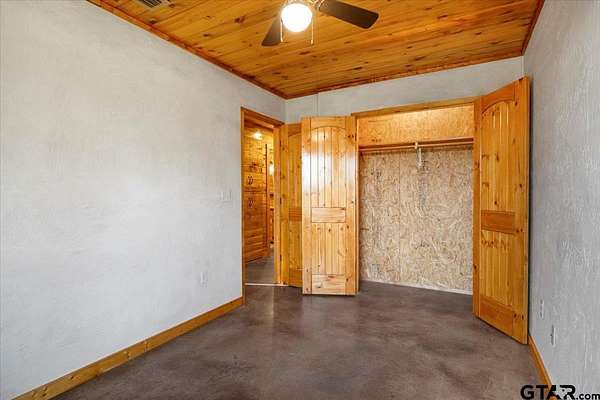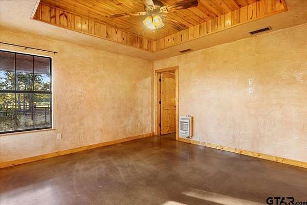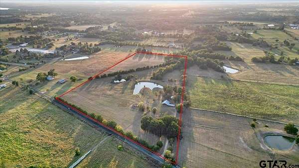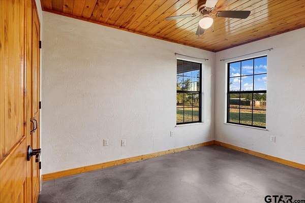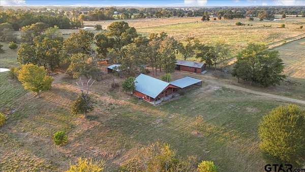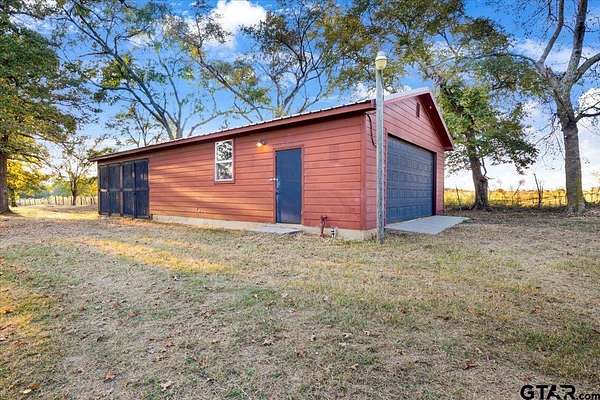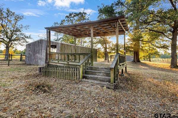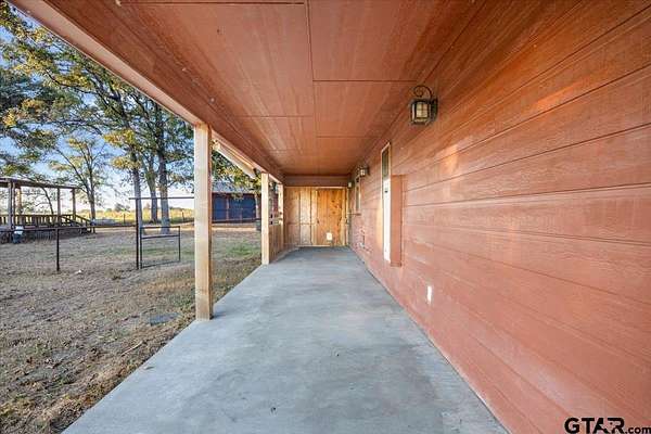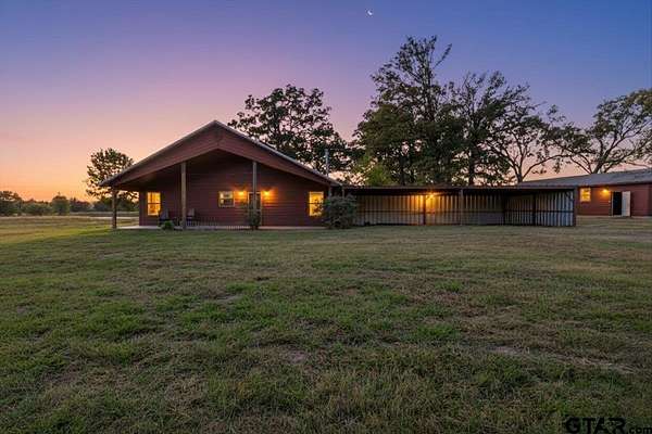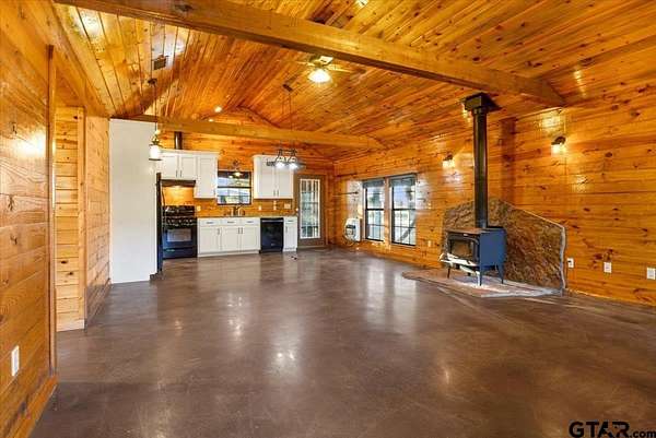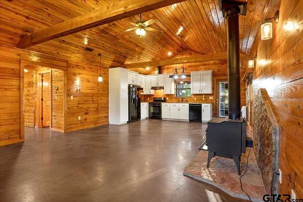 Charming East Texas ranchette on 28 acres, just minutes from town! This 2-bedroom, 2-bath home features solid wood interior walls, vaulted ceilings, and stained concrete floors throughout. The kitchen offers granite countertops and a gas cooktop, and the cozy wood-burning stove adds rustic warmth. Enjoy large, covered porches front and back, both with gas hookups for outdoor cooking. The property includes two ponds one with solar aeration, a floating pier, and stocked with black crappie, copper nose bluegill, and red-eared sun perch. Additional features include a 24x52 shop with electric door, 24x32 horse barn, chicken coop, RV hookup and solar-powered entry gate. Ag exemption in place. Quiet, peaceful East Texas living at its best come see to appreciate!