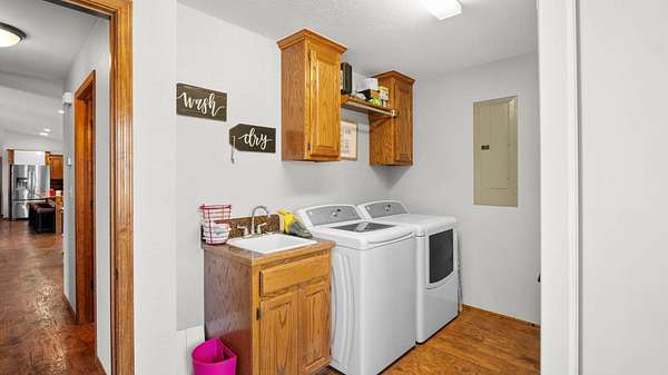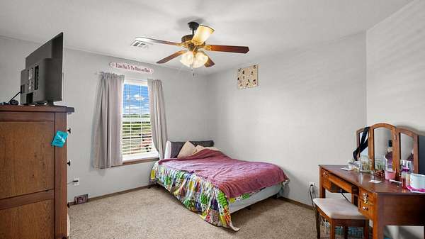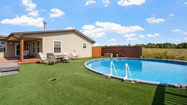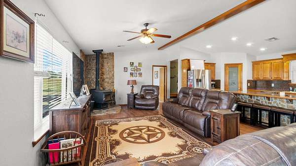 BACK ON THE MARKET due to buyers financing! This stunning 4-bedroom, 3-bath home offers a wide area of living space and was thoughtfully designed for both comfort and functionality. Built in 2014, the property blends rural charm with modern conveniences, making it a perfect retreat just minutes from Stratford and a short drive to I-35. Inside, you'll find a spacious open floor plan featuring a large living room, dining area, and kitchen designed for entertaining. A wood-burning stove adds warmth and character, while the kitchen comes fully equipped with all appliances, including a washer and dryer. The home's durable metal roof and frame construction provide long-lasting quality and peace of mind. This property is packed with extras that set it apart. Paid-off solar panels keep utility costs low while offering energy efficiency and sustainability. A shop with electricity provides the perfect space for hobbies, storage, or business needs. Step outside to enjoy 8.64 acres of fully fenced land, complete with a revamped pond, ideal for fishing, livestock, or simply relaxing by the water. The acreage offers plenty of room for animals, gardening, or outdoor recreation, all in a private and peaceful setting. With its combination of modern upgrades, energy efficiency, and wide-open space, this home is a rare opportunity to enjoy true country living without sacrificing convenience.
