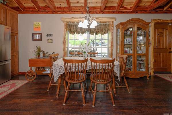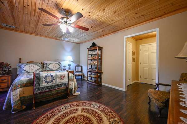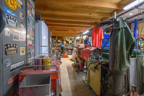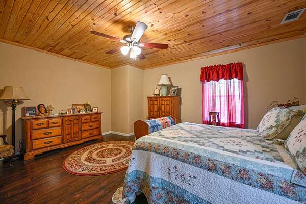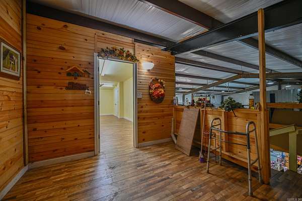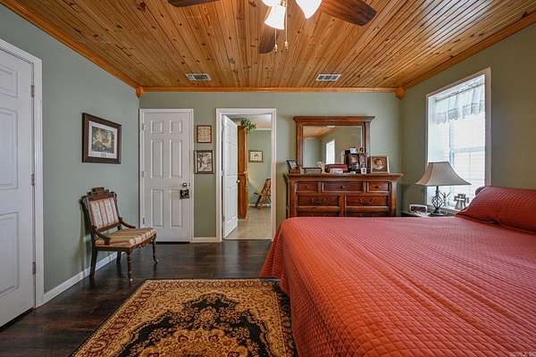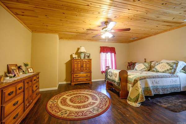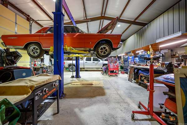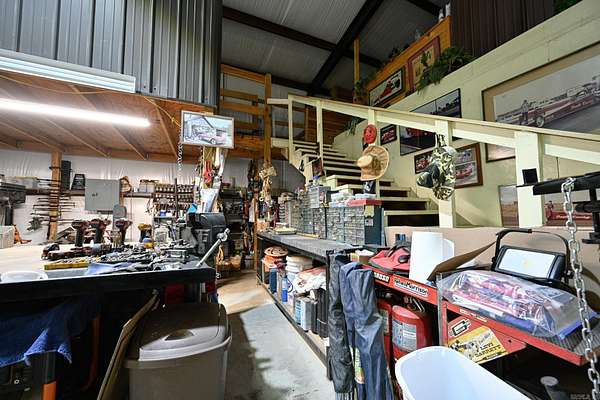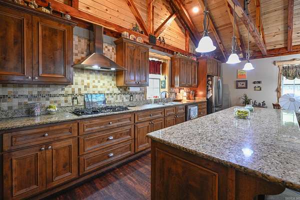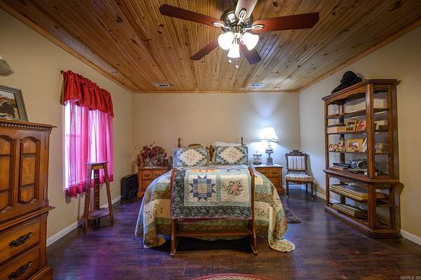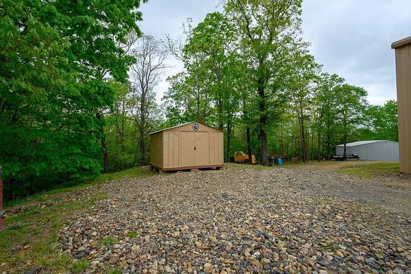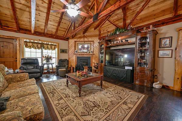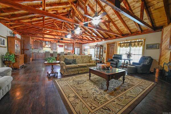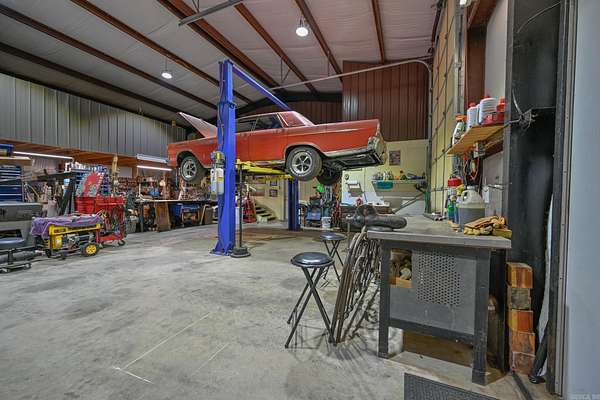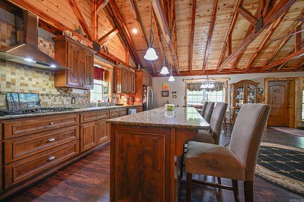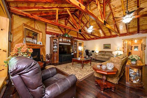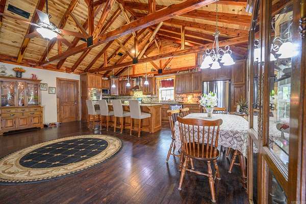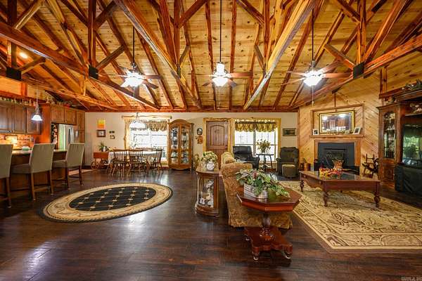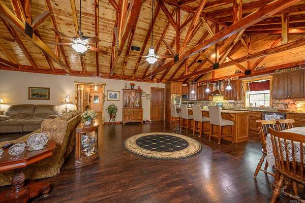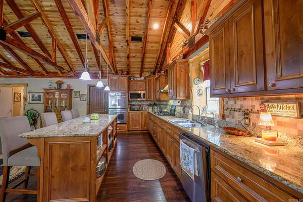 Masterfully crafted Barndo with 2 IMPRESSIVE SHOP buildings in the heart of Board Camp! The open floor plan living space is outfitted with high cedar vaulted ceilings, luxury vinyl flooring, live cedar edge trim and a focal wood fireplace (with blower) that easily warms the entire house! The beautiful chef’s kitchen includes custom cabinetry, double electric ovens, and gas stove, granite countertops, a 9 ft island and a huge PANTRY! The primary suite includes a walk-in closet and an accessible bathroom with a custom vanity, double sinks and a dressing table! The second bedroom also has a walk-in closet and both bedrooms are SPACIOUS! The attached 40x50 shop is ideal for ATV or car lovers. Wired for 220volt It features 2 double garage doors as well as an upstairs with a bonus room and tons of storage space! The 2nd shop sits behind the main house and is 30x50. Additional features include a 35x40 carport, and a covered front “porch”. This is a special property in a prime location!
