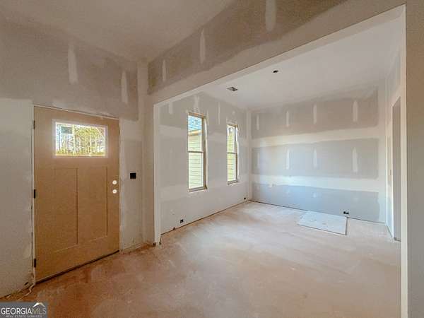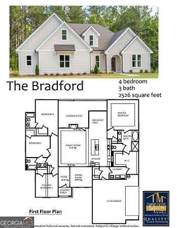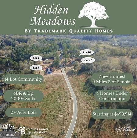 Trademark Quality Homes presents "The Bradford" on over 2 acres, this beautifully designed 4-bedroom, 3-bath ranch offers open-concept living, a split-bedroom layout, and thoughtfully selected finishes throughout. The gourmet kitchen features a large island, quartz countertops, stainless steel appliances, a walk-in pantry, and a separate breakfast area, all overlooking the family room - ideal for both everyday living and entertaining. The private owner's suite with tray ceilings, bath including double vanities, a tiled shower, soaking tub, and a spacious walk-in closet that conveniently connects to the laundry room. Three additional bedrooms and full baths are situated on the opposite side of the home, providing privacy and flexibility. Enjoy the covered back patio overlooking views of the wooded backyard - the perfect place for morning coffee or evening relaxation. This home blends comfort, privacy, and timeless style in a truly special setting. 13 minutes from downtown Senoia. Completion April/May 2026.