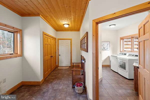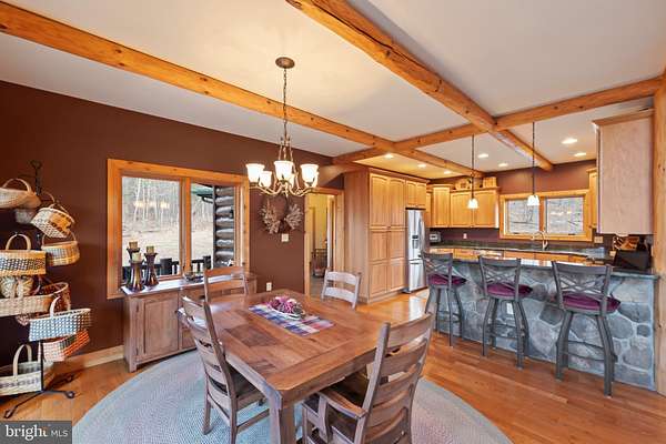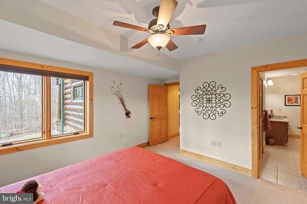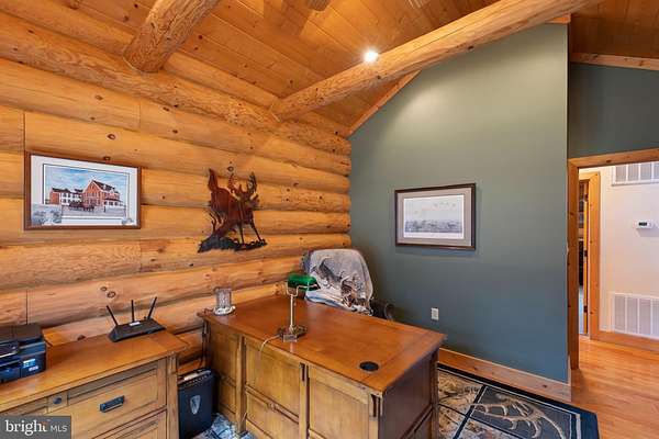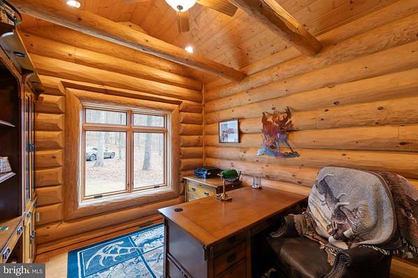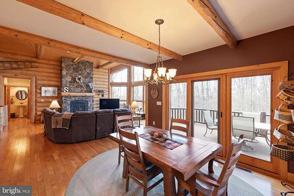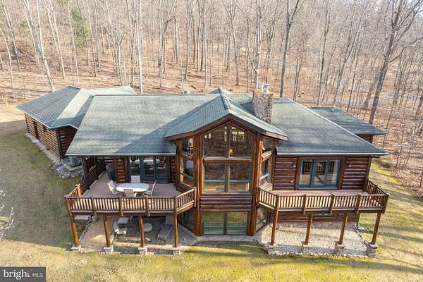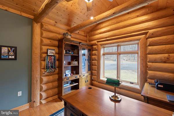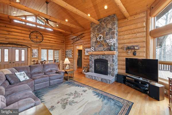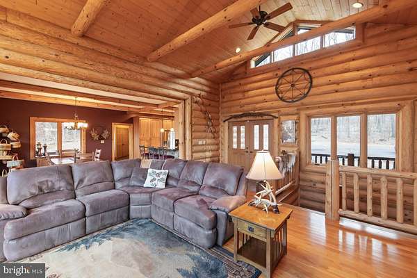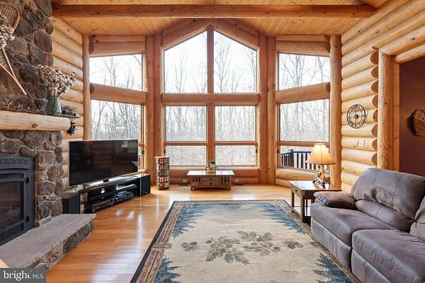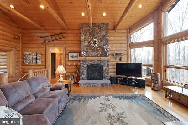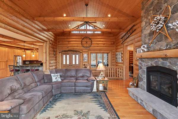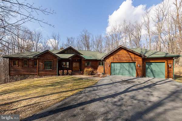 Welcome to this 11.41-acre mostly wooded property just minutes from town! This 2x6 custom-framed insulated log home with impressive 10-inch split logs offers the character of a true log home with added energy efficiency. Featuring 3 bedrooms and 3.5 baths, the home has been meticulously maintained and shows beautifully. The main level includes a spacious primary suite with private access to the TimberTech deck, overlooking peaceful wooded views. The family room offers cathedral ceilings and a striking stone fireplace, creating a warm, inviting atmosphere. The kitchen features hickory cabinetry, granite countertops, and generous prep space. A well-appointed main-level laundry room includes granite surfaces and ample cabinetry for storage and functionality. The finished lower level provides two additional bedrooms and bathrooms, radiant floor heat, a second wood-burning fireplace (piped for propane), a granite island/bar, and a mini refrigerator-ideal for guests, entertaining, or extended living arrangements. Extensive updates and maintenance include a heat pump approximately 5 years old, main boiler components replaced in 2020, water softener, septic pumped every three years, French drains, and gutter guards. Outdoor features include a paved walkway, paver patio, Timber Tech decking, and a 3-car garage. Road maintenance agreement is $500 annually. A rare opportunity to own acreage, privacy, and quality log construction just minutes from Winchester conveniences. The owner uses Xfinity for internet services. Check out our 3-D tour attached to this listing!