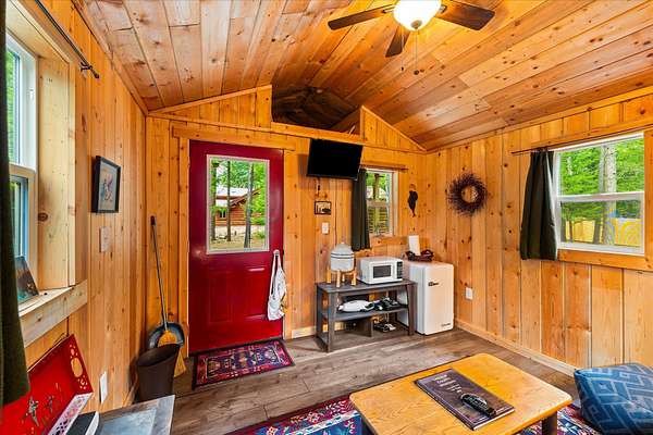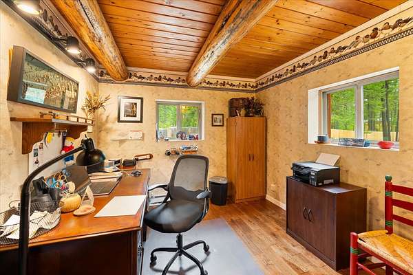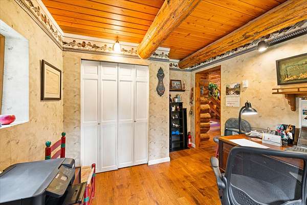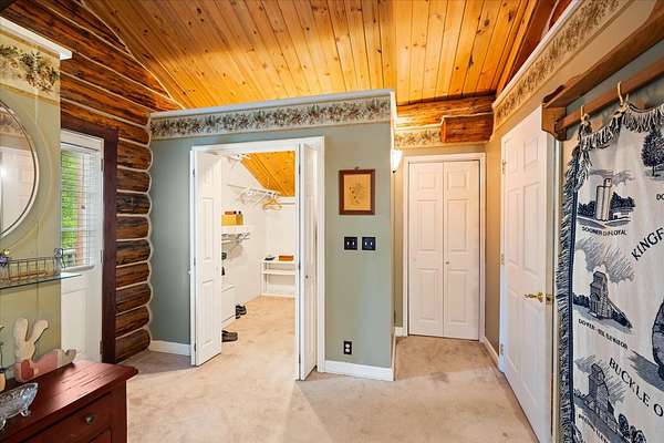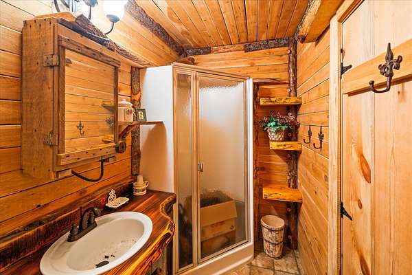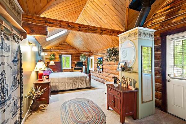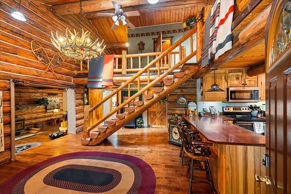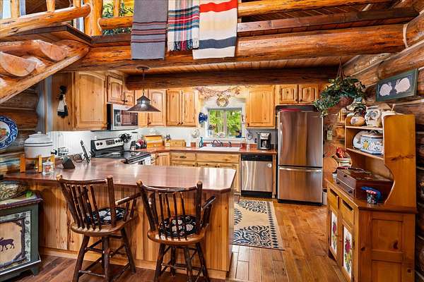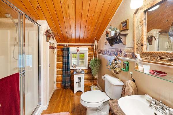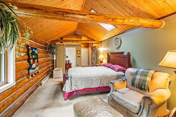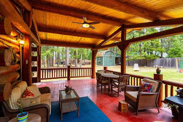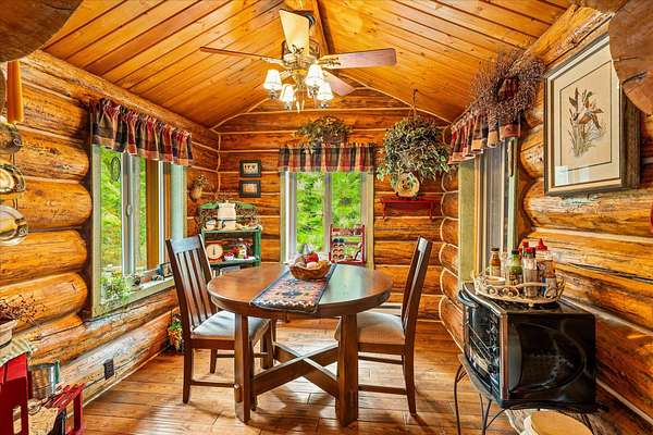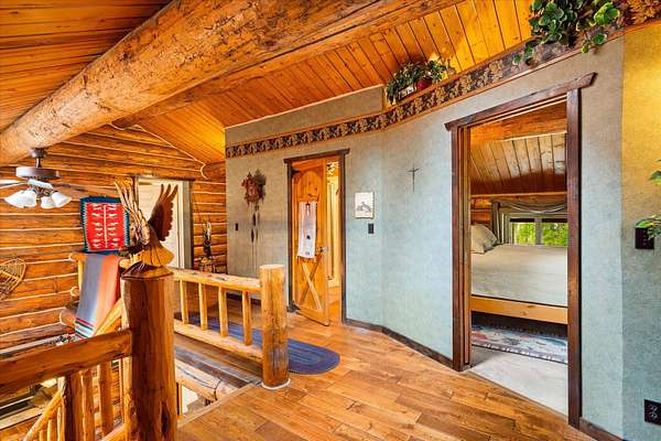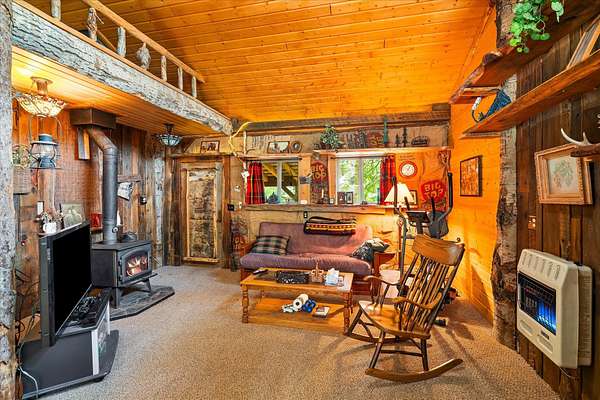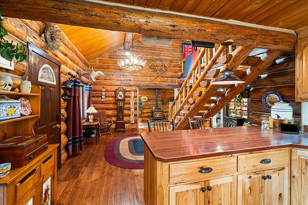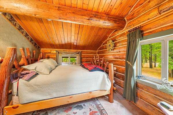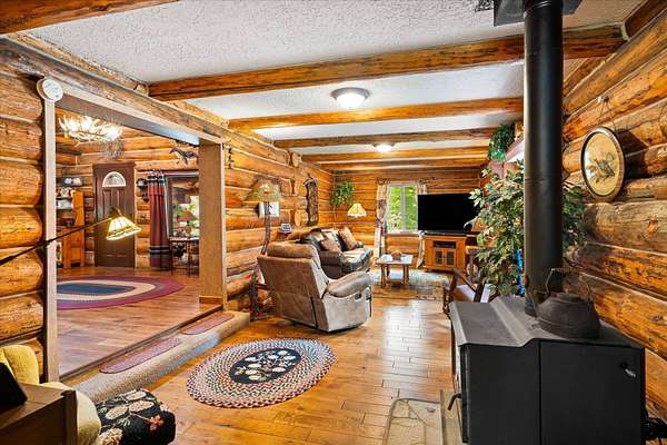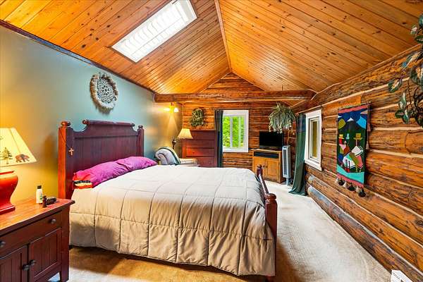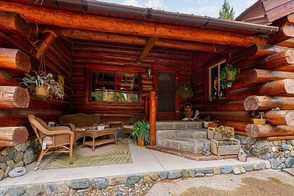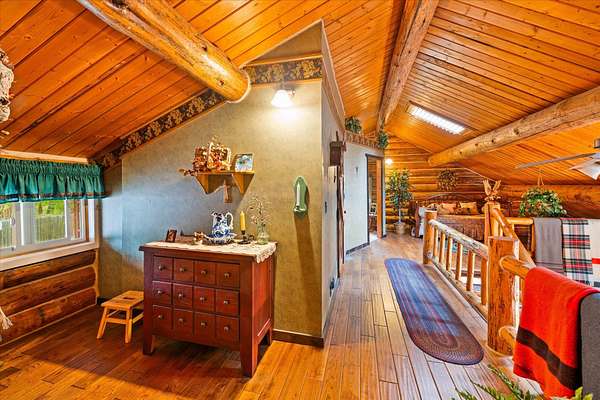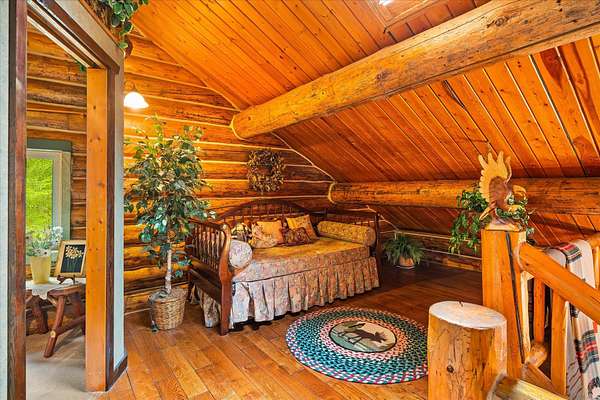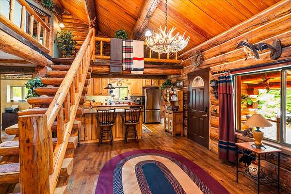 BACK ON THE MARKET, NO FAULT OF THE PROPERTY. Truly amazing property. This 1.7 acres is set back in the trees for privacy. This 2 bedroom, 2 bath log home has a large Great room and front and back decks. Oak Harwood floors. Main floor entry way with skylights, with a full bath and small bedroom/office. Large kitchen and dining room with Rustic Hickory cabinets. Top of stairs has a sitting room, 3/4 bath, Large Primary bedroom with walk in closet and access to a private deck. Home has Option to come fully furnished. Double garage with carport, and a dry cabin fully furnished ready for the water to be hooked up. 10x12 workshop with power. 3 sides have wooden fencing. Garden barn with concrete floor and side shed for wood storage. Fenced Garden with raised beds. 2 story cabin for storage. 3rd dry cabin, 12x16 with 4 ft porch is ready for your guests.