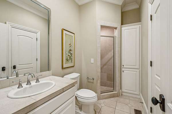 The main level features a true primary suite and an additional guest suite, while a second primary suite upstairs provides flexibility for multi-generational living. The sixth bedroom may serve as a gym, nursery, or hobby room. Refined finishes and abundant natural light create an inviting atmosphere throughout.