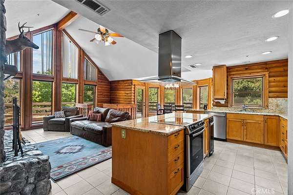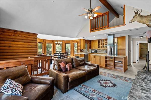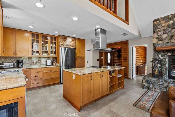 Inside, an open-concept floor plan creates effortless flow between the kitchen, family room, and dining area, anchored by a striking natural stone fireplace. The kitchen features abundant storage, a center island with cooktop facing the living space--perfect for entertaining while staying connected to guests. Soaring ceilings in the upstairs living room and primary bedroom enhance the sense of space, complemented by a loft overlooking the kitchen below.