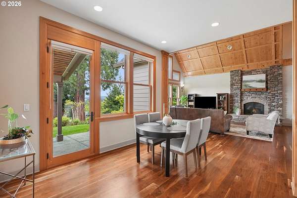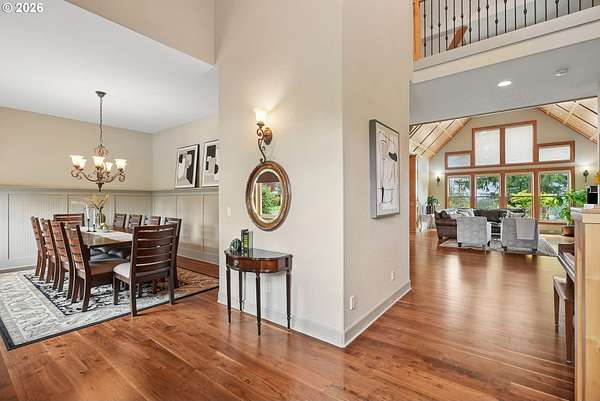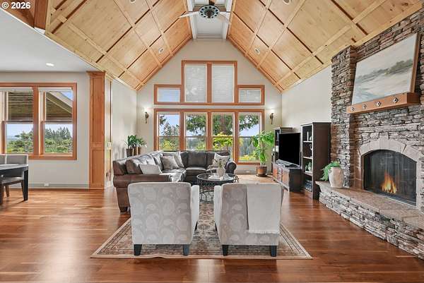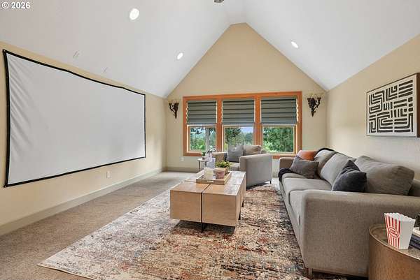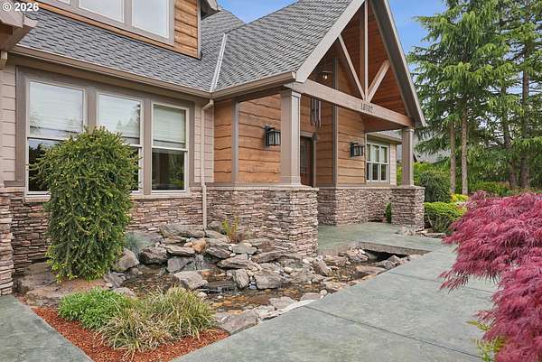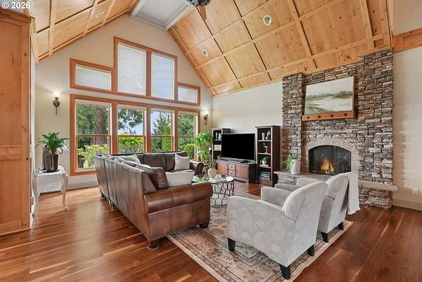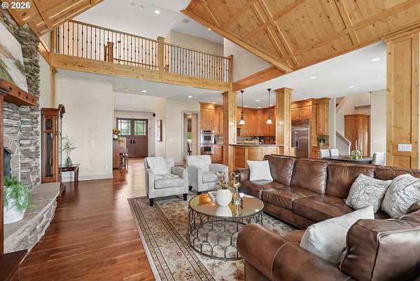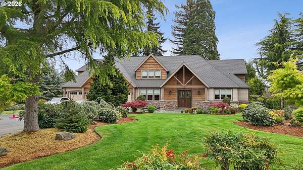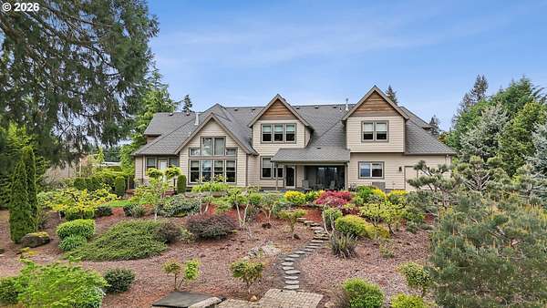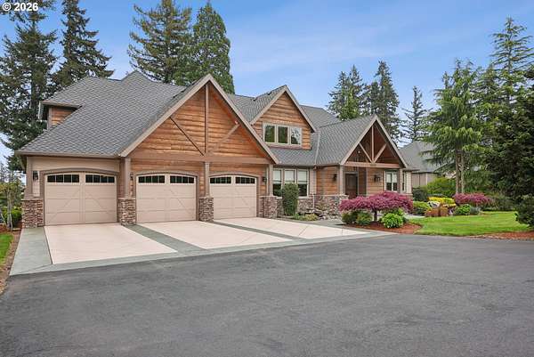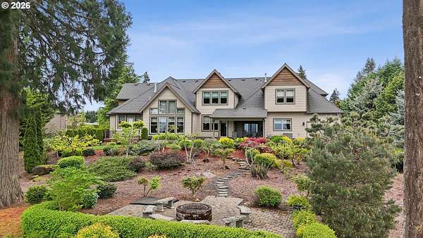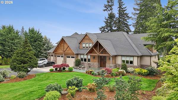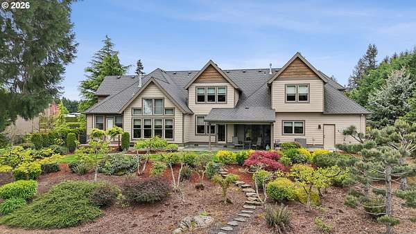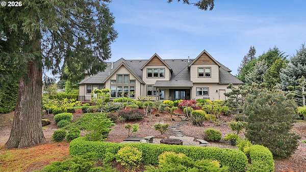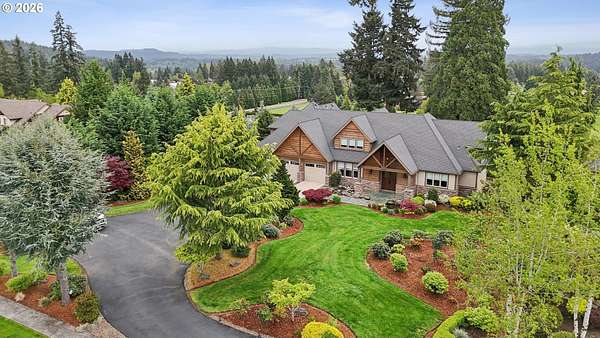 Set along the prestigious Oregon City Street of Dreams, this is a rare opportunity to own a truly exceptional estate! Nestled on over 2 private acres and behind a gated entry, this 4,521 sq ft, 4 bedrooom, 3.5 bathoom home blends rustic beauty with refined elegance in every detail. Enter into soaring ceilings and a statement rock fireplace that anchors the main living space with incredible floor to ceiling windows. The rich hardwoods, enchanting wood accents, slate, and granite create a warm and elevated feel throughout. Designed for both everyday living and unforgettable entertaining, this home features a formal dining room, a butler's pantry, and plenty of options for the wine connoisseur. The kitchen is gorgeous, with high-end stainless steel appliances, a double oven, gas range and a curved island. You'll find the beautiful primary suite on the main level and it's a retreat of its own. It showcases a private patio, a spa-inspired ensuite, a large walk-in shower and a striking waterfall feature that flows into a jetted tub- ready to bring you peace and relaxation. All the upstairs bedrooms are generously sized and offer walk-in closets. But this home doesn't stop there! It also features a large bonus room and a dedicated home theater. Then step outside to an entertainers dream, with a gorgeous stamped concrete patio and an outdoor kitchen space ready for unbelievable PNW summer nights. You'll be surrounded by stunning and meticulously maintained lush grounds with tranquil water features, a fire pit, and breathtaking views of Mount Hood and the Willamette valley. The sunsets are spectacular! Your dream home is here, tucked into the peaceful countryside. Yet, you'll be just minutes from dining and shopping in downtown Oregon City. This home offers the perfect balance of privacy, luxury, rustic charm and convenience. With new upgrades, a spacious 4 car garage, and evident pride of ownership throughout, this is more than a home. It's a legacy property.