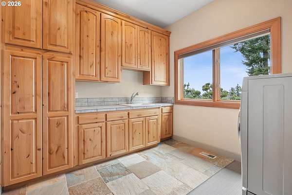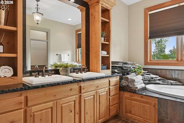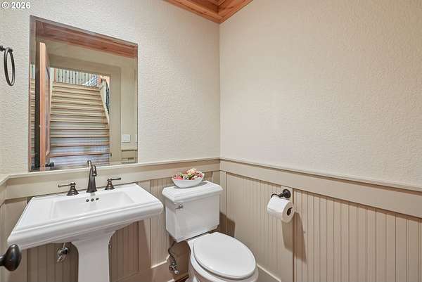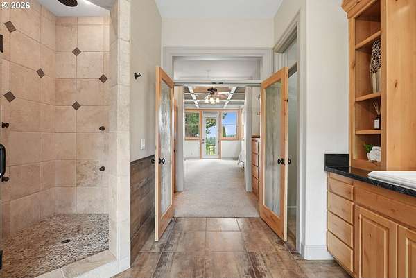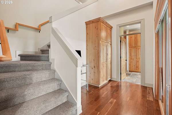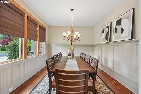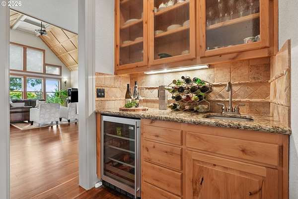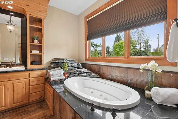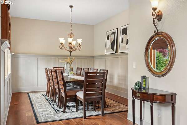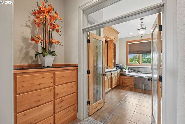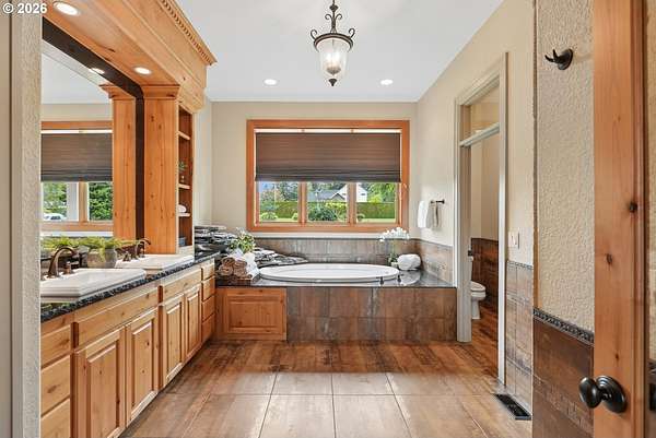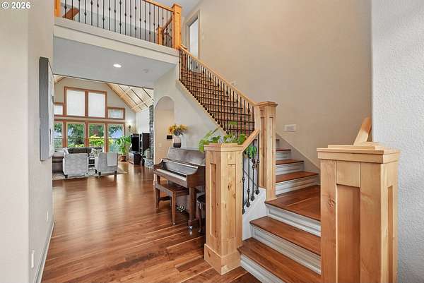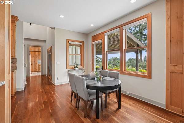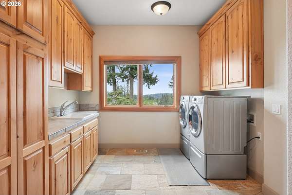 Set along the prestigious Oregon City Street of Dreams, this is a rare opportunity to own a truly exceptional estate! Nestled on over 2 private acres and behind a gated entry, this 4,521 sq ft, 4 bedrooom, 3.5 bathoom home blends rustic beauty with refined elegance in every detail. Enter into soaring ceilings and a statement rock fireplace that anchors the main living space with incredible floor to ceiling windows. The rich hardwoods, enchanting wood accents, slate, and granite create a warm and elevated feel throughout. Designed for both everyday living and unforgettable entertaining, this home features a formal dining room, a butler's pantry, and plenty of options for the wine connoisseur. The kitchen is gorgeous, with high-end stainless steel appliances, a double oven, gas range and a curved island. You'll find the beautiful primary suite on the main level and it's a retreat of its own. It showcases a private patio, a spa-inspired ensuite, a large walk-in shower and a striking waterfall feature that flows into a jetted tub- ready to bring you peace and relaxation. All the upstairs bedrooms are generously sized and offer walk-in closets. But this home doesn't stop there! It also features a large bonus room and a dedicated home theater. Then step outside to an entertainers dream, with a gorgeous stamped concrete patio and an outdoor kitchen space ready for unbelievable PNW summer nights. You'll be surrounded by stunning and meticulously maintained lush grounds with tranquil water features, a fire pit, and breathtaking views of Mount Hood and the Willamette valley. The sunsets are spectacular! Your dream home is here, tucked into the peaceful countryside. Yet, you'll be just minutes from dining and shopping in downtown Oregon City. This home offers the perfect balance of privacy, luxury, rustic charm and convenience. With new upgrades, a spacious 4 car garage, and evident pride of ownership throughout, this is more than a home. It's a legacy property.