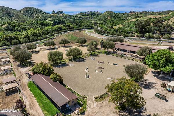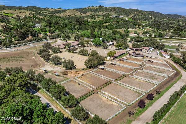 Experience 1812 W Potrero Road, operating as Shelburne Farms, an iconic & income producing Equestrian Facility in the heart of Hidden Valley. This rare offering sits minutes from Lake Sherwood and Sherwood Country Club, with easy access to the shopping, dining, and services of Westlake Village and a short scenic drive to the beaches of Malibu. The property is designed for serious training and smooth daily operations, blending large scale infrastructure with the timeless beauty of rolling hills and an open sky. The equestrian facilities include a main barn with 33 stalls, 5 of which are 12 x16, and 3 of those with in and out access. A secondary barn provides 23 stalls, the lower barn offers 8 stalls, and the hay barn includes 4 additional stalls for overflow, creating a total of 68 stalls. Training amenities feature 4 arenas including 2 large arenas, 1 smaller arena near the secondary barn, and 1 overflow arena near the residence. There are 22 turnouts in various sizes with some partial covering, 2 tracks and 1 Eurosizer. The main residence offers approximately 4,130 square feet with 4 bedrooms and 4.5 bathrooms, generous living and dining spaces, a pool and an easy indoor to outdoor flow that is ideal for relaxing after a ride or hosting friends. Two additional staff apartments are integrated within the barns. Set within one of Southern California's most storied Equestrian Enclaves, 1812 W Potrero Road delivers privacy, convenience, and a proven income stream in an exceptionally well equipped training environment. Hidden Valley feels a world apart, offering the rare union of country quiet and coastal convenience, with sweeping scenery, privacy, and generous open space. It is one of Southern California's most coveted settings for horse lovers and nature minded homeowners, where daily life can include morning rides and evenings spent entertaining under the stars. Here, the setting elevates both living and training, supporting a serious equestrian program while providing a warm and welcoming home base. This is a property that rewards both performance and peace.