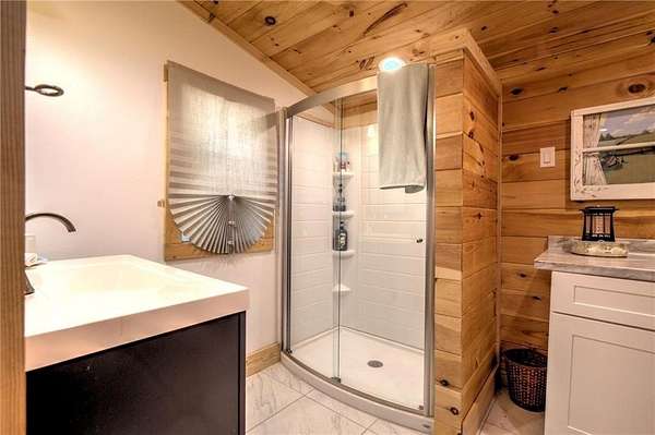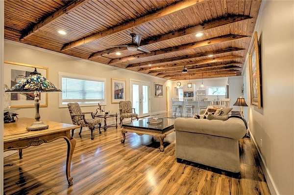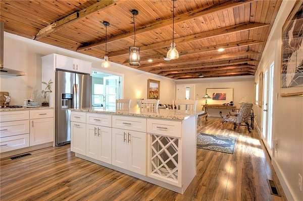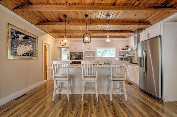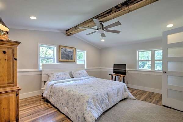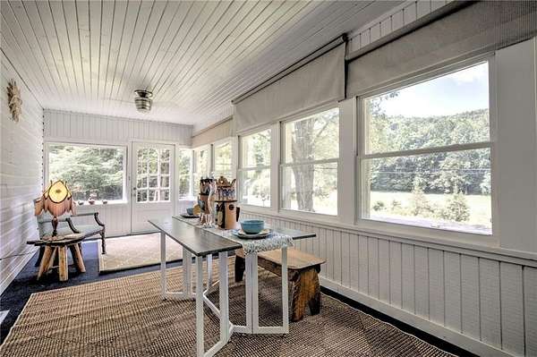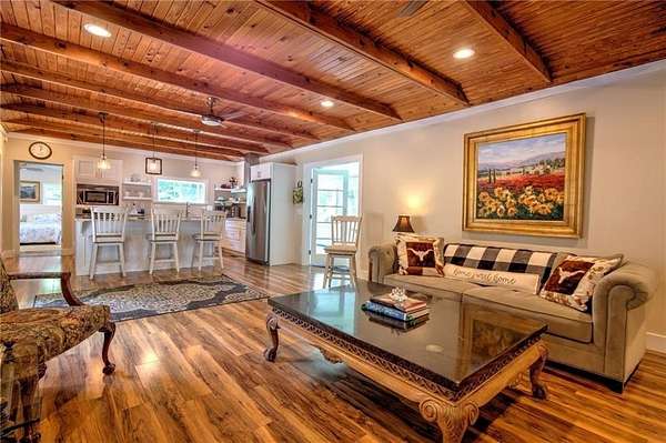 A Fully Renovated North Georgia Ranch With a Barn and Creek? Yes, It Exists. Fully renovated ranch on approximately 2.5 level acres with long-range pasture views, a spring-fed creek, and excellent outdoor living. Renovated to the studs with new electrical, new plumbing, new HVAC, new insulation, new drywall, new lighting, and new interior finishes. Home sits on a full basement for added storage or future expansion. Features two laundry rooms, one in the basement and one in the secondary bathroom. The upgraded kitchen includes new cabinetry, new stainless appliances, solid-surface counters, and an open layout to the living room and sunroom. Both bedrooms offer private en-suite baths with new tile, vanities, and fixtures. Updates include new flooring, select new windows, and fresh paint. Enjoy a large deck, gazebo, and hot tub. Property includes a 30' x 40' barn, detached garage, and workshop. Minutes to Downtown Blue Ridge and Lake Blue Ridge.