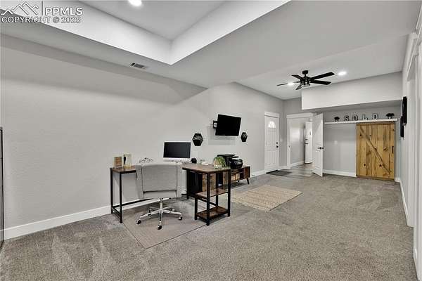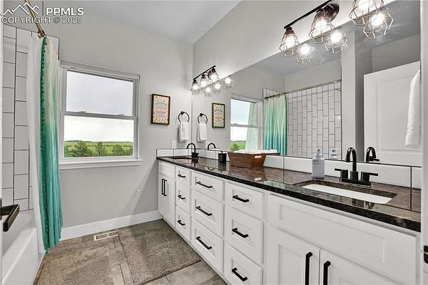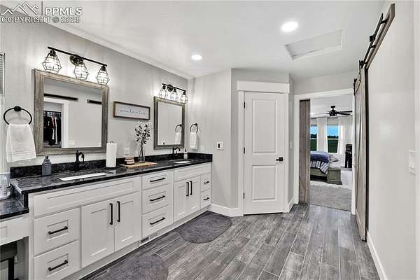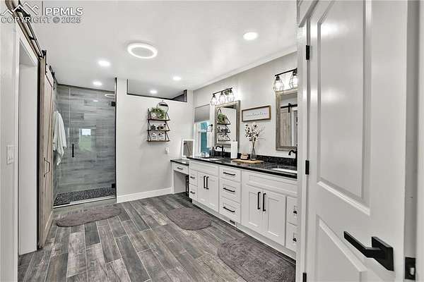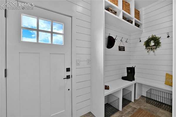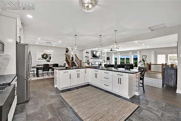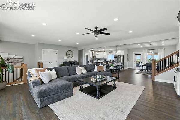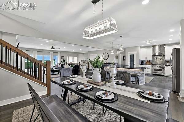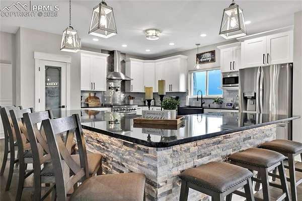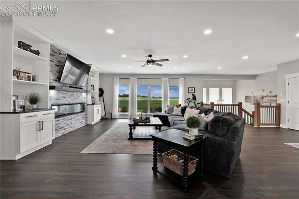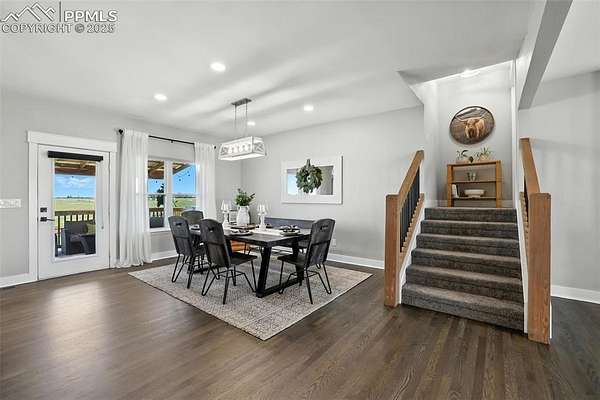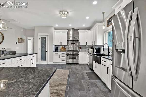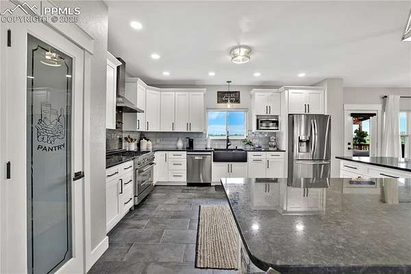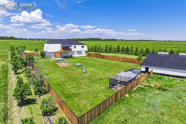 At the very end of a quiet private road, you'll find a Colorado retreat that actually feels like one. Thirty-five acres of rolling, tree-studded landscape, wide-open skies, and complete privacy wrap around this modern farmhouse,creating the kind of lifestyle people imagine when they think of living in the country. Step inside and you're greeted with over 3,500 sq ft of thoughtfully crafted space. Real hardwood floors,custom railings, triple-pane windows, and 9-ft ceilings set the tone. The kitchen is the heart of the home with a massive island that seats eight, a gas range, and storage for days. It flows straight into a dining room framed by picture-perfect views, and the living room is anchored by a gorgeous stone fireplace with built-ins. The primary suite feels like its own getaway, tucked up a private staircase with oversized windows, a spa-inspired bath, and a generous walk-in closet. The lower level offers a theater room,another bedroom and full bath, plus a flexible living space ideal for guests, multigenerational living, or a private workspace. Car lovers, hobbyists, and entertainers will love the heated 1,500 sq ft attached garage it can fit up to six vehicles tandem or four plus a full-size RV, complete with hookups, clean-outs, water access, and room to gather. The 2,300 sq ft shop adds even more: fully insulated,heated, concrete floors, water, and 400-amp service. The property itself is a dream.Six fenced and cross-fenced pastures, healthy hay grass, over 2,000 mature trees and lilacs, plus rolling terrain that makes every sunset feel cinematic.A custom chicken coop and a privacy-fenced backyard round out the perfect country setup. You're minutes from Homestead Ranch Regional Park and within a quick drive to schools and Falcon. Modern conveniences are already in place: 2-gig fiber internet, two water heaters,A/C, a water softener/filtration system, and a newer furnace. No matter where you stand inside or out the views are nothing short of incredible.