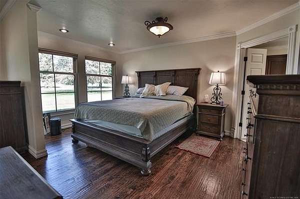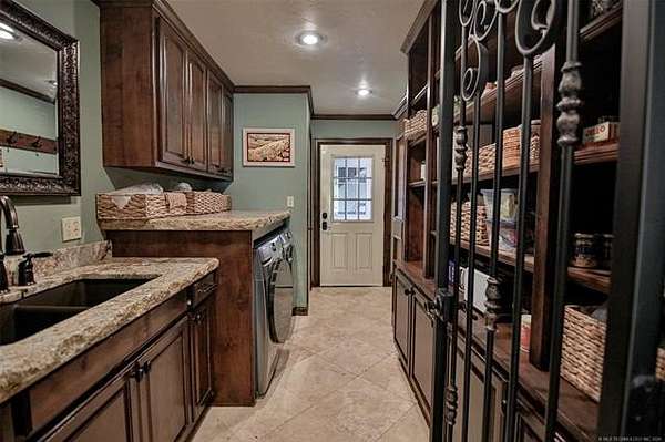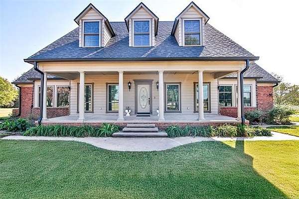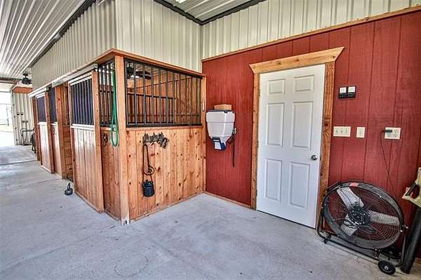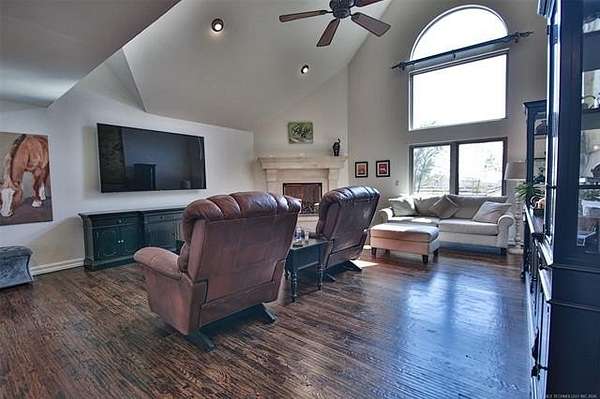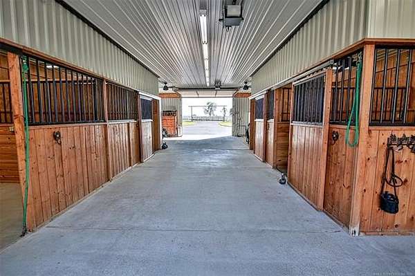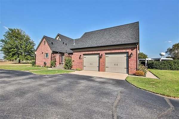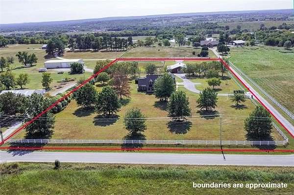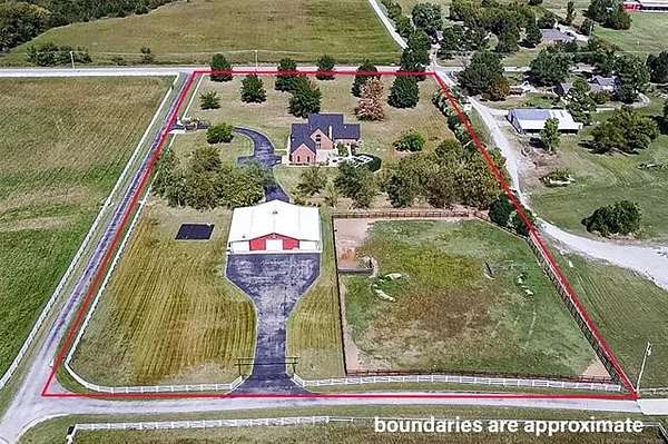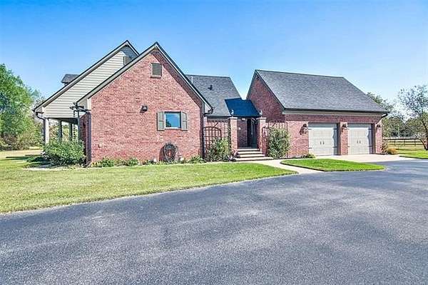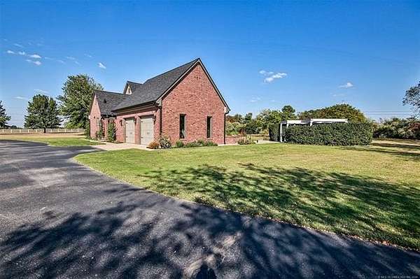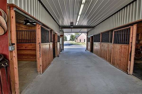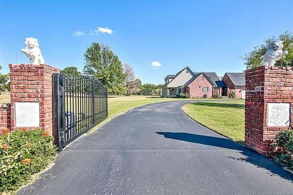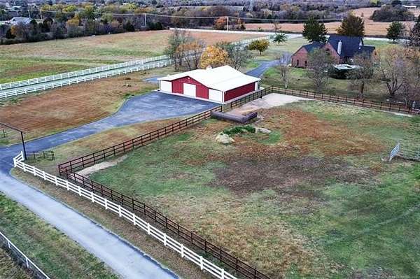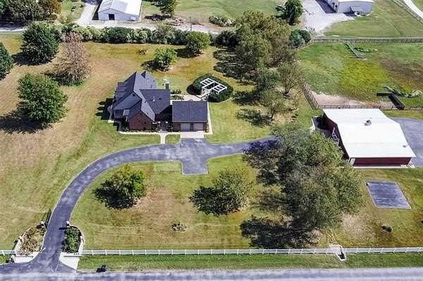 Experience timeless craftsmanship & refined comfort in this exquisite custom home nestled on a beautifully treed 5-acre gated lot w/large shop and arena! Blending old-world charm with modern luxury, this estate offers both character & convenience--plus all NEW Windows, Roof, Siding, & Paint! A grand foyer opens to elegant formal dining area & spacious two-story living room w/soaring ceilings, gas fireplace & wall of windows that fill the space w/natural light. Gorgeous real hardwood floors, rich architectural details & modern upgrades throughout! Gourmet kitchen w/beautiful chiseled-edge granite, stainless steel app., Dbl oven, gas range w/pot-filler, & custom cabinetry w/built-in fridge. Lg island w/sink, bright breakfast nook, and coffee & wine bar. Private office w/exterior access, granite counters, custom built-ins & Fort Knox safe w/stylish half bathroom across the hall. Main-level master suite w/sitting area, dual vanities, copper soaking tub, & cedar-lined WIC. Utility room w/custom shelving, granite, sink, half bath & exterior access. Upstairs is a quaint landing, two bedrooms & a full bathroom. A breezeway connects a charming courtyard to the expansive back patio overlooking raised garden beds & a sizable cabana w/spa hook-up - perfect for relaxing or entertaining in a beautiful park-like setting! Spacious 50' x 64' pull through shop thoughtfully outfitted w/premium stalls optimal for horses, hobbies or storage. Two 12'-wide storage bays on each side, ideal for trailers, implements, or additional workspace. Lg fenced arena provides endless possibilities for equestrian activities, training, or recreation w/plenty of room to ride, work, & enjoy open space! This practical property has two convenient entrances for easy access & ample paved parking, perfect for Lg vehicles, extra guests, or equipment. Easy access to highways & schools in the coveted Bixby school district. A rare find w/timeless design, generous space & modern amenities - refined country living!
