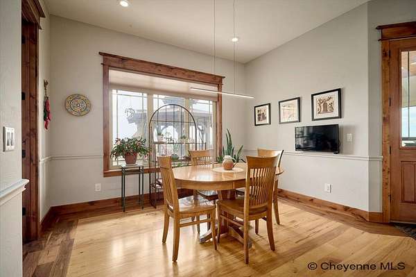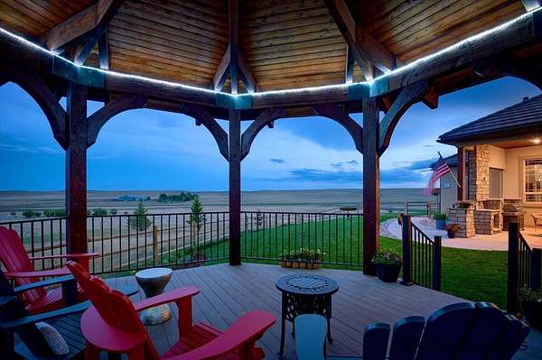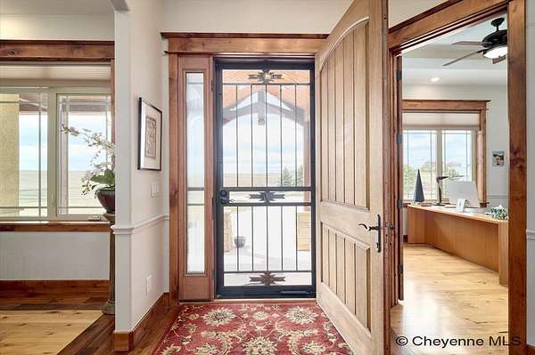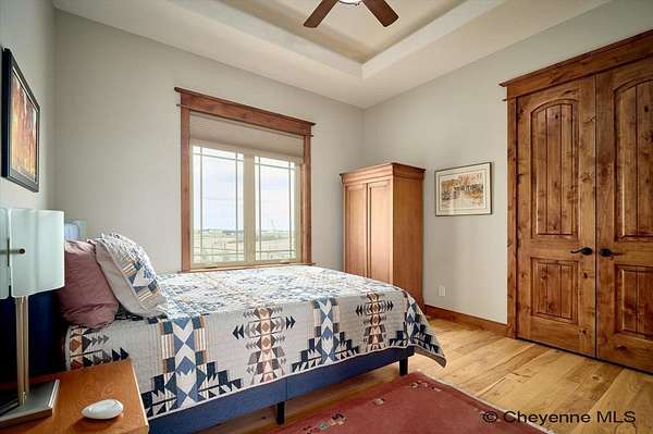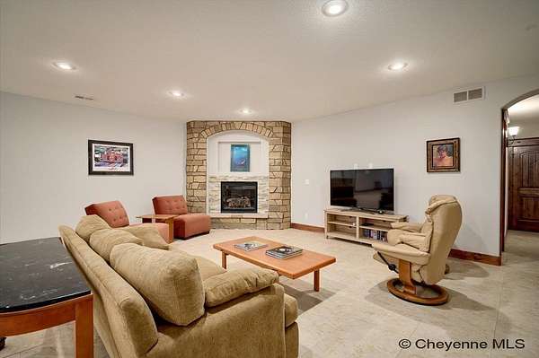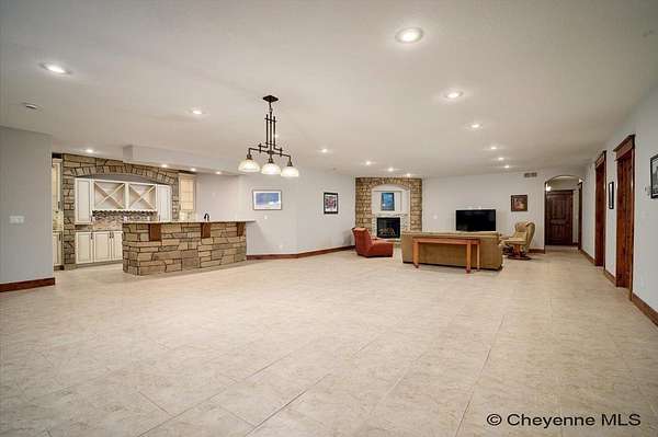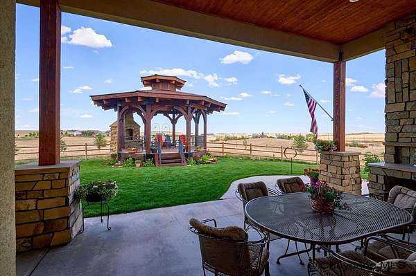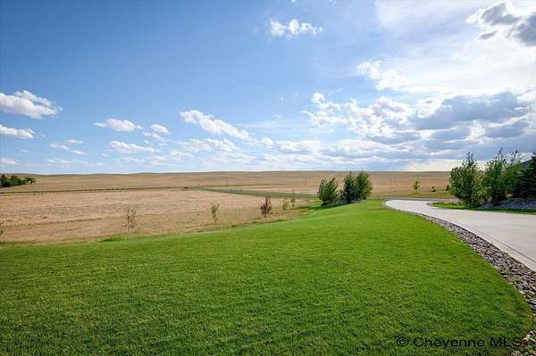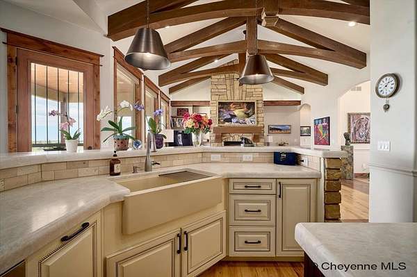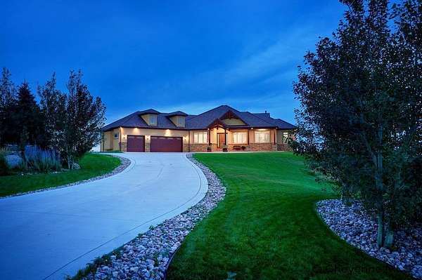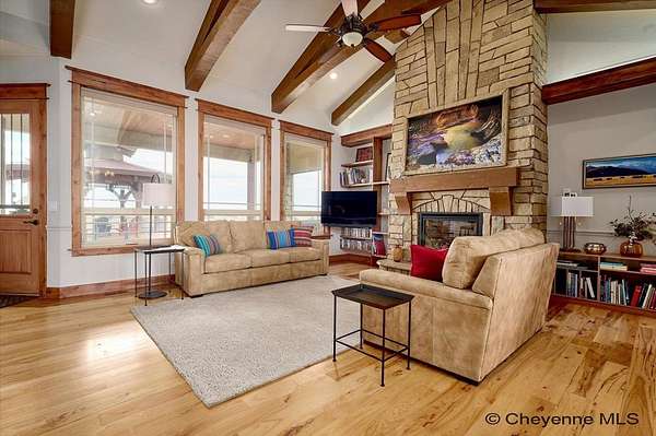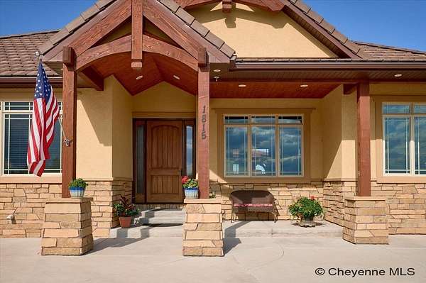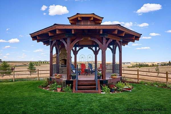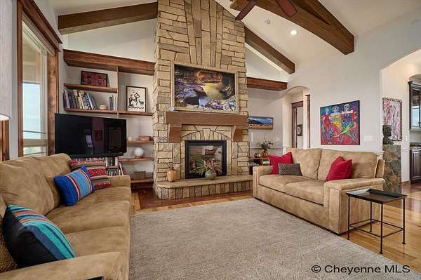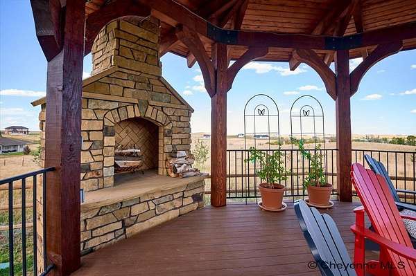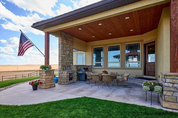 Set on 7.74 acres with sweeping Wyoming views, this extraordinary custom ranch estate delivers a level of craftsmanship and design that is rarely found. From the moment you arrive, the curved driveway, manicured grounds, and striking stucco and stone exterior - complemented by a durable cement tile roof well-suited for Wyoming’s climate - set the tone for what’s inside. Step through the front door and you’re immediately drawn to soaring vaulted ceilings with rich wood beams, expansive windows framing endless views, and a stunning floor-to-ceiling stone fireplace anchoring the main living space. The kitchen is a true showpiece - designed for both everyday living and entertaining. Featuring brand new Taj Mahal quartzite countertops, a statement stone - wrapped breakfast bar, high-end appliances, 48" gas range, soft-close cabinetry with pull-outs, under-cabinet lighting, beverage fridge, prep sink, and a spacious walk-in pantry...every detail was thoughtfully curated.The main level offers 4 bedrooms, including a luxurious primary suite that feels like a private retreat with its own wood-beamed ceiling, spa-inspired bathroom with soaking tub and fireplace, walk-in shower with steam option, and a custom-designed closet. Laundry is conveniently located just off the suite. Throughout the main level, new motorized Hunter Douglas cellular shades provide both convenience and a refined, high-end finish. Downstairs, the finished basement expands your living space with a massive family room with fireplace, wet bar, theater room, second laundry, 2 additional bedrooms, and a secure built-in safe room. In addition to the home's incredible interior, the oversized 3-car garage offers exceptional space, along with a finished bonus area above perfect for a private office, workout space, or additional storage. Step outside and experience what truly sets this property apart. Covered patio living, lush green lawn, and a beautifully crafted gazebo with a wood-burning fireplace...all positioned perfectly to take in Wyoming's unforgettable sunsets. Located just 5 minutes from I-25 and 15 minutes from downtown, this property offers the perfect balance of peaceful country living and everyday convenience. This is more than a home...it’s a legacy property!