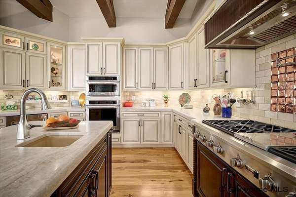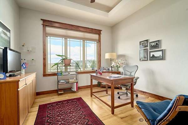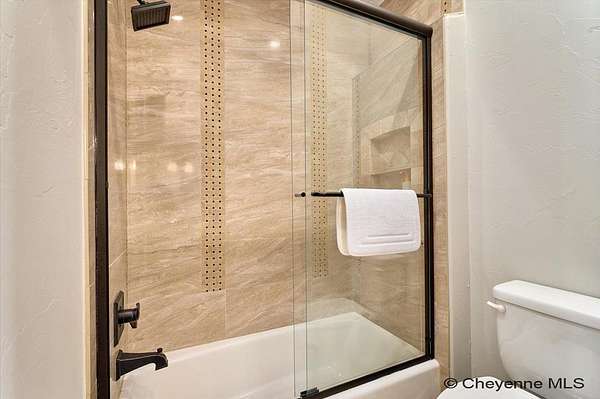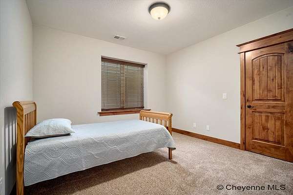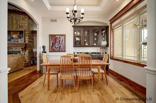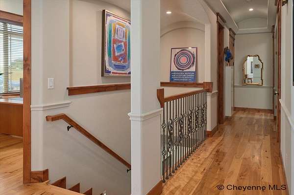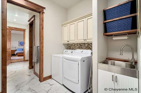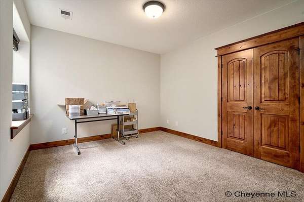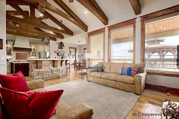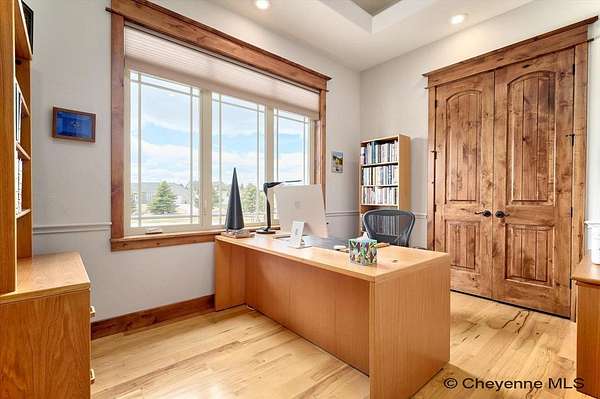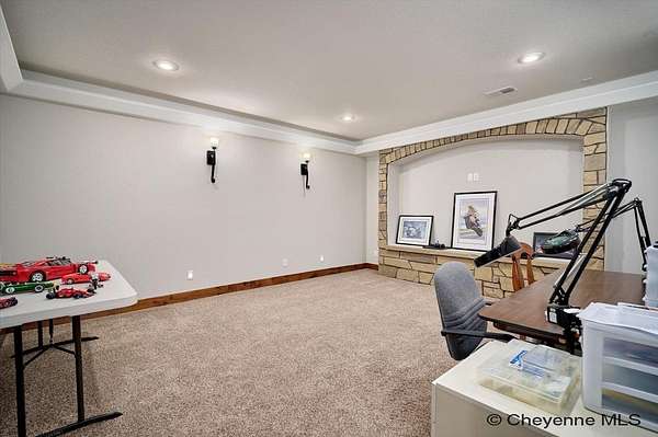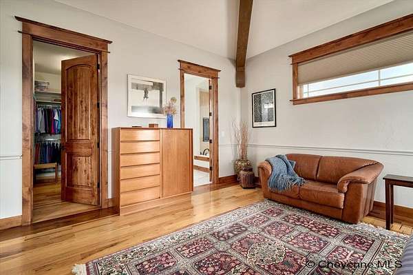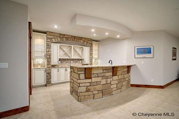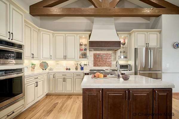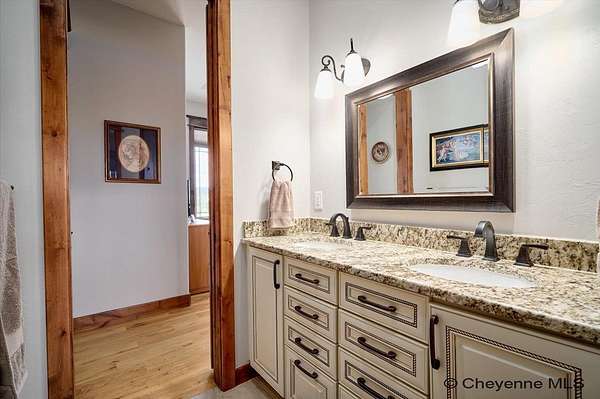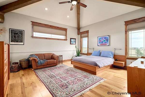 Set on 7.74 acres with sweeping Wyoming views, this extraordinary custom ranch estate delivers a level of craftsmanship and design that is rarely found. From the moment you arrive, the curved driveway, manicured grounds, and striking stucco and stone exterior - complemented by a durable cement tile roof well-suited for Wyoming’s climate - set the tone for what’s inside. Step through the front door and you’re immediately drawn to soaring vaulted ceilings with rich wood beams, expansive windows framing endless views, and a stunning floor-to-ceiling stone fireplace anchoring the main living space. The kitchen is a true showpiece - designed for both everyday living and entertaining. Featuring brand new Taj Mahal quartzite countertops, a statement stone - wrapped breakfast bar, high-end appliances, 48" gas range, soft-close cabinetry with pull-outs, under-cabinet lighting, beverage fridge, prep sink, and a spacious walk-in pantry...every detail was thoughtfully curated.The main level offers 4 bedrooms, including a luxurious primary suite that feels like a private retreat with its own wood-beamed ceiling, spa-inspired bathroom with soaking tub and fireplace, walk-in shower with steam option, and a custom-designed closet. Laundry is conveniently located just off the suite. Throughout the main level, new motorized Hunter Douglas cellular shades provide both convenience and a refined, high-end finish. Downstairs, the finished basement expands your living space with a massive family room with fireplace, wet bar, theater room, second laundry, 2 additional bedrooms, and a secure built-in safe room. In addition to the home's incredible interior, the oversized 3-car garage offers exceptional space, along with a finished bonus area above perfect for a private office, workout space, or additional storage. Step outside and experience what truly sets this property apart. Covered patio living, lush green lawn, and a beautifully crafted gazebo with a wood-burning fireplace...all positioned perfectly to take in Wyoming's unforgettable sunsets. Located just 5 minutes from I-25 and 15 minutes from downtown, this property offers the perfect balance of peaceful country living and everyday convenience. This is more than a home...it’s a legacy property!