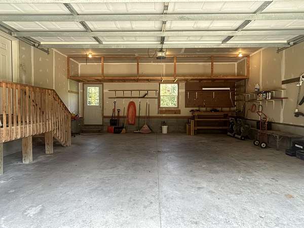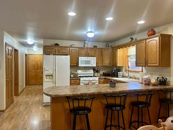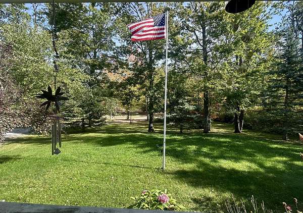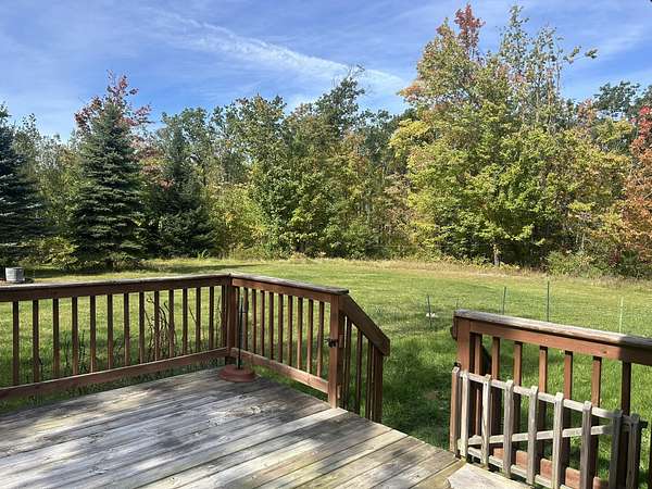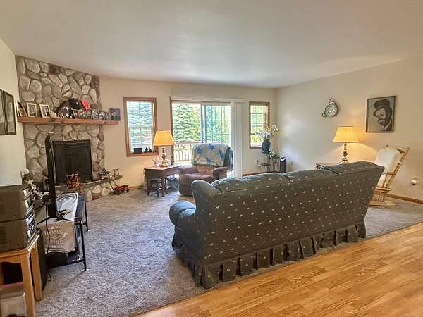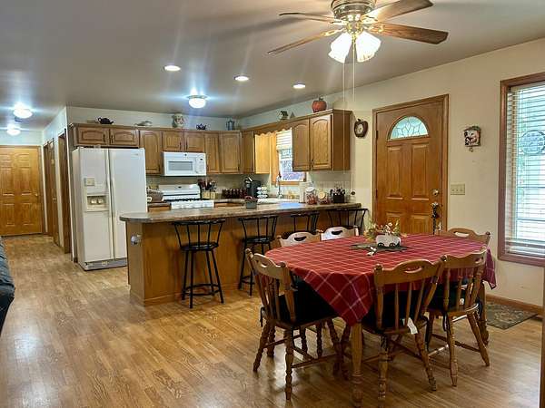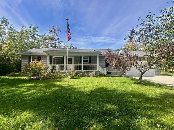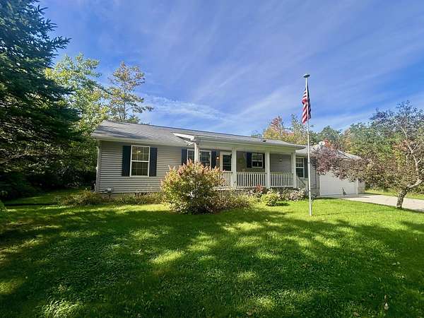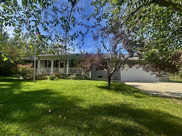 Discover this quality-built ranch-style home set on 7.8 peaceful acres, offering comfort, privacy, and convenient single-level living. Built by Kenyon Construction in 2005, it features 2 bedrooms and 2 full baths on the main floor, along with a spacious living room highlighted by a cozy natural-gas fireplace. The open-concept kitchen and dining area provide an inviting atmosphere for everyday living and entertaining. A doorwall off the living room leads to a large rear deck, perfect for relaxing and enjoying the views. The covered front porch overlooks perennial shrubs, a flagpole, and mature hardwoods. Main-floor laundry and an attached garage add everyday convenience. The finished lower level expands the living space with a 3rd bedroom, 3rd full bath, a generous family room, and storage