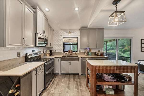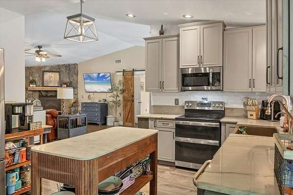 - Ceiling Fans(s), Kitchen/Family Room Combo, Primary Bedroom Main Floor, Solid Surface Counters, Solid Wood Cabinets, Split Bedroom, Thermostat, Vaulted Ceiling(s), Window Treatments