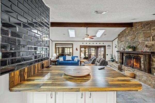 - Decorative Lighting, Eat-In Kitchen, Natural Woodwork, Open Floorplan, Paneling
