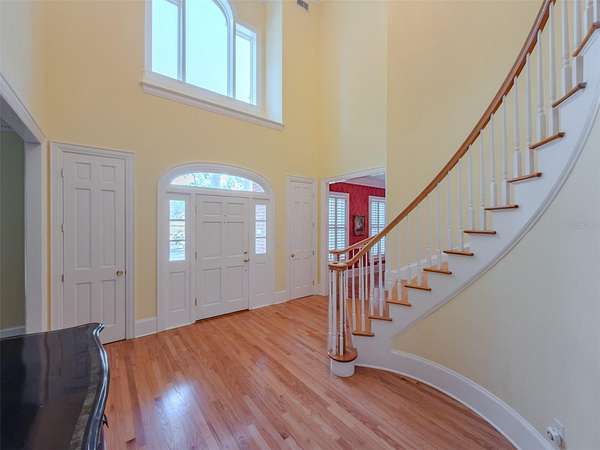 Welcome to this gorgeous, custom-built, 6-bedroom, 6-bathroom Southern estate tucked away on a peaceful 2.51-acre conservation lot. Designed for seamless entertaining, the home greets you with a soaring staircase and an elegant, electronically operated chandelier. To the right, the formal living room provides a graceful pass-through to the family room, while the formal dining room to the left is perfectly situated for holiday gatherings. The chef’s kitchen features an island with cabinets, a gas cooktop, double wall ovens, and high-end stainless appliances, including a Sub-Zero refrigerator. The butler’s pantry adds convenience for hosting, and the walk in pantry affords a family lots of space for non perishables. The sun-drenched breakfast nook offers tranquil pool views and a dedicated desk area. The airy family room serves as the heart of the home, boasting a wood-burning and gas fireplace, custom built-ins, and double sets of French doors leading to the lanai. Nearby, the expansive primary suite serves as a private retreat with pool access, a jacuzzi tub, dual vanities, two water closets, and two large walk-in closets. The first floor also includes a secondary bedroom with a full bath that doubles as a pool bath, a powder room and a functional laundry room equipped with extra cabinetry, a built-in ironing board and a second refrigerator.