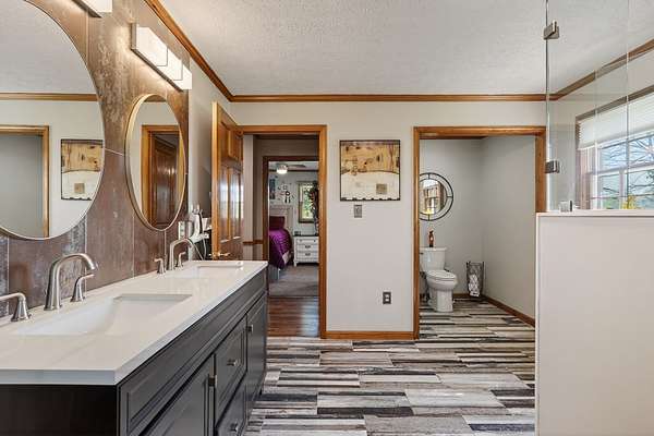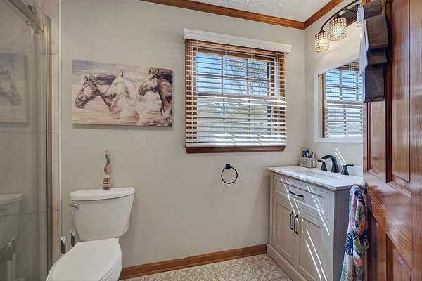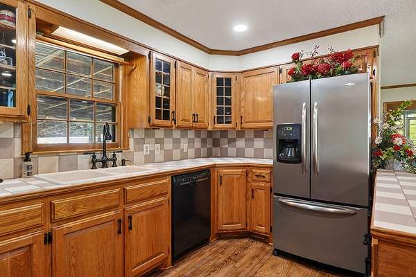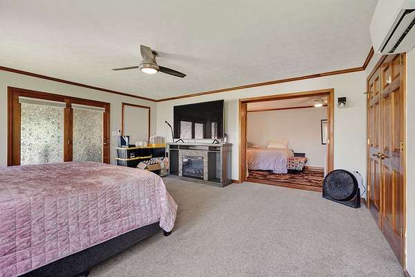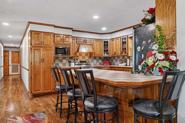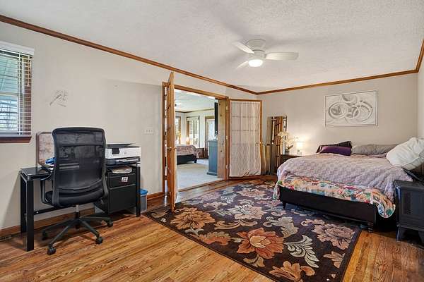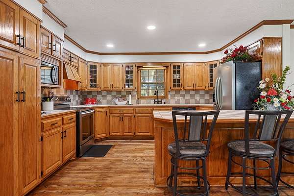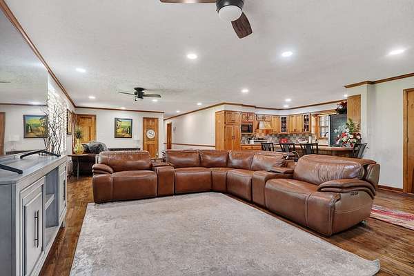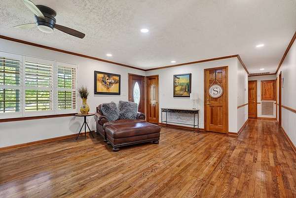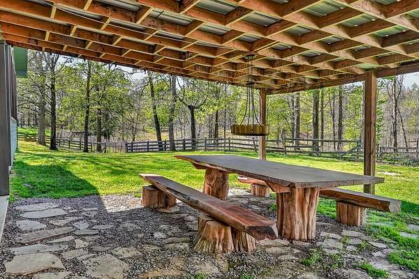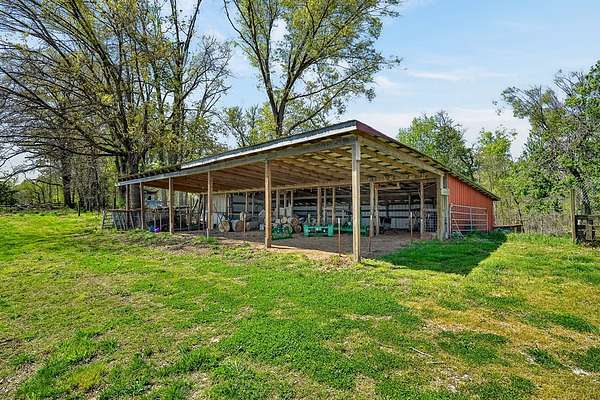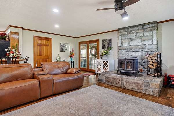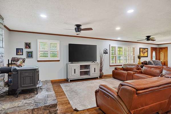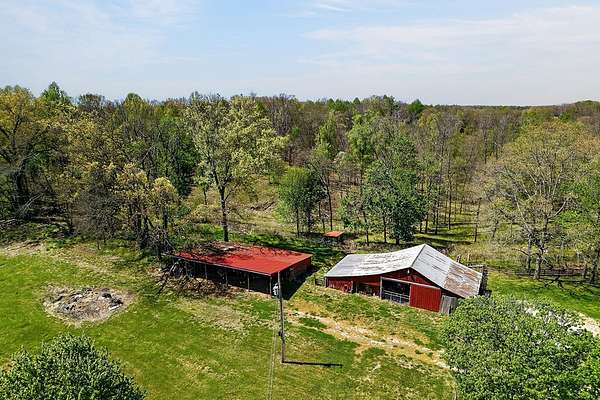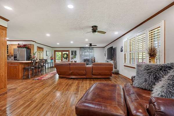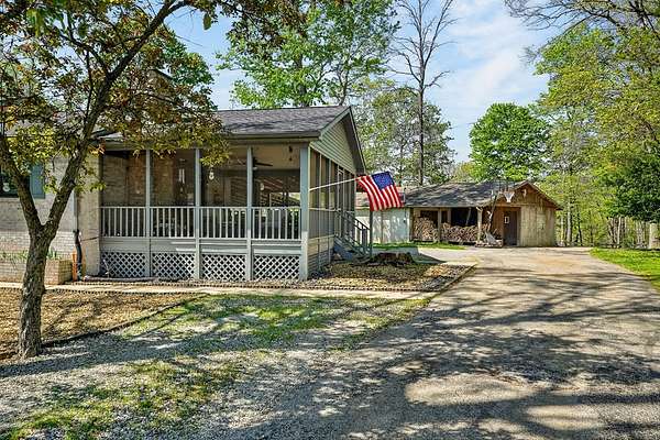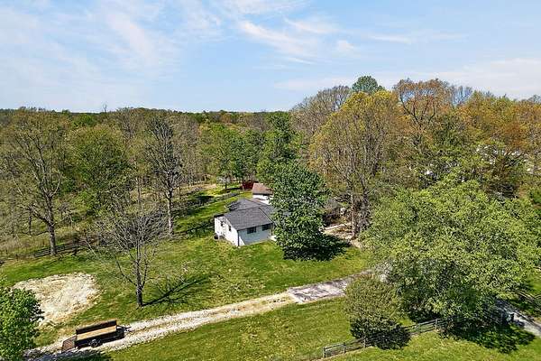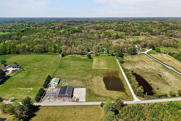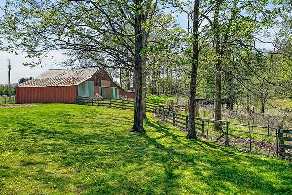 Set on 22+ unrestricted acres, this updated ranch-style brick home offers privacy, function, and the ease of country living. Built in 1979, the home features freshly painted interiors and refinished hardwood flooring throughout. The open layout centers around a spacious living area with a striking stone fireplace and wood-burning stove. The kitchen offers wood cabinetry, tile countertops, and bar seating. The primary suite features large windows and an abundance of natural light, while both bathrooms showcase beautifully tiled showers. Outside, enjoy a screened porch and covered patio ideal for relaxing or entertaining. The land is fully fenced and cross-fenced with two spring-fed ponds, multiple pastures, and a hayfield. Additional improvements include a 30x60 pole barn, 5-stall barn with feed room, and a separate outbuilding with its own electric meter. A true turnkey mini farm with room to grow!