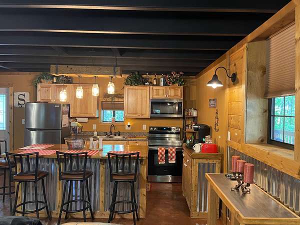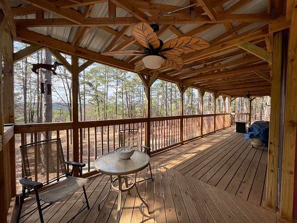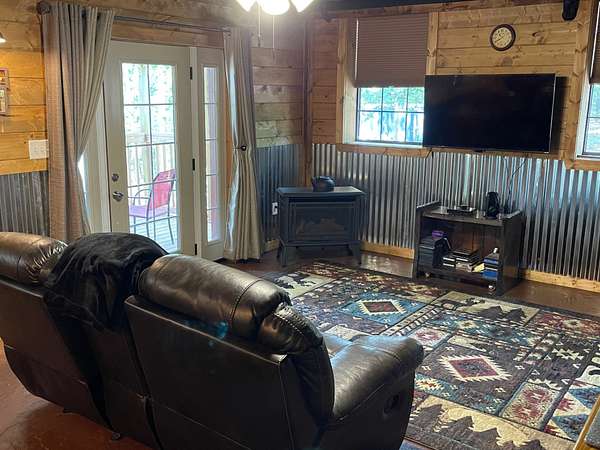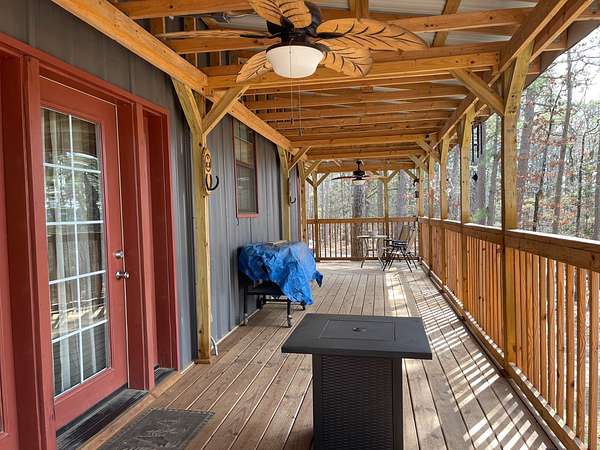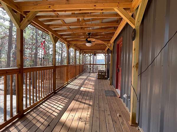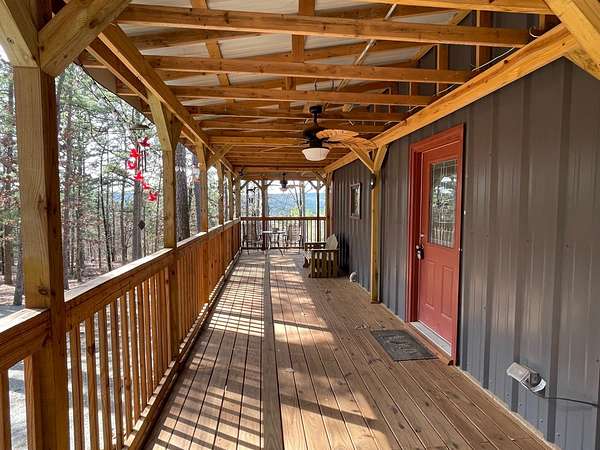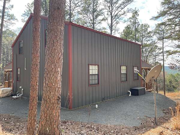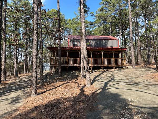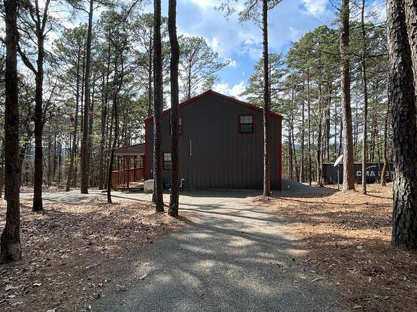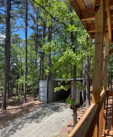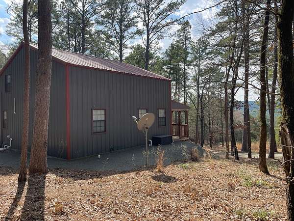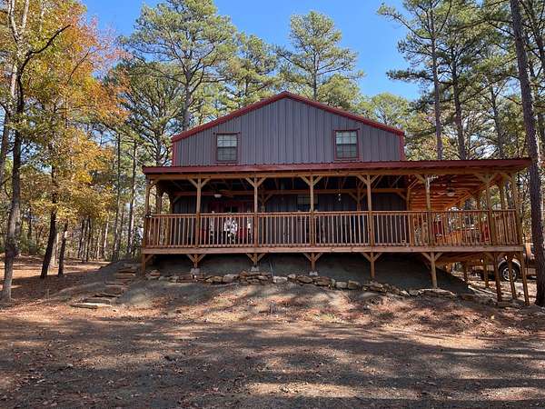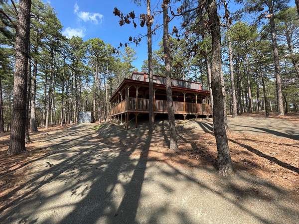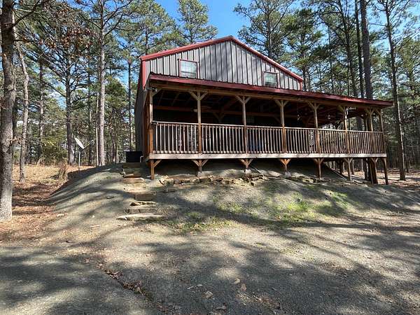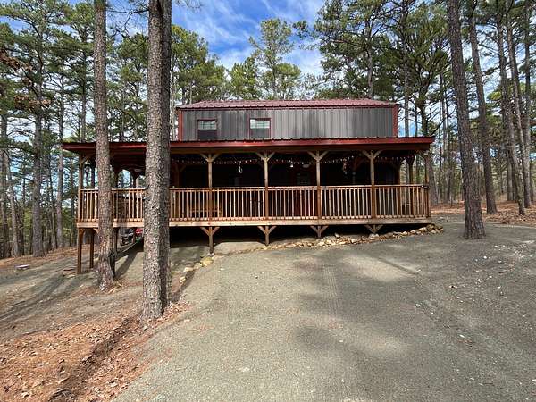 Beautiful two Story Cabin with Mountain views located in the Kiamichi Wilderness. The Kiamichi Wilderness is a small community of approximately 10,000 acres of privately owned land located within the Kiamichi Mountain range. There are trails, creeks and beautiful scenery here. The 1800 SQ Foot cabin is move in ready and fully furnished, just bring your suitcase and make this your weekend getaway or full time residence. Enjoy the beautiful mountain views from the 560 sq ft covered wrap around porch. There is a 20x40 storage container with electric and lighting to store your recreational vehicles or tools. In the home there are 2 bedrooms and 2 1/2 bathrooms. Both of the large bedrooms are upstairs and each one has an ensuite private bathroom and a walk in closet. On the main floor there is a 1/2 bathroom and the open concept Kitchen, dining room and family room. There is a coffee bar in the kitchen, stainless steel appliances, and a breakfast bar with 4 bar stools. A refreshment bar with an ice maker and bar refrigerator for entertaining sits at the edge of the dining room. All of the kitchen cupboards, refreshment bar, coffee bar, breakfast bar and table in the family room are handcrafted pine with beautiful workmanship. All of the inside doors are barn door design. The walls are ship lap pine and corrugated metal. There is a laundry room with a 30 gallon hot water heater and storage shelving. The whole home has been well insulated, the walls are double insulated and the roof has roof foam. There is central heat and air and also a propane fireplace in the family room. Included is a cell phone booster and an 8 camera security system. For internet and Wifi there is Hughes net satellite. There is so much here being offered as the home comes completely furnished including the pots and pans, grill and more. Make this your private getaway or permanent residence. Home will pass VA, FHA loans.