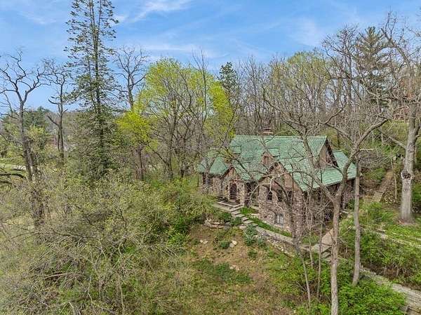 ENCHANTING VINTAGE HOME, STEEPED IN HISTORY. Nestled on a hillside, this distinctive 1929 stone home with green glazed tile roof and seven gables offers panoramic vistas of City Park and the Dubuque St area. The charming exterior with hand cut field stone of varying sizes and colors and notable arched front door welcomes you to a prize Iowa City home. The vestibule leads to the spacious main living room with original floor to ceiling stone fireplace as the centerpiece and wood beams above. Arched French doors access the library trimmed with Iowa black walnut and featuring its own fireplace. Additional French doors enter the window-lined solarium with authentic tile flooring. Original features are highlighted in the main bathroom with period tile and fixtures, light fixtures throughout including living room and dining room sconces and 1920s glass doorknobs. The eat-in kitchen has practical workspace and the multi-colored tiled floor emulates the solarium flooring. Rare opportunity to acquire an historical home surrounded by 1.73 acres of woods and open ground. Quote from Joe Coulter, "Environment and preserving culture, it just all goes together." (paraphrased). Estate Sale, sold "As Is". Please allow 48 hrs for response to offers.