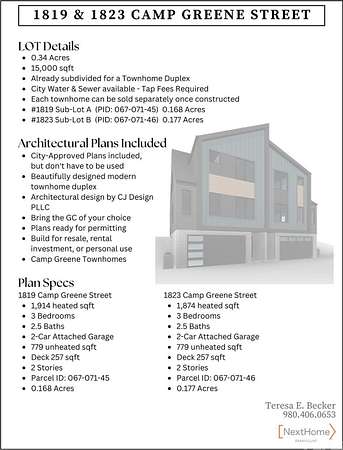 Fantastic opportunity to purchase a Lot with city-approved Plans included. This Lot has architectural plans included for a beautifully designed modern townhome duplex. Buyer can take the approved plans and choose their own GC to build. Build for resale, for yourself or as a rental investment. Great location in the quickly growing Ashley Park area - with new construction properties, new eateries and retail. Convenient to local favorites Not Just Coffee, Rhino Market & Deli, and a variety of restaurants. Less than 5 minutes to eateries in Wesley Heights, less than 10 minutes to Uptown, only 10 minutes to Charlotte's international airport. This is a great opportunity to build for resale, townhome sales are high in this area. Or as a rental investment - an estimated 67% of residents lease in the Ashley Park area. Lot has already been subdivided to give each townhome its individual address and parcel ID, allowing each townhome to be sold separately. Reach out to the listing agent for a copy of the beautiful city-approved architectural plans and survey. Don't miss this opportunity!