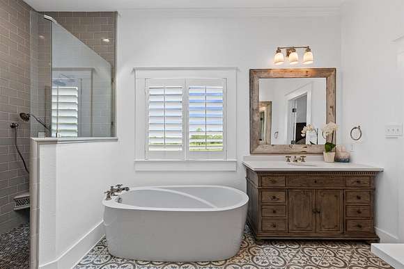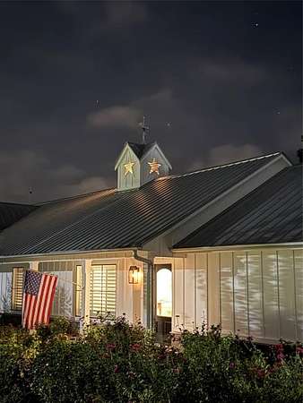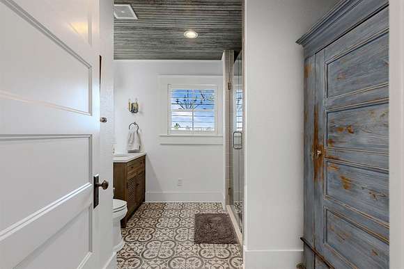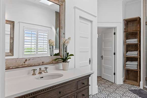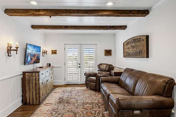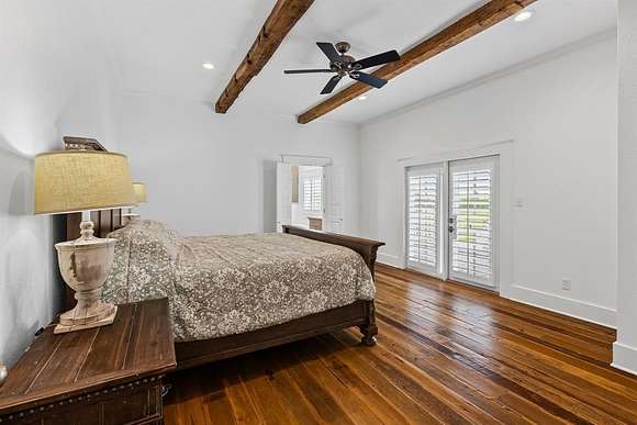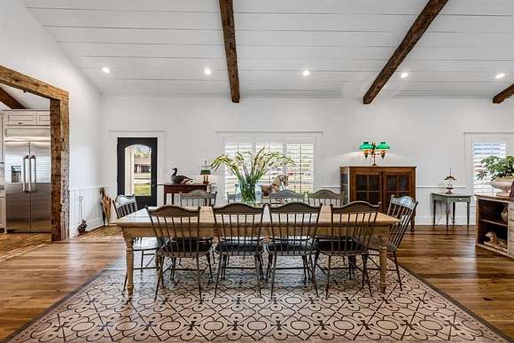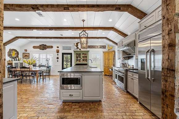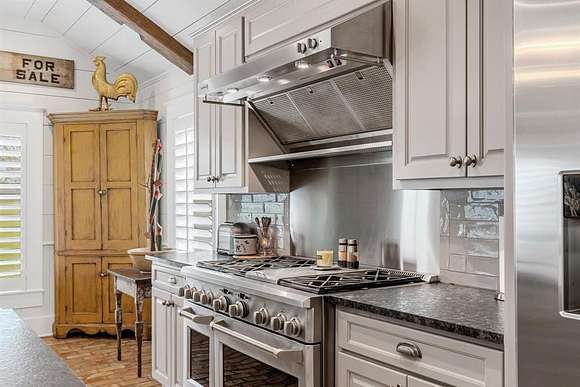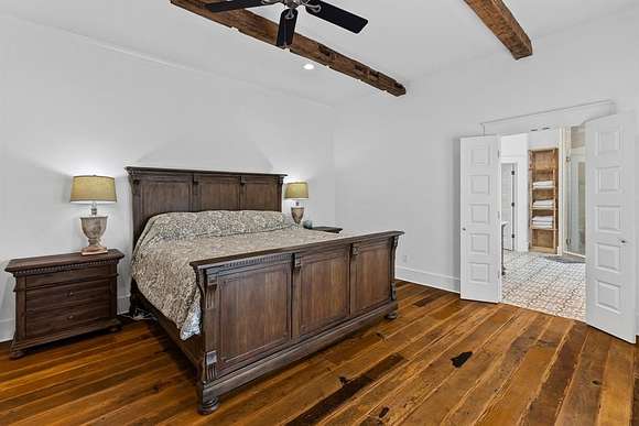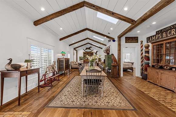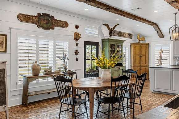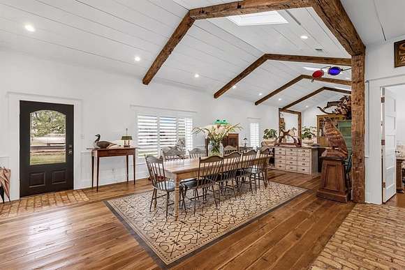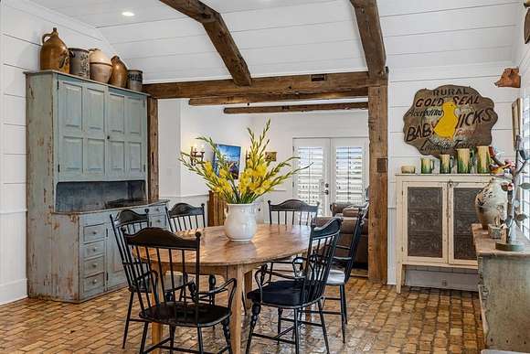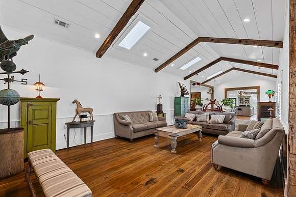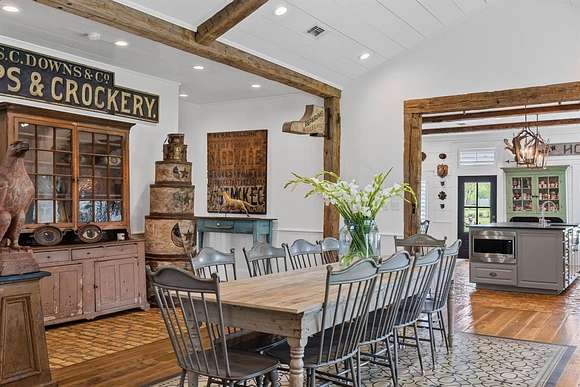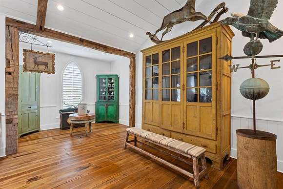 A collector's dream comes true with this farmhouse chic 2,756 square foot home, on 16-plus acres, with custom touches and tastefully hand-picked antique finishes! From the elegant 1860's Georgia wood floors and antique Chicago pavers, walk into this handsome home and be astounded by the thoughtful interior decorating that elevates the space. Barn beams from the 1840's give the vaulted ceilings a nice pop of warmth in the living room, kitchen, and dining areas. Skylights, white slat ceilings, and recessed lights also brighten up the great room. A generous kitchen includes a commercial gas range, warming tray with heat lamps, commercial vent, farm sink, dishwasher, separate ice maker by the pantry, and custom lights. The walk-in pantry comes with an antique door. The primary ensuite bedroom will impress with a spa-like bathroom that has a luxurious interior with a separate tiled shower, soaking tub, and separate double sinks. Guests will enjoy the spare bedroom with a modern hall bathroom with a tiled walk-in shower. A second living space will make the perfect family room or can be turned into a bedroom. Additional touches include custom-made Gothic window, Kohler faucets, plantation blinds from Custom Shutters, GE monogram appliances, restoration hardware vanities with solid surface Caesar Stone tops, handmade walnut doors, and handmade cupola. Sit on the oversized 1,009 square-foot deck and appreciate the mature trees that were planted in the fall of 2024. Parking is a breeze with a concrete drive and 600 square-foot garage. This house also comes with Prierfert Ponderosa fencing, spray foam in the attic and pier and beam areas, and large scenic pond. This spectacular place provides lots of curb appeal, including Copper Bevolo gas lanterns from New Orleans--all with acreage close to town. Don't let the 1940 year built fool you. The original home was re-built and 1500 feet added by a true craftsman, master carpenter!