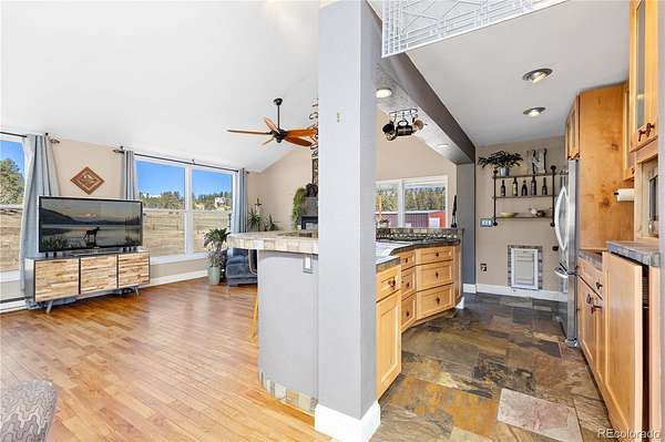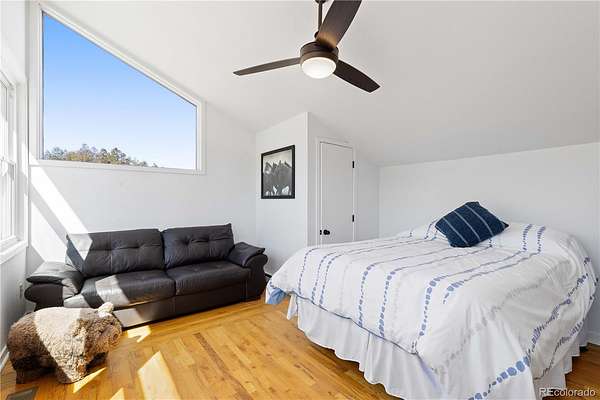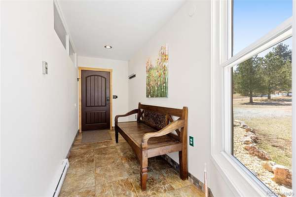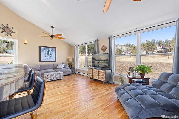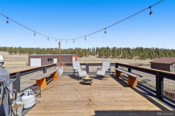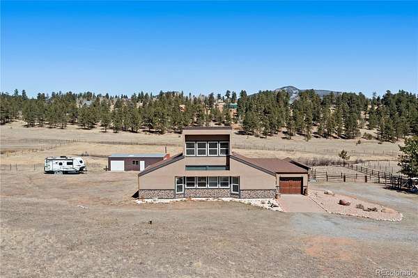 Welcome to your own private sanctuary—an almost 5-acre horse property nestled in the breathtaking foothills just outside of Denver. With sweeping views of Mount Rosalind and direct access to miles of hiking and horseback riding trails, this one-of-a-kind home offers a perfect blend of adventure and tranquility. Step outside your door and into a landscape teeming with wildlife, where golden aspens shimmer in the fall and the scent of pine fills the crisp mountain air. Whether it's a peaceful morning walk or an invigorating ride along the private neighborhood trails, every moment here feels deeply connected to nature. The home itself is a stunning retreat, filled with natural light from oversized, sun-filled windows that frame the incredible mountain views. An open floor plan with vaulted ceilings and hardwood floors creates a warm and welcoming atmosphere. A cozy two-sided fireplace adds charm and comfort to both the living room and the backyard deck. The kitchen brings a rustic mountain vibe, featuring rich wood cabinetry with glass fronts, a gas cooktop, and unique tile countertops. The main level includes a bedroom with a truly one-of-a-kind en-suite bathroom, showcasing exposed copper pipes and matching ceiling tiles. Upstairs, a loft-style bedroom offers expansive views that will leave you in awe. This property has been thoughtfully updated with a new gas furnace, well pump, pressuer tank, front and storm doors, garage door and opener, gutters, ceiling fans, light fixtures, windows, carpet, stucco, paint, and an updated second bath. Just 20 minutes from C-470, this serene escape is close enough to enjoy all the amenities of Denver, yet far enough to feel like another world entirely. This is Colorado living at its finest—wild, beautiful, and truly unforgettable.