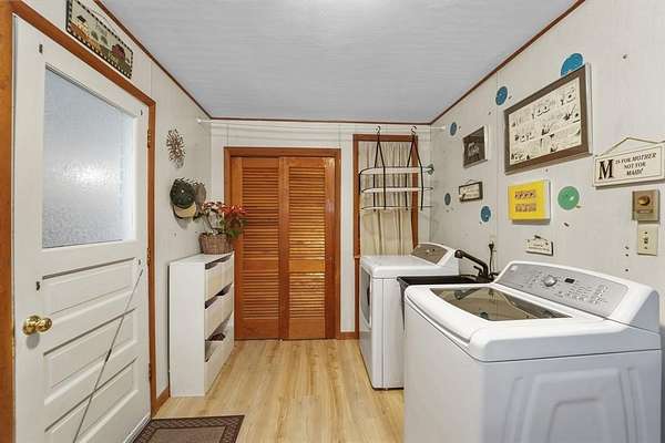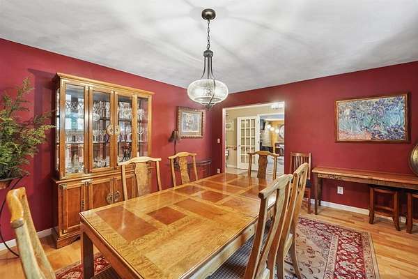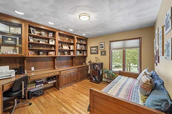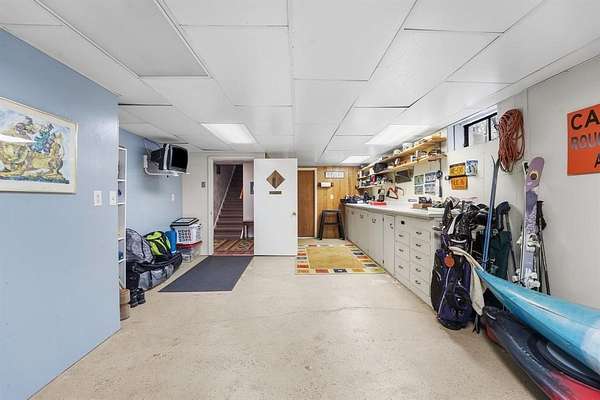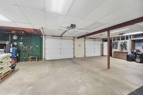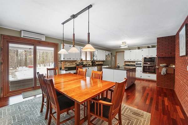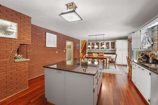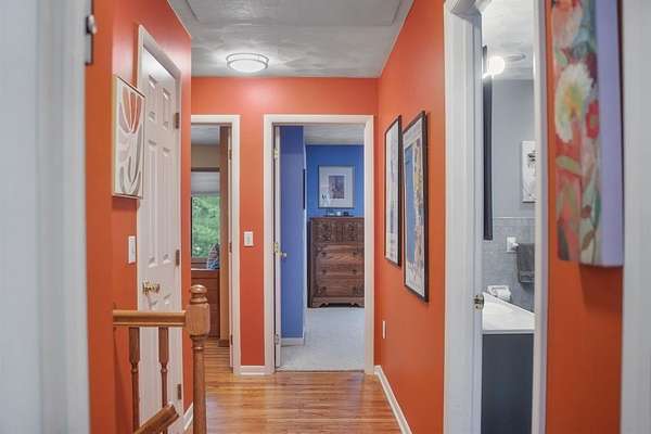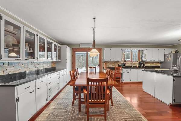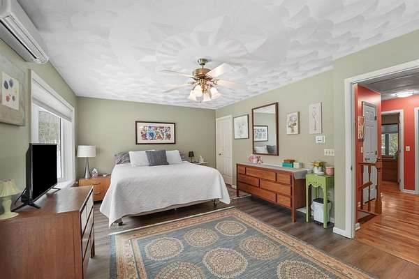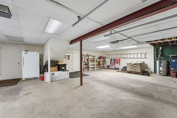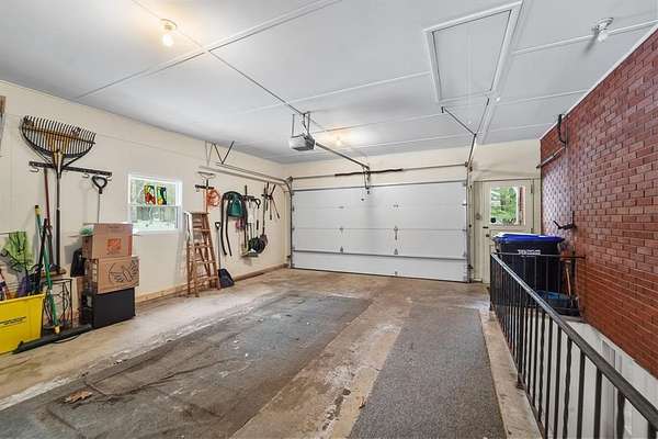 The eat-in kitchen is both functional and inviting, highlighted by Brazilian cherry hardwood floors, a center island, and ample space to gather. Storage is exceptional throughout, with generous closets, a dedicated workshop, and additional storage areas to keep everything organized. A half bath off the garage includes a built-in dog wash station for added convenience. Outdoor living is just as appealing with a covered front porch, back patio, and a private deck off the primary bedroom overlooking the expansive yard.