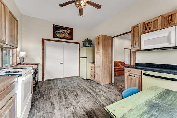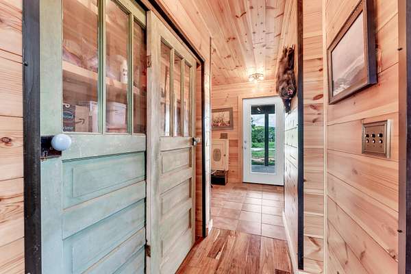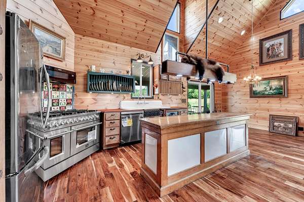 Discover 1820 Frank Rea Road, a one-of-a-kind home on 29 acres with breathtaking views and a story to tell. Part of the historic Elbow Ranch, once spanning over 5,000 acres, this property captures both heritage and artistry. All original artwork, taxidermy negotiable and indoor and outdoor furniture included. Designed and built by the owner, inspired by years in Australia, the home is a showcase of craftsmanship and character. A 10-foot wraparound porch welcomes you, accented by unique porch lights sourced from a Russian bakery and a British pub, hinting at the treasures inside. This steel-built residence includes its own 4-car garage and a private 1-bedroom apartment--perfect for guests, family, or rental income. Inside the main home, knotty pine walls and ceilings pair beautifully with LPV floors. Lighting fixtures with history--from Titanic-era cruise liners to Pullman dining cars--bring timeless charm. A cast iron and chrome parlor stove commands attention and is a wonderful piece that will warm up the space in the winter. The kitchen features a drain board sink with two faucets mounted within Karri wood countertops, an island crafted from Pennsylvania, church pew doors from Wales, and a stunning antique pipe organ transformed into lighting. A brand-new gas range with majolica English tile completes the space. Soaring ceilings in the living room, cooled by a dramatic propeller fan, create a bright, airy gathering space. The main-level primary suite faces south to capture rolling hill views, with a custom, green-tiled walk-in shower and a closet offering crawlspace access for storage or shelter. Upstairs, a loft bedroom which could easily be transformed into two rooms with a half bath and private balcony offers dreamy stargazing over the Milky Way. Outdoors, explore 29 acres with two ponds, hay fields, and wooded areas--perfect for farming, recreation, or simply enjoying nature.