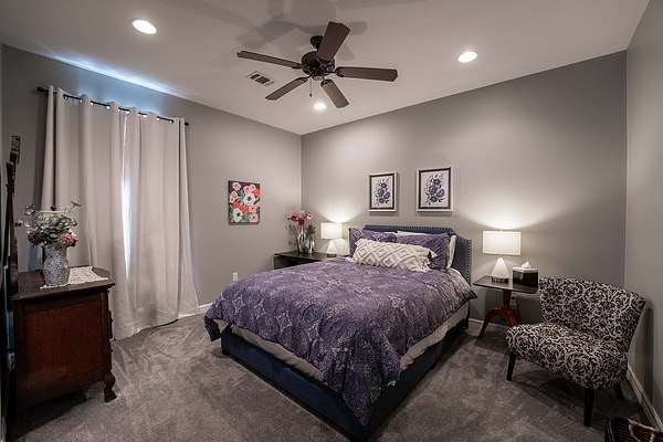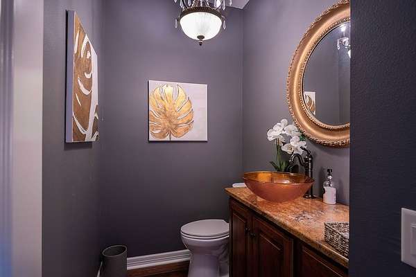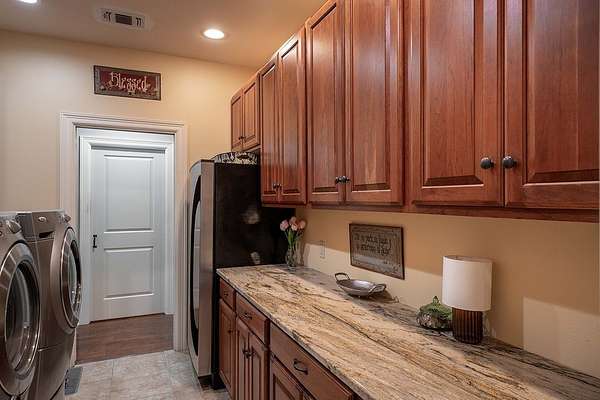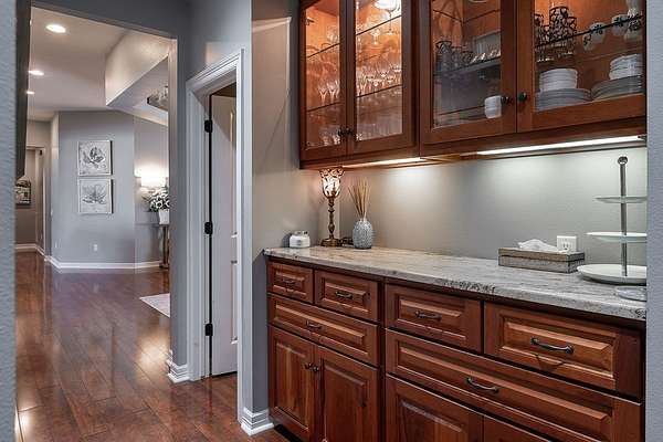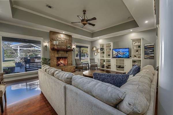 The gourmet kitchen showcases custom cabinetry with lighting, a large granite island, gas range, wall oven, and warming drawer all of which are GE profile, and flows seamlessly into the spacious family room highlighted by a stone gas fireplace. Additional interior features include a formal dining room, laundry room/butler?s pantry, and a dedicated craft room complete with a sink.