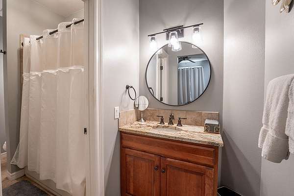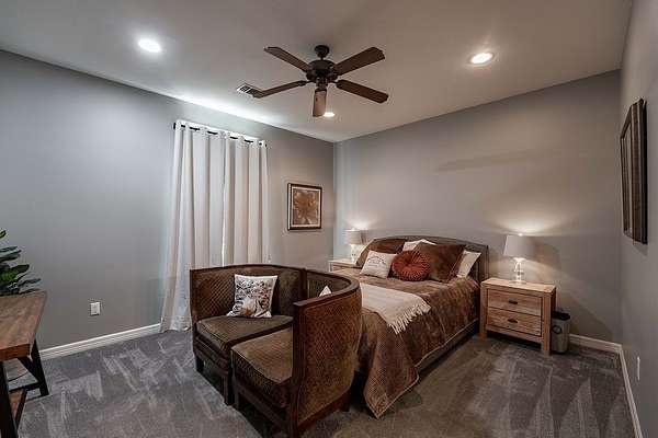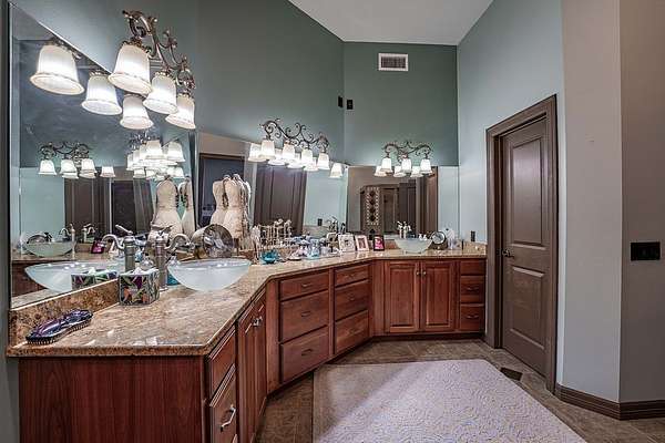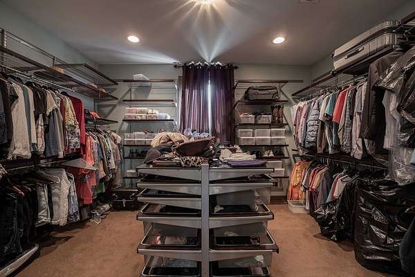 The expansive primary suite offers a bay-window sitting area, a spa-like bathroom with walk-in tile shower, large vanity with vessel sinks, jacuzzi soaking tub, and a generous walk-in closet equipped with an Elfa organization system.