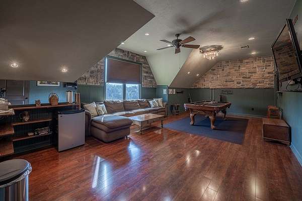 Upstairs, enjoy a large game room with a half bath; the pool table conveys. Outdoor living is equally impressive with a large Trex deck and covered entertainment area, perfect for gatherings.