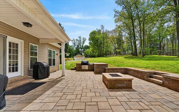 Step outside to an expansive outdoor living space with a built-in kitchen, perfect for hosting or enjoying the privacy of your own land.