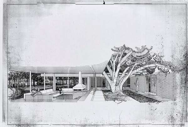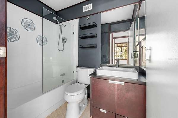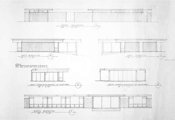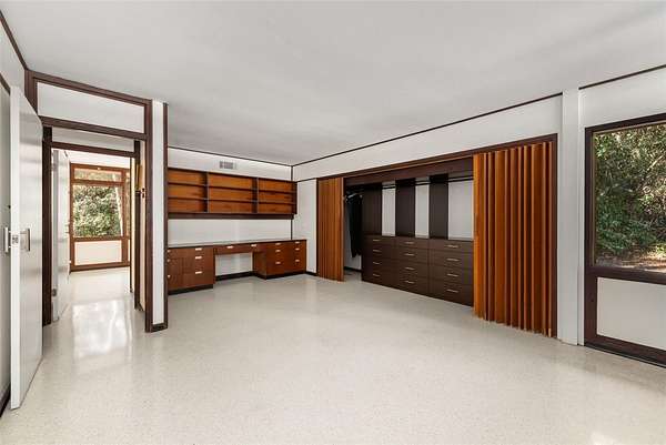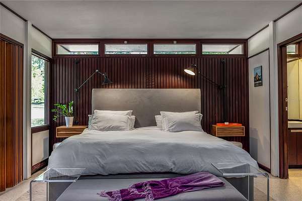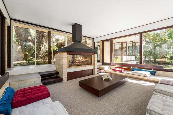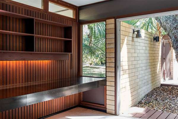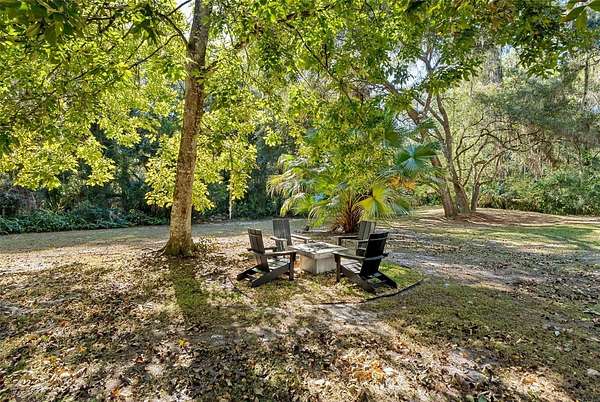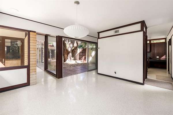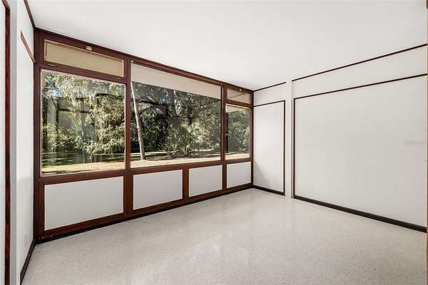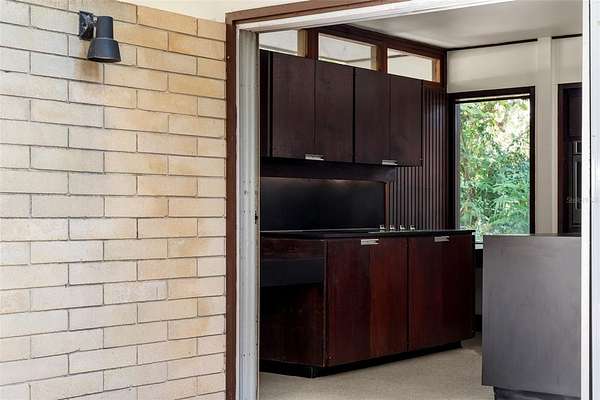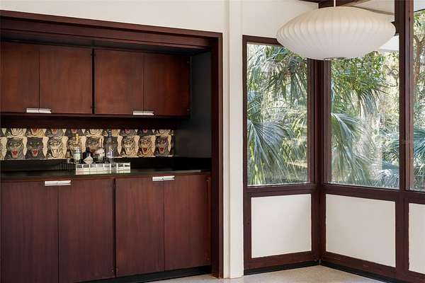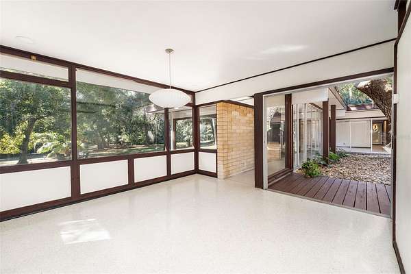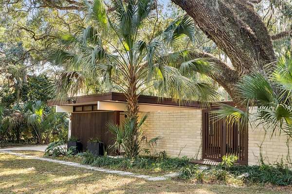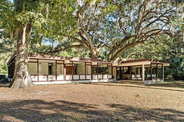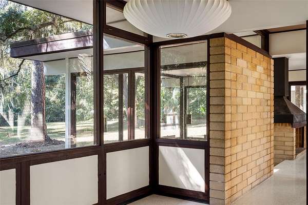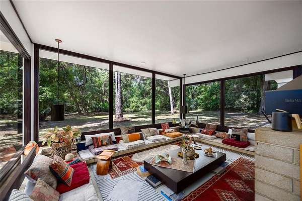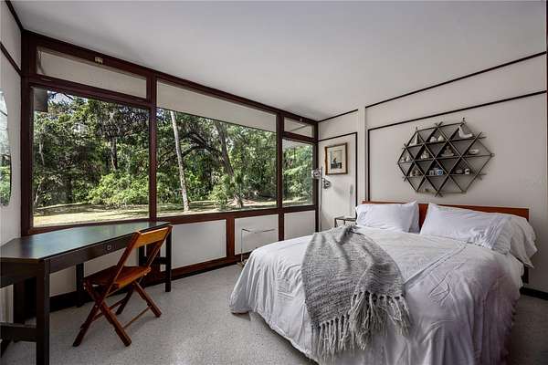 Welcome to the Haynes Residence--an iconic 1966 masterpiece by famed architect Harry Merritt, and arguably Gainesville's most pristine example of true Mid-Century Modern architecture. Now, this extraordinary property can be yours. In the spirit of Frank Lloyd Wright, Merritt designed homes that didn't simply sit within the landscape, but became part of it. Those sensibilities are on full display here: the exterior is wrapped in rich redwood siding, accented with Ocala block, and thoughtfully arranged around a breathtaking 350-year-old live oak. Walls of glass blur the lines between the nearly 2-acre sanctuary of a lot and the home's interior, creating a seamless dialogue with nature from every room. Designed by a professor of architecture and meticulously restored over the past four years by the Director of the University of Florida's School of Architecture, the home balances period authenticity with refined modern comfort. The kitchen is a warm, sophisticated showpiece featuring cabinetry crafted from the same wood used on the exterior, waterfall-edge countertops, designer geometric wallpaper, and an iconic Kelly Wearstler chandelier. A wall of sliding glass doors opens to an al-fresco dining space, reinforcing the home's effortless indoor-outdoor living. The dining room is anchored by a George Nelson bubble chandelier and a custom built-in bar wrapped in bold Gucci tiger-face wallpaper. Just beyond, the dramatic sunken living room takes center stage. With its bespoke metal-hooded Ocala-block fireplace, custom conversation-pit coffee table and pendant lighting, and 360 degrees of windows framing views of untouched forest, this space feels both sculptural and serene--an unforgettable architectural experience. The private wing of the home offers a second, more intimate living room, two spacious guest bedrooms, a fully renovated guest bath, a laundry room, and a beautiful home office that connects directly to the primary suite. The primary bedroom features a striking redwood accent wall, clerestory windows, a vanity area, and a full-length closet that, like the guest bedroom closets, incorporates a California Closets system and original redwood Pella accordion doors. Through the completely renovated primary bath, the office connects back to the main courtyard and features built-in shelving, under-cabinet lighting, and another full wall of sliding glass doors. Extensive upgrades ensure the home is as functional as it is beautiful: a new commercial-grade roof, restored eaves, updated electrical and plumbing systems, fresh paint, and meticulously restored terrazzo floors result in a residence that feels renewed, refined, and ready for its next steward. The home also includes two septic systems and a well with a water purification system. The property itself is serene, low-maintenance, and profoundly connected to its natural setting. The towering tree canopy, filtered light, and the quiet movement of wildlife create an atmosphere of privacy and peace rarely found so close to the heart of Gainesville. The Haynes Residence is more than a home--it is a work of art, an architectural treasure, and a living testament to timeless Mid-Century Modern design.