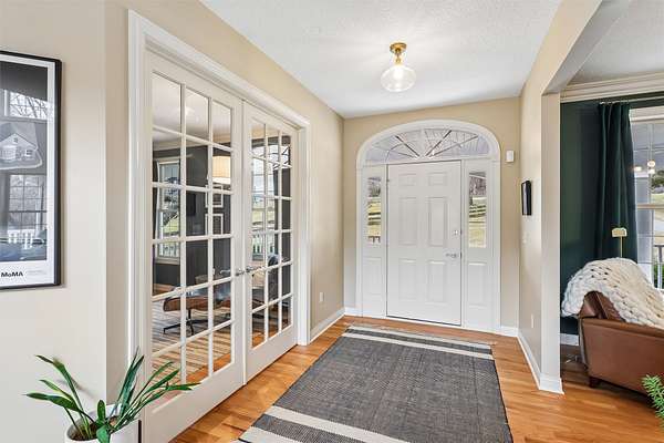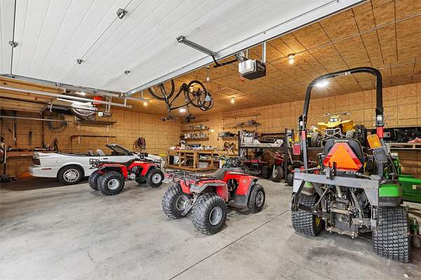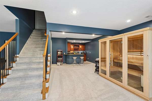 Set on a 2.8 acre wooded cul-de-sac lot, backing directly to Browns Woods Park, a vast 486 acre forest that offers hiking, cross-country skiing, dog walking, mushroom hunting, and wildlife viewing. This updated walk-out 1.5 story home has 4,734 SF finished, 5 BRs with first floor primary BR and 6 baths. There is a heated 30'x 60' detached garage that is great for an automotive hobby. The main floor has hardwood floors, a private work-from-home office, a living room that would make a second office, 2-story great room with gas fireplace with built-ins, eat-in kitchen with walk-in pantry, white cabinets, quartz counters, stainless steel appliances & island, primary bedroom with walk-in closet, primary bath with two sinks, whirlpool tub, tile shower with two heads; half bath, mud room and laundry room. The second floor has 3 more BRs & 2 baths. The walk-out basement has a 5th BR, 1.5 baths, large family room, rec room with walk-behind wet bar and unfinished exercise room. There is a full-length deck and covered patio. Heated and cooled with economical geothermal. The Midamerican Energy monthly average is $237. This in-town acreage has everything you want; country living with a convenient location. See it today.