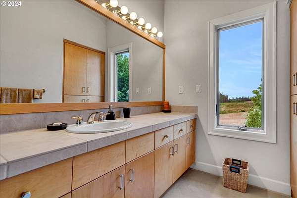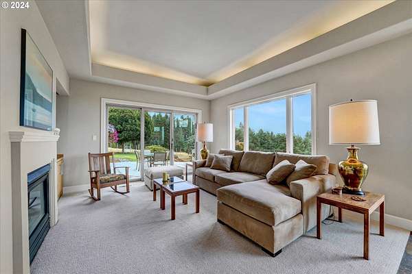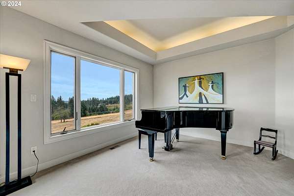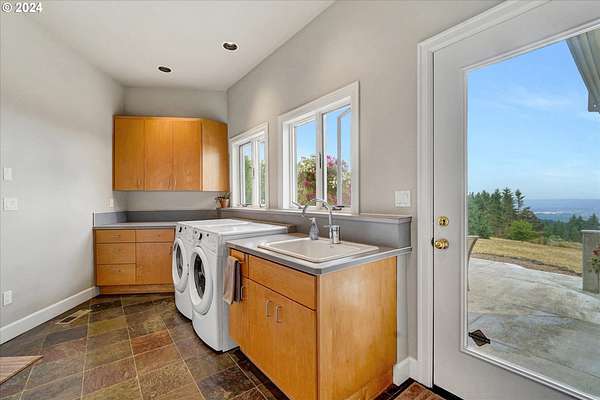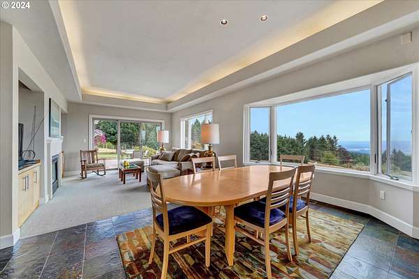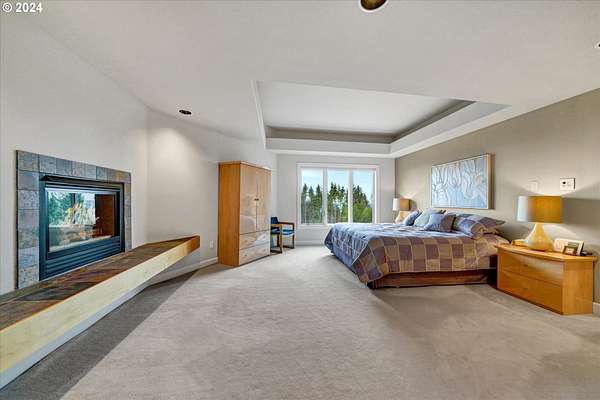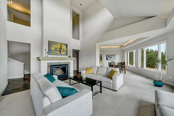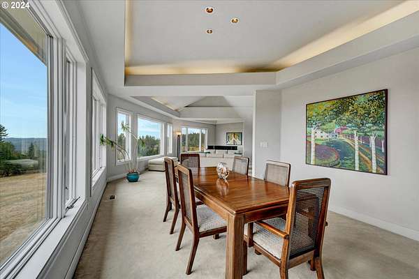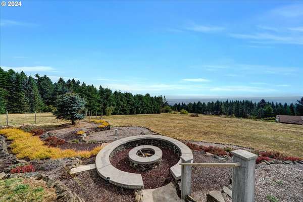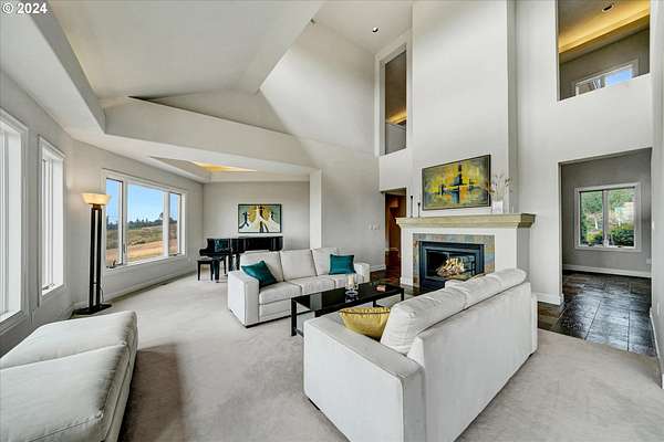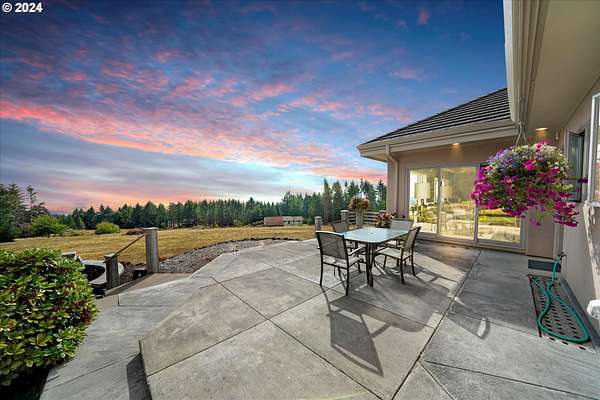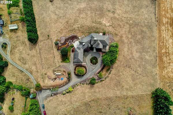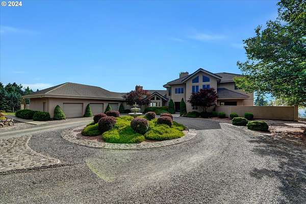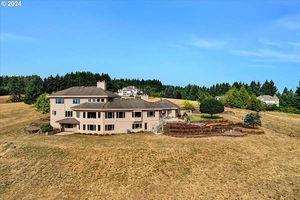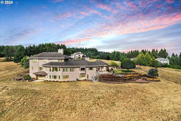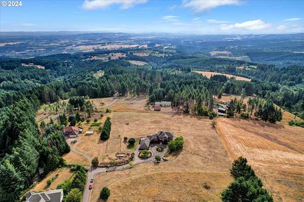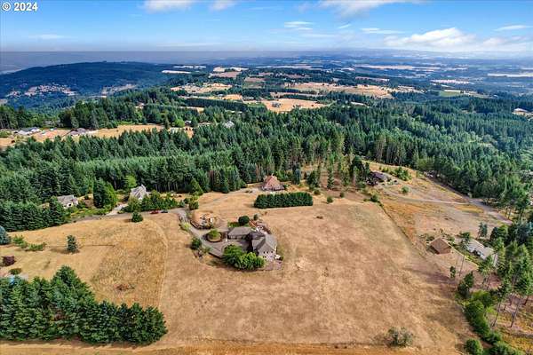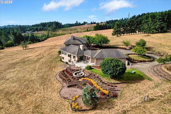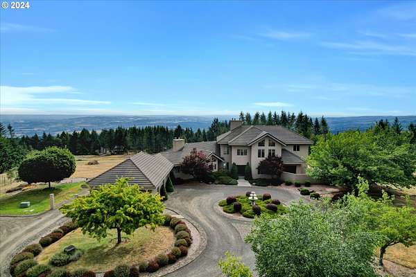 Wine country in Yamhill County on Bald Peak with a panoramic 5 mountain VIEW! This home has been updated and well maintained. On 5.73 mostly level acres in Sunrise Peaks Estates, this amazing property won't disappoint. At the end of the paved street through the gate opening follow the circular driveway and hear the soft sounds of the fountain. From the moment you enter in through the stained glass front door into the grand two story entrance, with a curved staircase, light abounds. The formal living room has a view of the valley, trees & mountains, a high ceiling + a dramatic fireplace. The formal dining room features indirect lighting & room for family gatherings or entertaining guests. The newly updated kitchen has granite countertops, a large island, stainless steel appliances, both a butler's pantry & a walk-in pantry. There is an informal eating area with a bay window. The kitchen opens to the family room. There's a fireplace in the family room, & a slider to the BBQ patio & the fire pit below. Spend cool evenings gathered around the wood burning fire pit gazing out at the view. There's a fenced garden area so the deer won't nibble. Back inside the primary suite is on the main level and features a fireplace, built-ins, and a spa like bath with a jetted tub, separate shower, a huge walk-in closet and double sinks framed by travertine marble. Plus there's an outdoor patio off the hall to enjoy a morning beverage. There's an opportunity for multi-generational living with a full bath & bedroom on each of the three levels. The daylight basement offers a party room, wet-bar and mini fridge, a door to the outdoor patio, a wine cellar, the 4th bedroom and a substantial sized office or 5th bedroom, complete with double closets and walk out patio. Upstairs is the library reading loft, two bedrooms, and a Jack & Jill bath. Oversized attached 3-car garage with overhead storage. This is the one you've been waiting for!