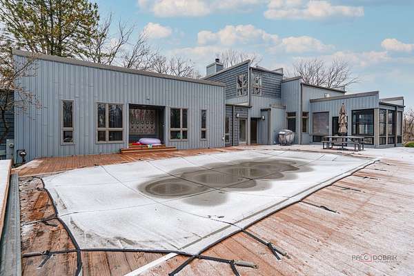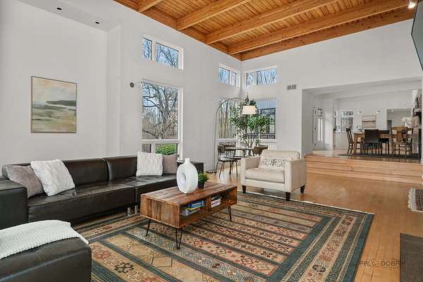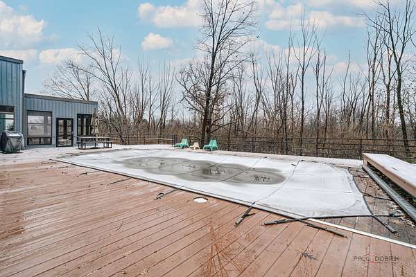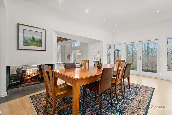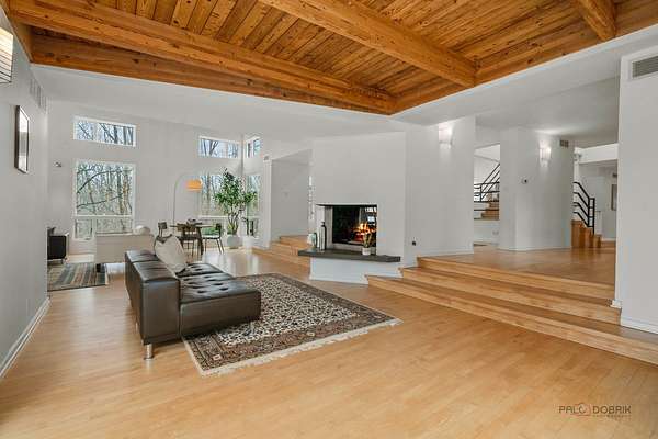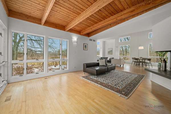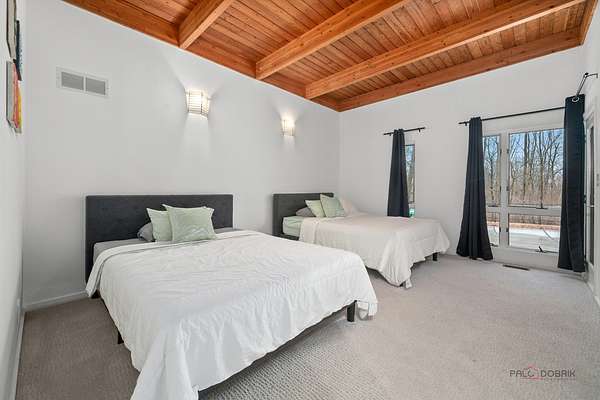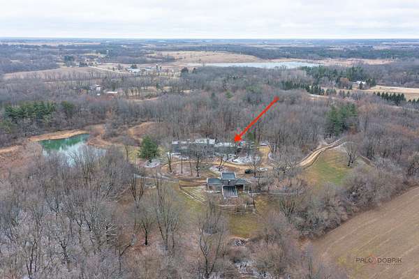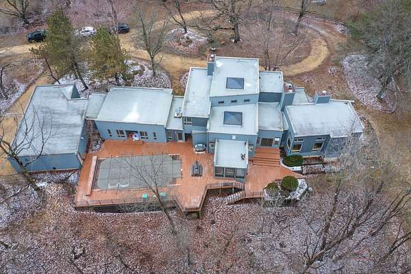 Welcome to this extraordinary 5-bedroom, 4-bathroom retreat nestled on a breathtaking, nature-surrounded 25-acre lot. Offering a rare blend of luxury, privacy, and resort-style living, this exceptional property features a private pond, tranquil forest views, and a sparkling in-ground pool-creating the ultimate escape just minutes from town conveniences. A dramatic two-story wood-beamed ceiling with skylights fills the home with natural light, seamlessly blending indoor elegance with the beauty of the outdoors. To the left of the foyer, a spectacular great room unites the living and family rooms. Walls of windows frame stunning pond views, while two fireplaces-one in the family room and a striking multi-sided fireplace shared between the living and dining areas-add warmth and architectural distinction. The dining area opens directly to an expansive deck, ideal for effortless indoor-outdoor entertaining. The gourmet kitchen is a true showpiece, highlighted by a luxurious oversized marble waterfall island with breakfast bar seating, a spacious pantry closet, and abundant cabinetry. Soaring wood-beamed ceilings and skylights enhance the bright, modern aesthetic, while direct access to the screened porch makes al fresco dining and seasonal relaxation a delight. A conveniently located first-floor laundry closet adds everyday ease. Designed with entertaining and poolside living in mind, a full bath on the main level offers direct access to the in-ground pool-perfect for guests and post-swim convenience. Down the hallway, two generously sized bedrooms share a Jack-and-Jill bath, each with access to the pool area for a seamless indoor-outdoor lifestyle. Upstairs, a stunning loft welcomes you with skylights, a private balcony, and a fireplace-an inviting space that captures panoramic nature views. The loft leads to the primary suite, featuring a spa-inspired ensuite with a soaking tub, separate shower, and expansive windows overlooking peaceful scenery. A second bedroom completes the upper level, which can easily function as an expansive private primary retreat if desired. The fully finished basement further expands the living space with a large recreation room, fifth bedroom, full bath, and walk-up access to the garage-offering privacy and flexibility for guests or extended family. This remarkable home delivers the perfect balance of refined luxury and natural beauty-an exceptional opportunity for buyers seeking a private retreat, vacation-style living, and a peaceful escape from the city.
