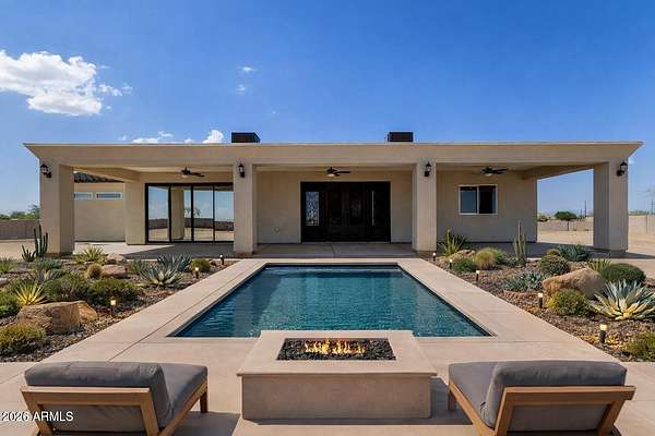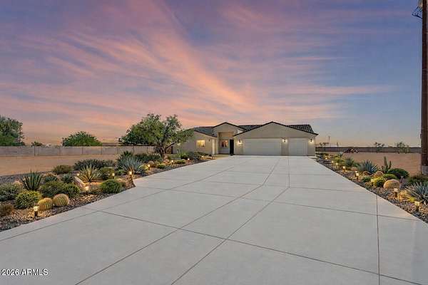 SELLER IS WILLING TO OFFER RATE BUY-DOWN, LANDSCAPING CREDIT, OR CLOSING COST INCENTIVES!! Welcome to an extraordinary new construction estate set on more than TWO ACRES in the peaceful desert landscape of Surprise. This is where wide open skies, mountain silhouettes, and refined modern living come together in one unforgettable property. From the moment you arrive, the scale and presence of this home command attention. A long private approach leads to a sprawling residence designed for both grand entertaining and everyday comfort. Inside, soaring vaulted ceilings and expansive sightlines create an immediate sense of openness. Natural light pours through oversized windows, illuminating rich flooring, elevated finishes, and a layout that feels both intentional and effortless. At the center of the home, the kitchen is designed to impress. Quartz surfaces, custom cabinetry, premium stainless appliances, and an oversized island anchor the space, making it equally suited for intimate dinners or hosting on a larger scale. A generous walk in pantry adds function without sacrificing style. The primary suite is a true retreat. Spacious and private, it offers direct access to the outdoors and a spa inspired bath complete with dual vanities, a soaking tub, a beautifully appointed walk in shower, and a large custom closet. Additional bedrooms provide flexibility for guests, multigenerational living, or a dedicated office space. Step outside and the potential expands even further. The full length covered patio frames sweeping mountain views and endless Arizona sunsets. With over two acres of land, there is room to create a resort style pool, guest casita, RV garage, equestrian amenities, or simply preserve the privacy and space that make this property so rare. Set against the natural beauty of the desert yet within convenient reach of shopping, dining, golf, and freeway access, this home offers the best of both worlds. Space. Scale. Privacy. Possibility. Opportunities with this much land, this level of finish, and this kind of setting do not come around often. This is more than a home. It is your chance to own a piece of Arizona sky.
