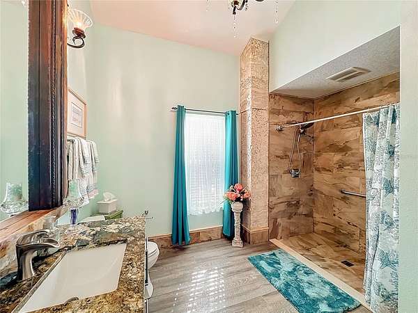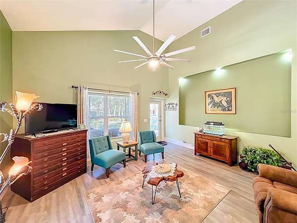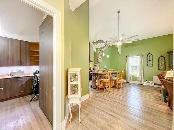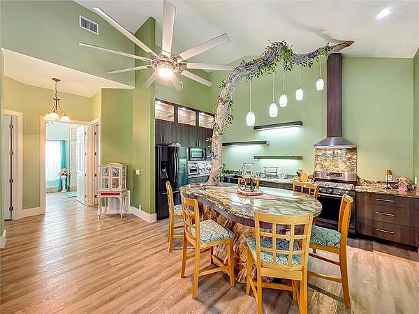 Inside, the open-concept great room and kitchen are highlighted by soaring ceilings, luxury vinyl plank flooring, and abundant natural light. The chef's kitchen features custom cabinetry throughout, granite countertops, and an oversized island with a one-of-a-kind custom tree centerpiece, creating a true conversation piece and focal point for entertaining. The kitchen flows seamlessly into the dining and living areas, perfect for gatherings both large and intimate.