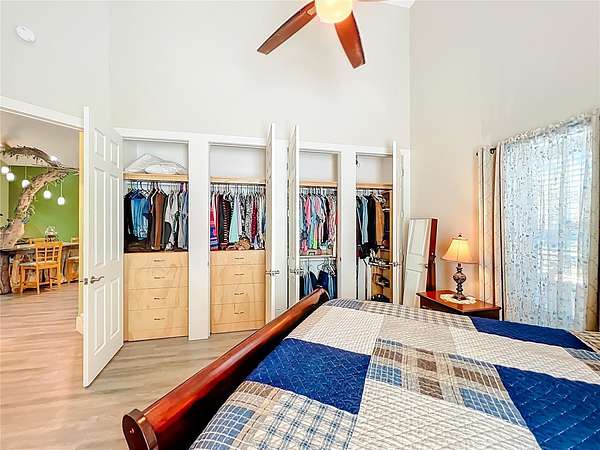 - Built-In Features, Ceiling Fans(s), High Ceilings, Kitchen/Family Room Combo, Open Floorplan, Primary Bedroom Main Floor, Solid Wood Cabinets, Stone Counters, Window Treatments