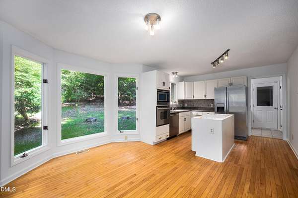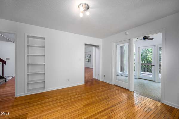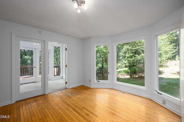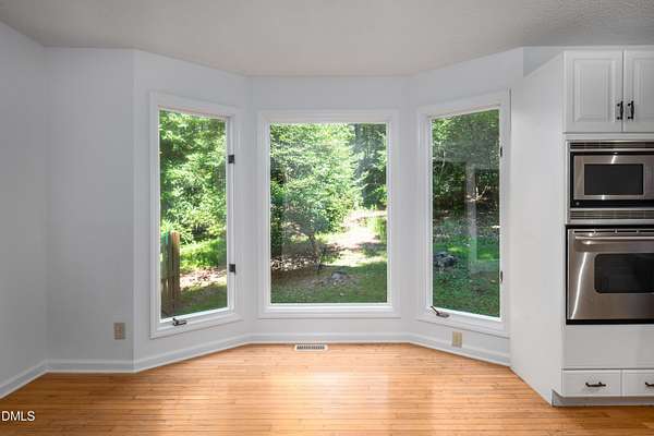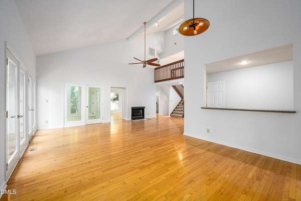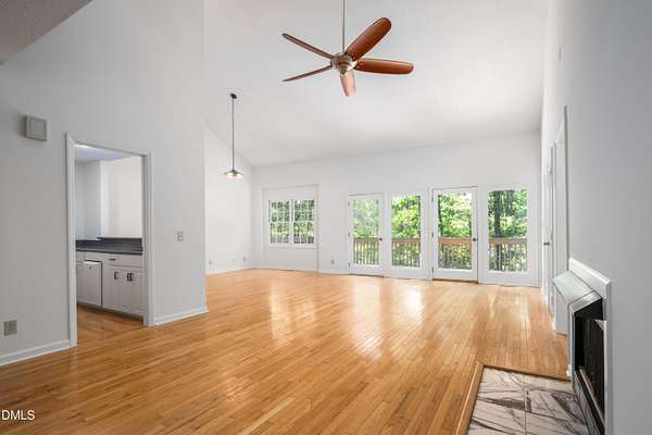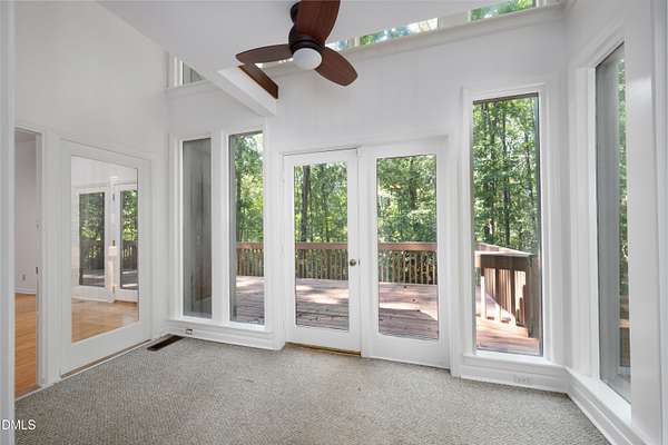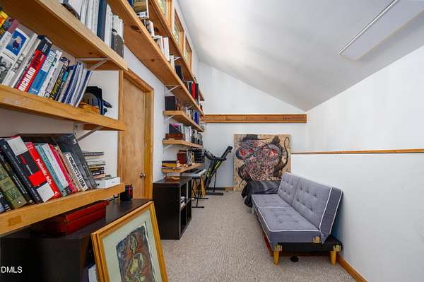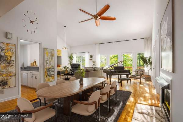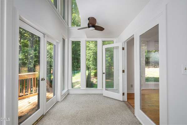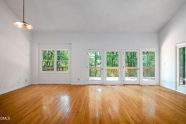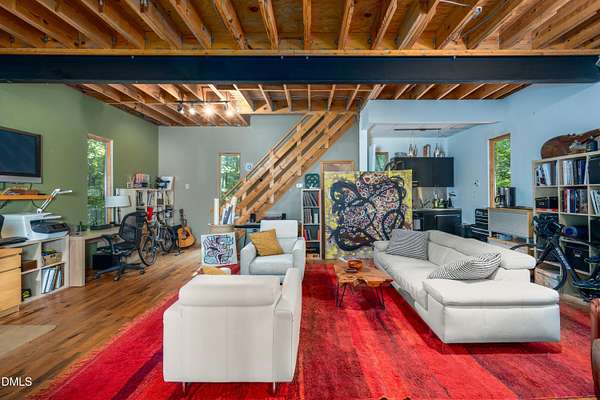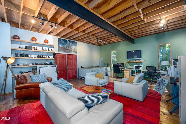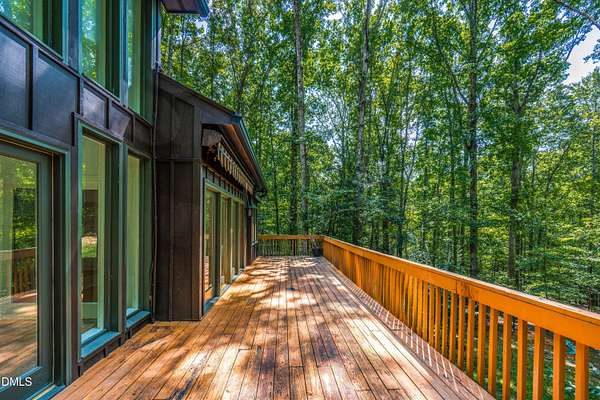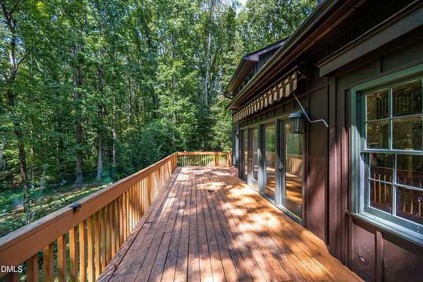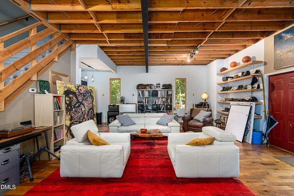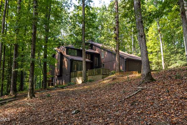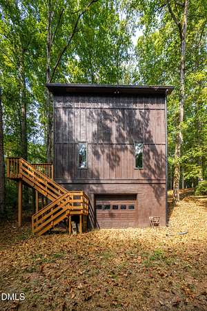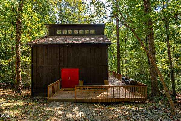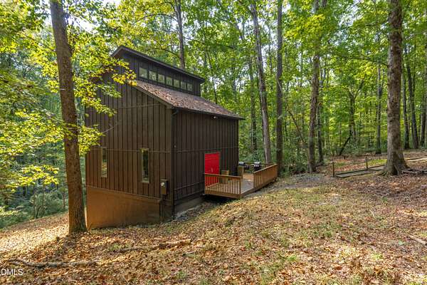 Scarce opportunity to move into the sought-after Redbud community of Pittsboro! This contemporary 2283 sq. ft. 3BR/3BA home is nestled on a 5.27 acre lot offering privacy with abounding nature. Upon entering you'll notice the unique open layout of the main level living space boasting soaring ceilings, tons of windows, fireplace, pass through wet bar serving room with cabinetry, sink and mini fridge. The interior has just been freshly painted neutrally providing a blank canvas for the new owners personal design vision. Light-filled sitting room off the kitchen opens to an expansive back deck, fenced backyard, great for entertaining and enjoying outdoors. There is a first floor bedroom as well as full bath. Upstairs you'll find the primary bedroom with fireplace, sitting room and en suite bath. Third bedroom on second level also has full bath. The separate finished studio building invites endless possibilities. Imagine artist gallery, hobby workshop, home gym or office in this additional 940 sq.ft. of finished space, there's also another garage below. Redbud has a serene atmosphere, beautiful trees and abundant wildlife. Residents can also enjoy the community lake. The neighborhood borders the Haw River and is minutes from Jordan Lake, downtown Pittsboro as well as Chatham Park. Schedule an appointment to view before it's gone!