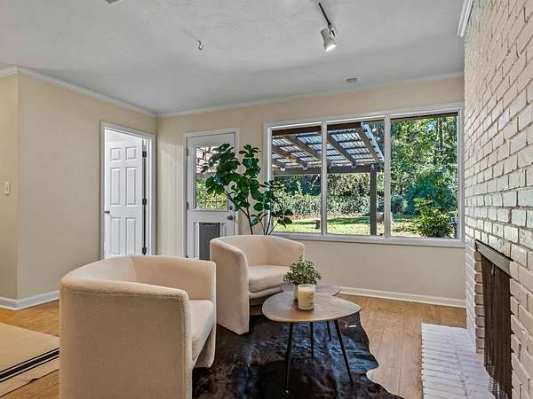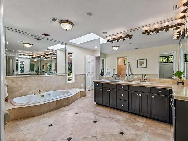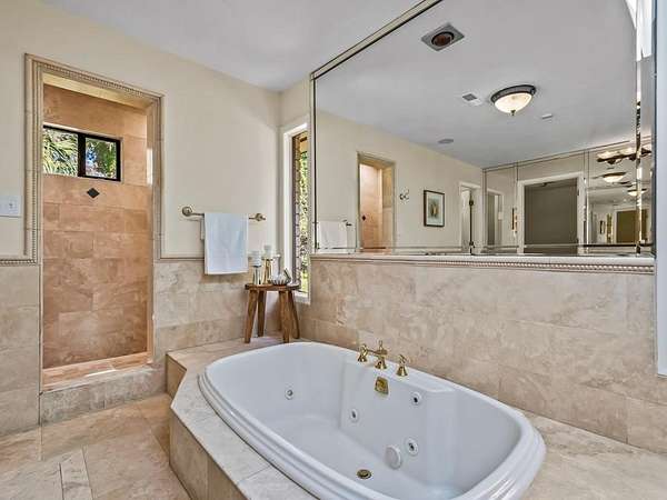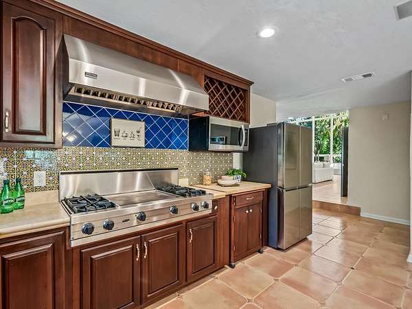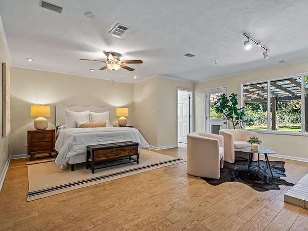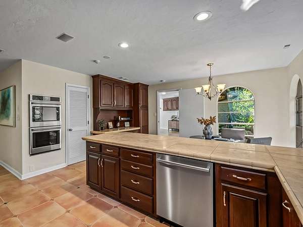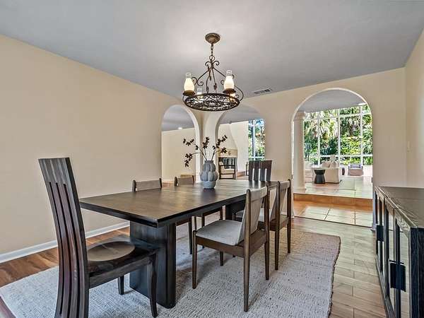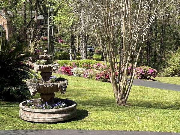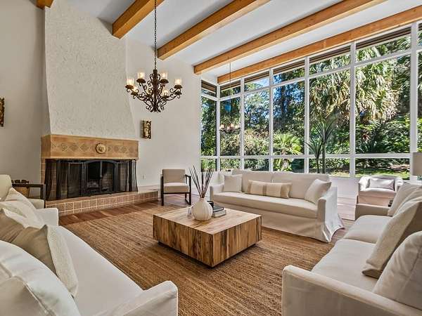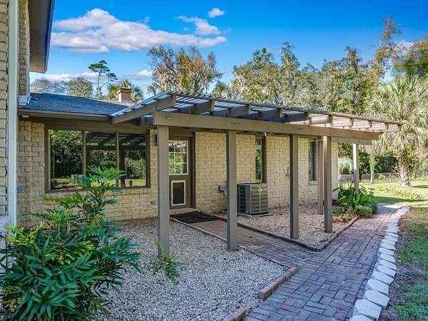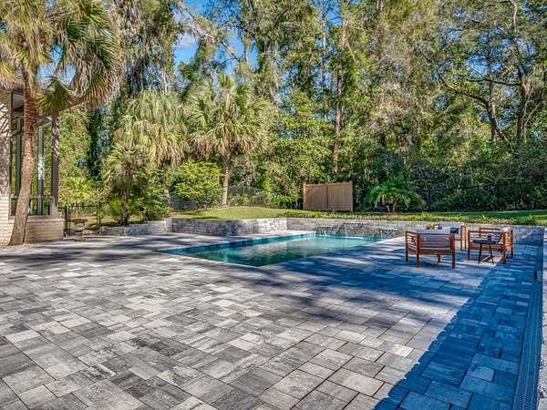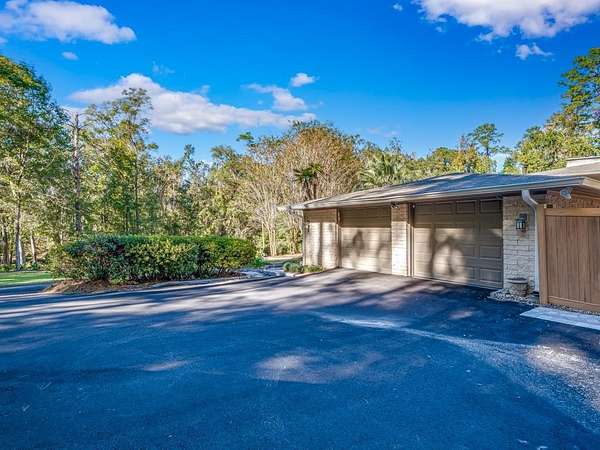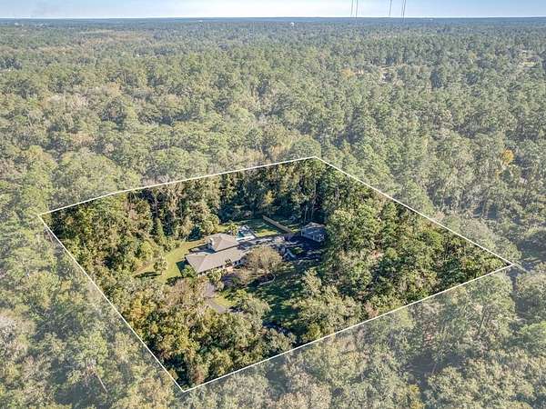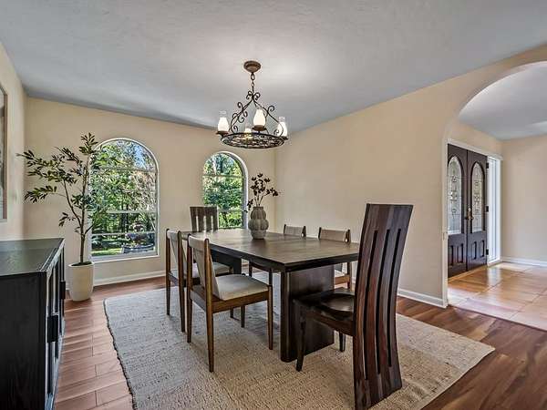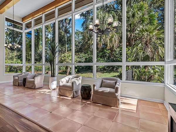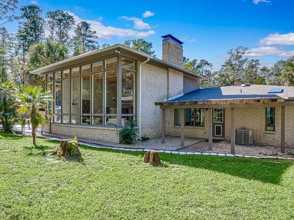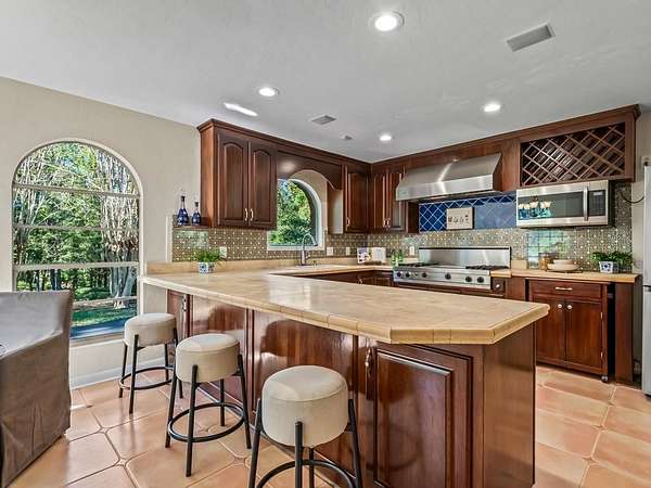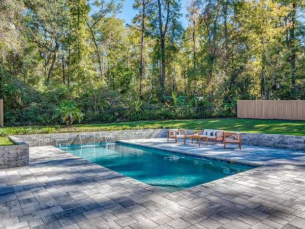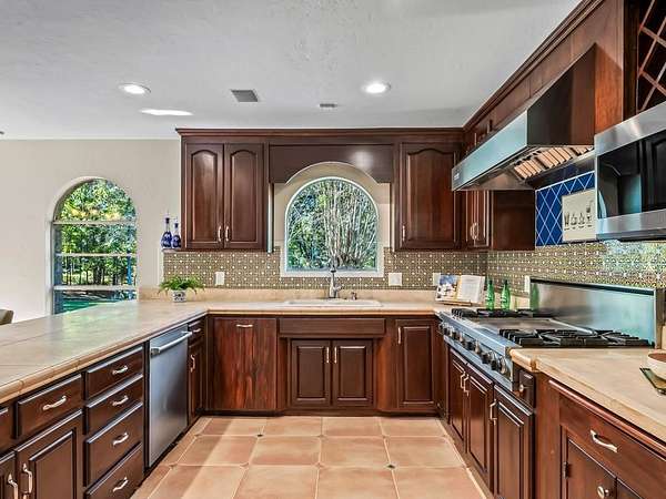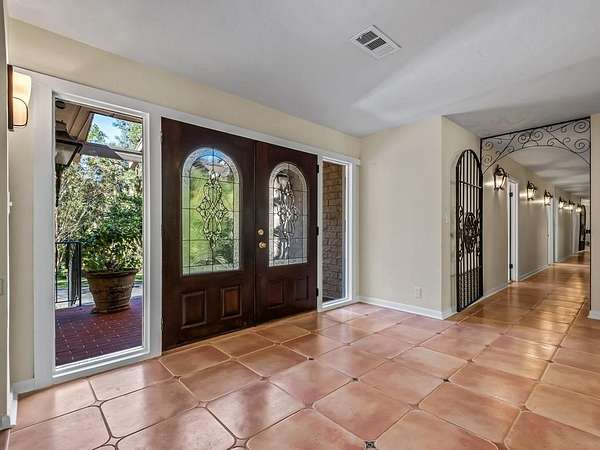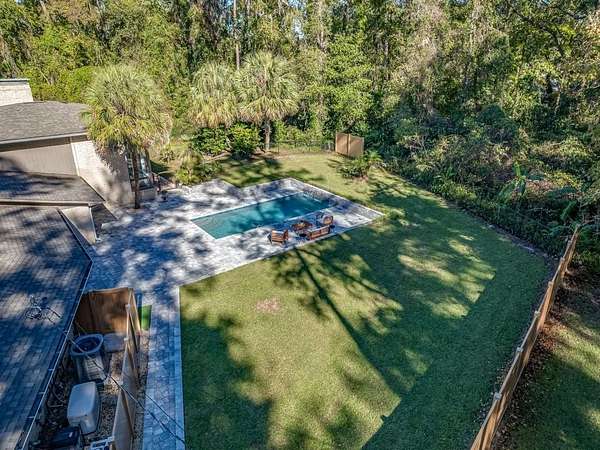 Nestled on two thoughtfully manicured, wooded acres, this beautiful 3-bedroom, 3-bath Mediterranean-style ranch (with a flex space that could be used as a 4th bedroom) creates the perfect blend of luxury and tranquility. This impressive home offers the ambiance of a private resort, showcasing a luxurious backyard oasis designed for relaxation and entertainment. At its heart is a newly installed (2023), heated saltwater pool featuring a triple waterfall, vibrant multi-colored LED lighting, and serene underwater illumination. The pool is complemented by an expansive patio, curating the space for a picturesque retreat and the ultimate outdoor entertainment area. Enveloped by lush, tropical landscaping and a fenced backyard with privacy fencing, this property extends the tranquility of a secluded wooded sanctuary. Step inside to discover nearly 4,000 sq. ft. of thoughtfully designed elegant living space. The grand living room, spanning almost 1,000 sq. ft., is a showstopper with its soaring 15-foot vaulted ceilings, a large, brick fireplace, and floor-to-ceiling windows that frame picturesque views of a hardwood and tropical backyard paradise. The kitchen is both stylish and functional, featuring a cozy breakfast nook, a premium Viking natural gas range, and other new and recently updated, high-end appliances. Throughout the home, you'll find a blend of classic terracotta tile, new luxury vinyl plank flooring, and plush new carpeting. Practical features include a 2-car garage with resurfaced flooring and an additional 3-car carport, both of which offer attached utility and storage rooms, a new roof with architectural shingles, and two newly installed HVAC systems and a recently installed Generac whole house generator. This home truly has it all-style, comfort, and functionality-set in an idyllic private setting. Don't miss your chance to call this retreat your own!