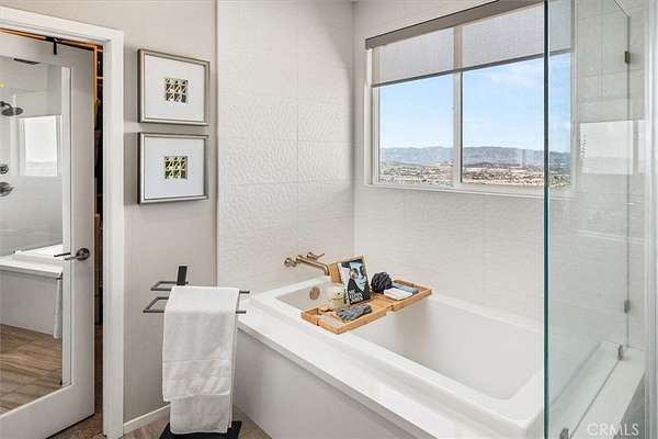 The luxurious primary suite offers a private retreat with unobstructed views from a covered balcony. The spa-style ensuite bathroom includes dual sinks, soaking tub, walk-in shower, and a spacious custom walk-in closet with built-in storage.
