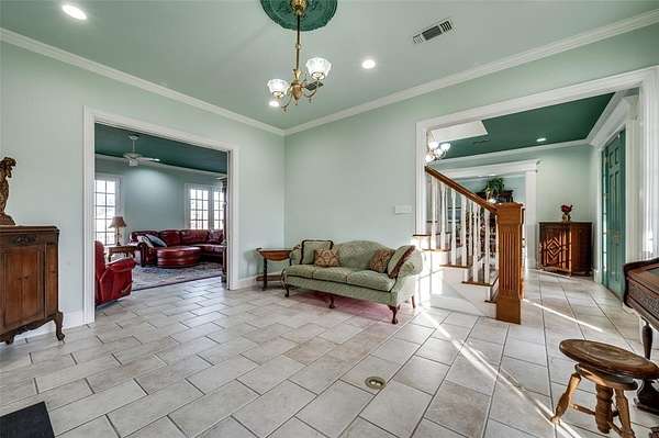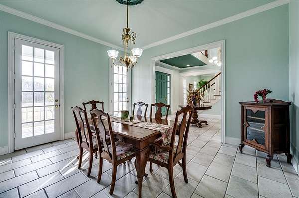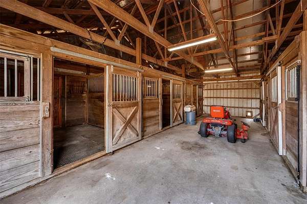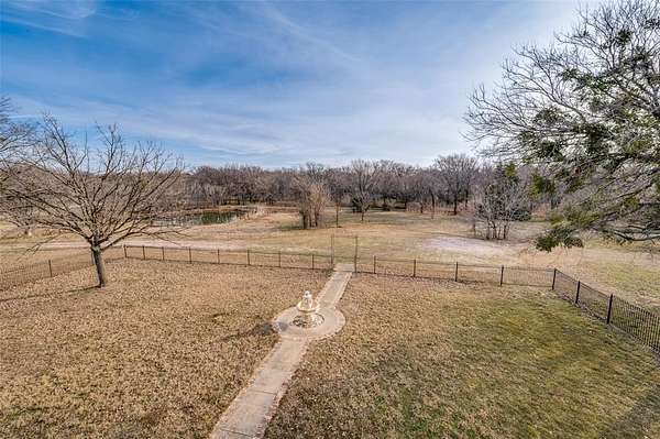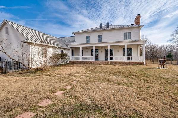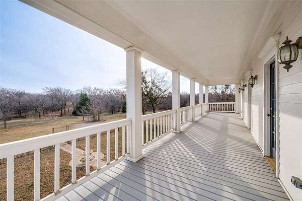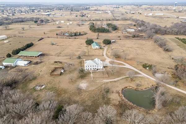 Stunning gated Southern Colonial estate set on 21.6+- private acres in Denton County, nestled within the sought-after Prairie Acres community and ideally located between Little Elm, Providence Village, Cross Roads, and Aubrey. Set nearly one-eighth mile off the road, this impeccably maintained property offers exceptional privacy, timeless architecture, and refined rural living. Meticulously designed to reflect classic antebellum colonial styling, the home features three spacious bedrooms, a dedicated office or optional fourth bedroom, and three and a half baths. Three beautiful fireplaces anchor the thoughtfully designed interior, while sweeping views from every window, door, porch, and balcony bring the surrounding landscape indoors. The light-filled interior offers an inviting chef's kitchen with breakfast area, sizable pantry, and dumbwaiter, along with two elegant living areas and a formal dining room ideal for entertaining. Generous storage, an expansive mudroom, and a well-appointed laundry room add everyday functionality. The home's classic appeal is further enhanced by a standing-seam metal roof and fenced front and backyard spaces. The agricultural and wildlife exemption supports livestock, hay production, and abundant wildlife, with regular sightings of whitetail deer and waterfowl drawn to the stocked pond and seasonal creek. Native pecan, oak, and elm trees create a picturesque, park-like setting. Equestrian and hobby amenities include an impressive eight-stall barn with tack room, stocks, and ample storage, four loafing sheds, a chicken house, and designated garden area. Additional improvements include a 50' x 50' shop and a 40' x 25' workshop. The property is fully fenced and cross-fenced for versatility and ease of use. A rare opportunity offering peaceful country privacy with convenient access to city amenities -- truly an exceptional estate for those seeking elegance, functionality, and space to live fully.
