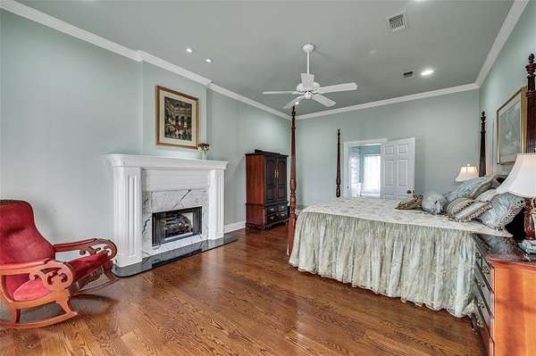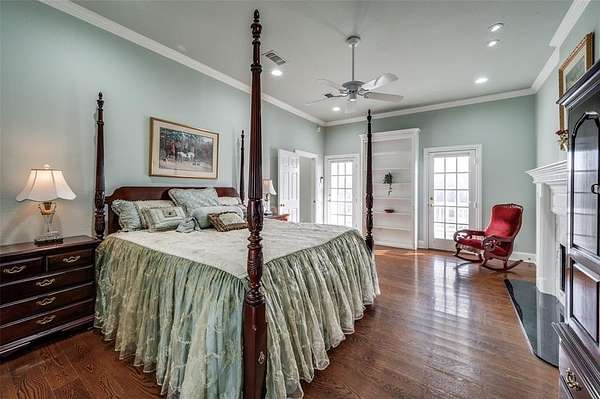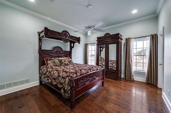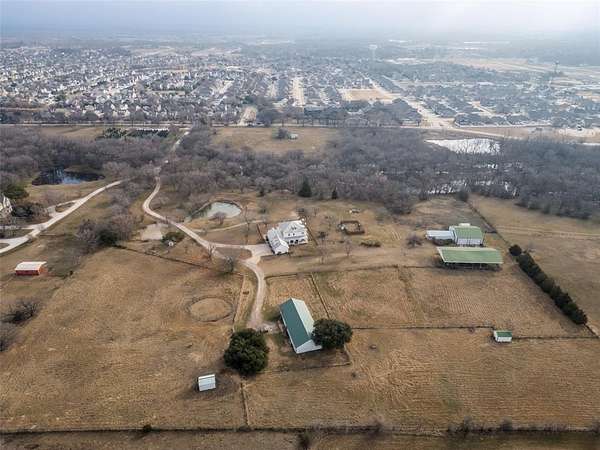 Stunning gated Southern Colonial estate set on 21.6± private acres in Denton County, nestled within the sought-after Prairie Acres community and ideally located between Little Elm, Providence Village, Cross Roads, and Aubrey. Set nearly one-eighth mile off the road, this impeccably maintained property offers exceptional privacy, timeless architecture, and refined rural living. Meticulously designed to reflect classic antebellum colonial styling, the home features three spacious bedrooms, a dedicated office or optional fourth bedroom, and three and a half baths. Three beautiful fireplaces anchor the thoughtfully designed interior, while sweeping views from every window, door, porch, and balcony bring the surrounding landscape indoors. The light-filled interior offers an inviting chef’s kitchen with breakfast area, sizable pantry, and dumbwaiter, along with two elegant living areas and a formal dining room ideal for entertaining. Generous storage, an expansive mudroom, and a well-appointed laundry room add everyday functionality. The home’s classic appeal is further enhanced by a standing-seam metal roof and fenced front and backyard spaces. The agricultural and wildlife exemption supports livestock, hay production, and abundant wildlife, with regular sightings of whitetail deer and waterfowl drawn to the stocked pond and seasonal creek. Native pecan, oak, and elm trees create a picturesque, park-like setting. Equestrian and hobby amenities include an impressive eight-stall barn with tack room, stocks, and ample storage, four loafing sheds, a chicken house, and designated garden area. Additional improvements include a 50’ x 50’ shop and a 40’ x 25’ workshop. The property is fully fenced and cross-fenced for versatility and ease of use. A rare opportunity offering peaceful country privacy with convenient access to city amenities — truly an exceptional estate for those seeking elegance, functionality, and space to live fully.